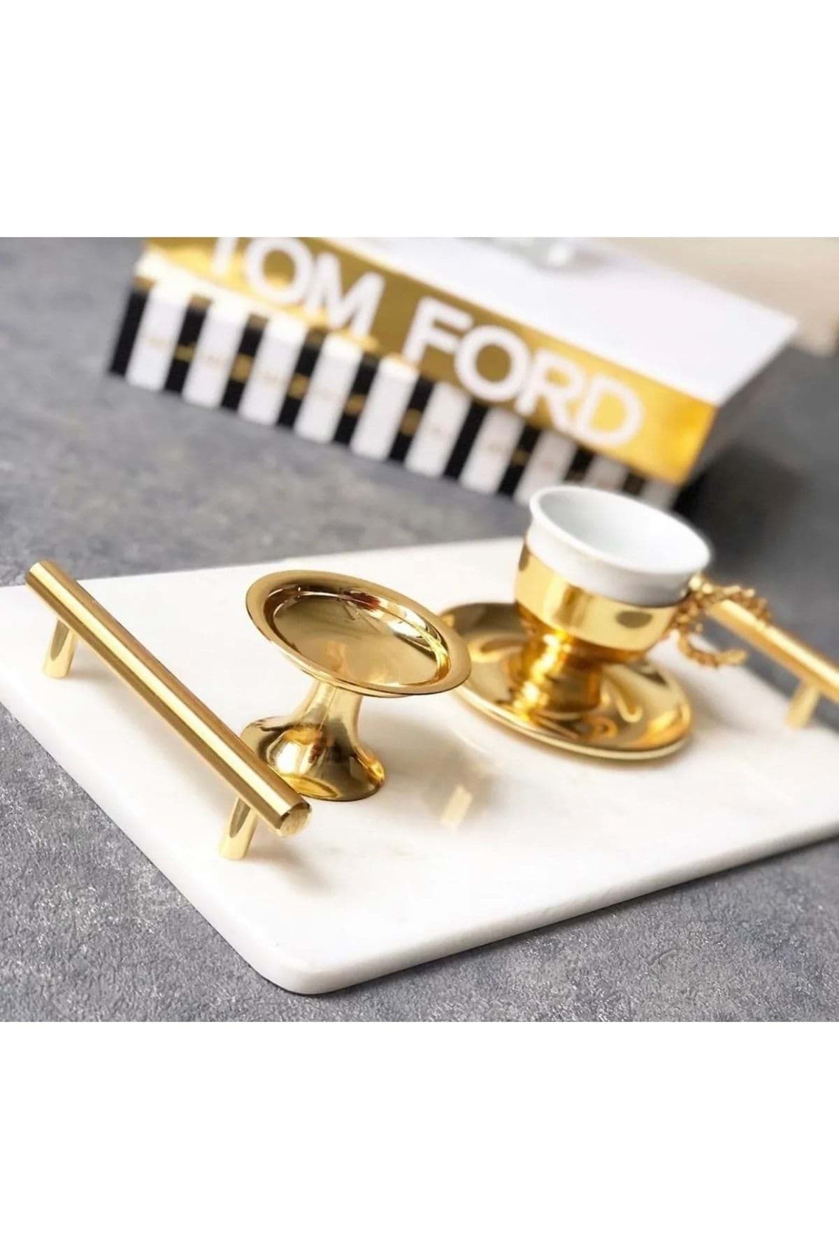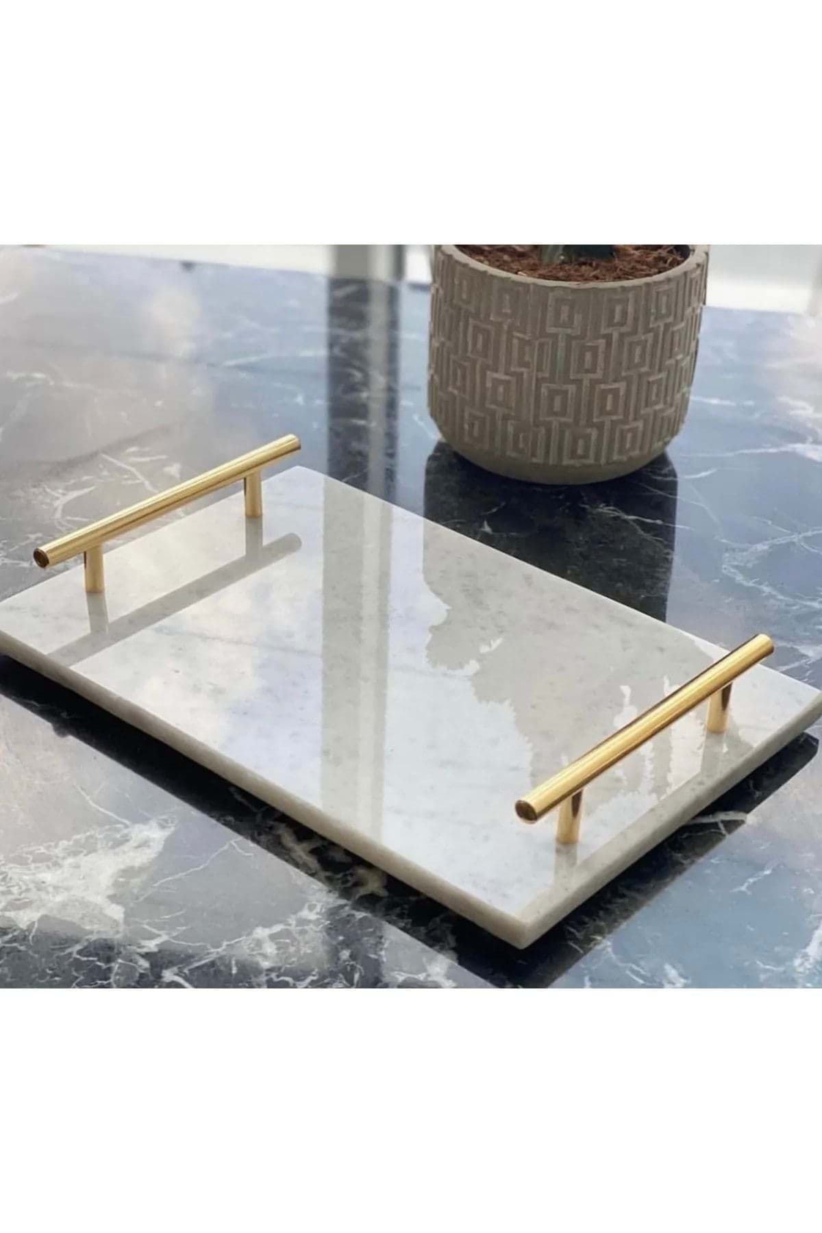 • Dekoratıf Beyaz Mermer Dıkdortgen Sunum Nısan Tepsısı Kulplu resmi