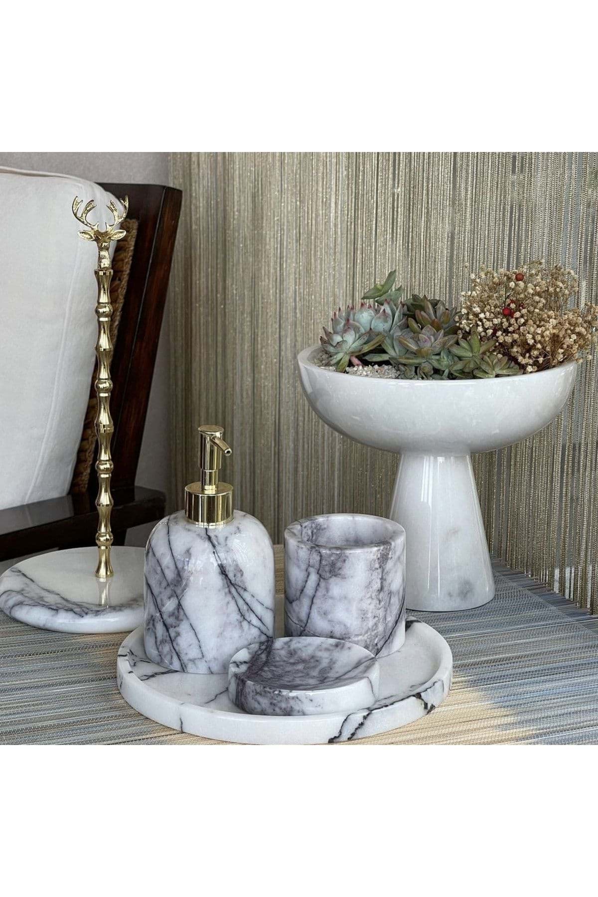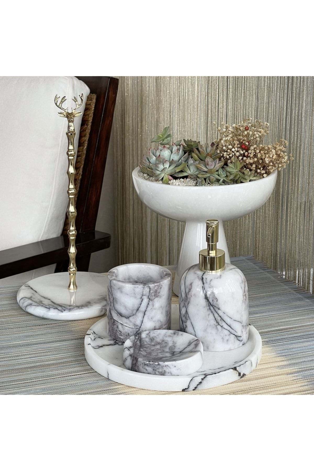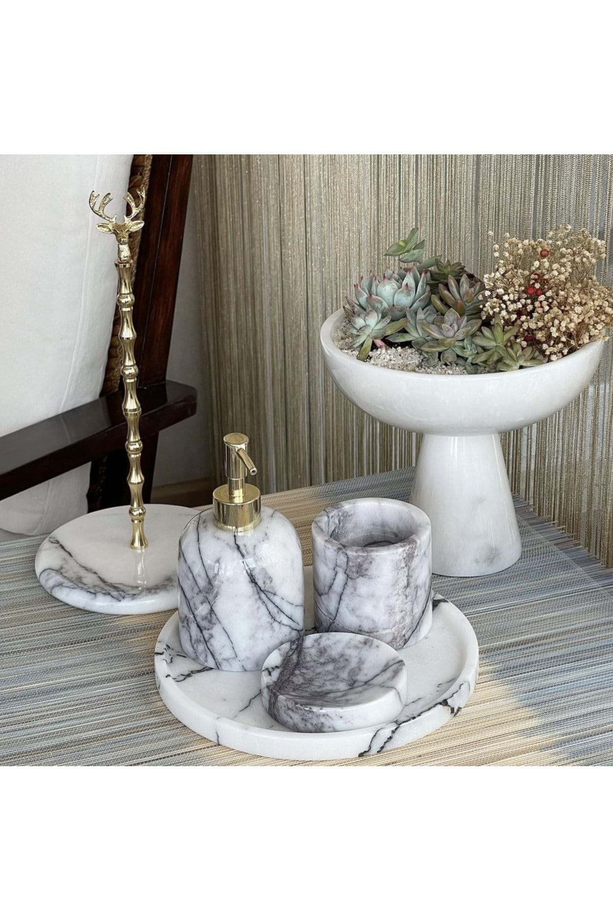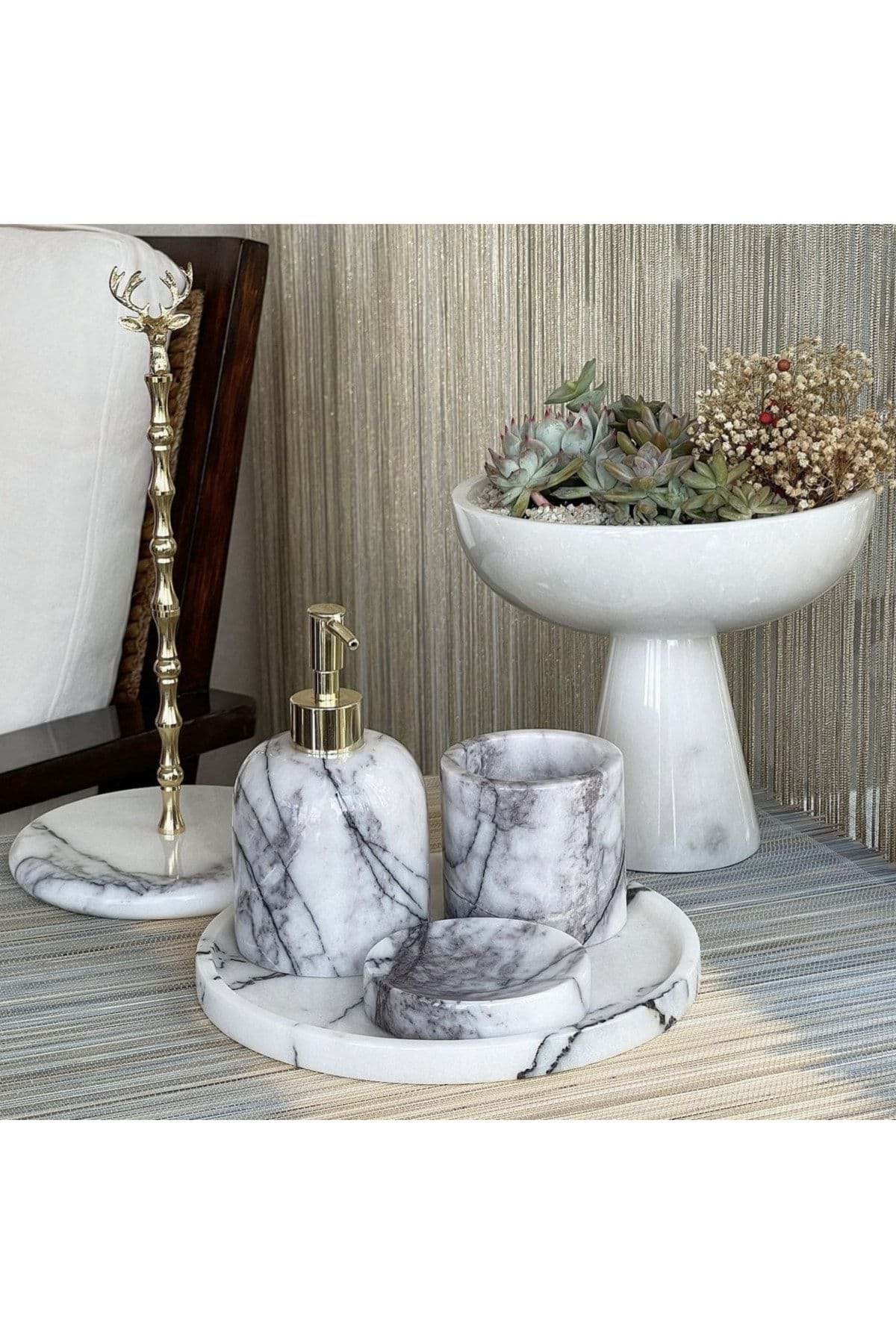 Mermer detaylarıyla zenginleştirilmiş tasarımı, banyonuza şıklık ve zarafet katar; 5 parçadan oluşan set, banyo deneyiminizi tamamlayıcı bir estetik sunar; Gold rengi detaylar, modern ve lüks bir görünüm sağlar; Dayanıklı malzeme kullanımı sayesinde uzun ömürlü ve kaliteli bir kullanım vaat eder;