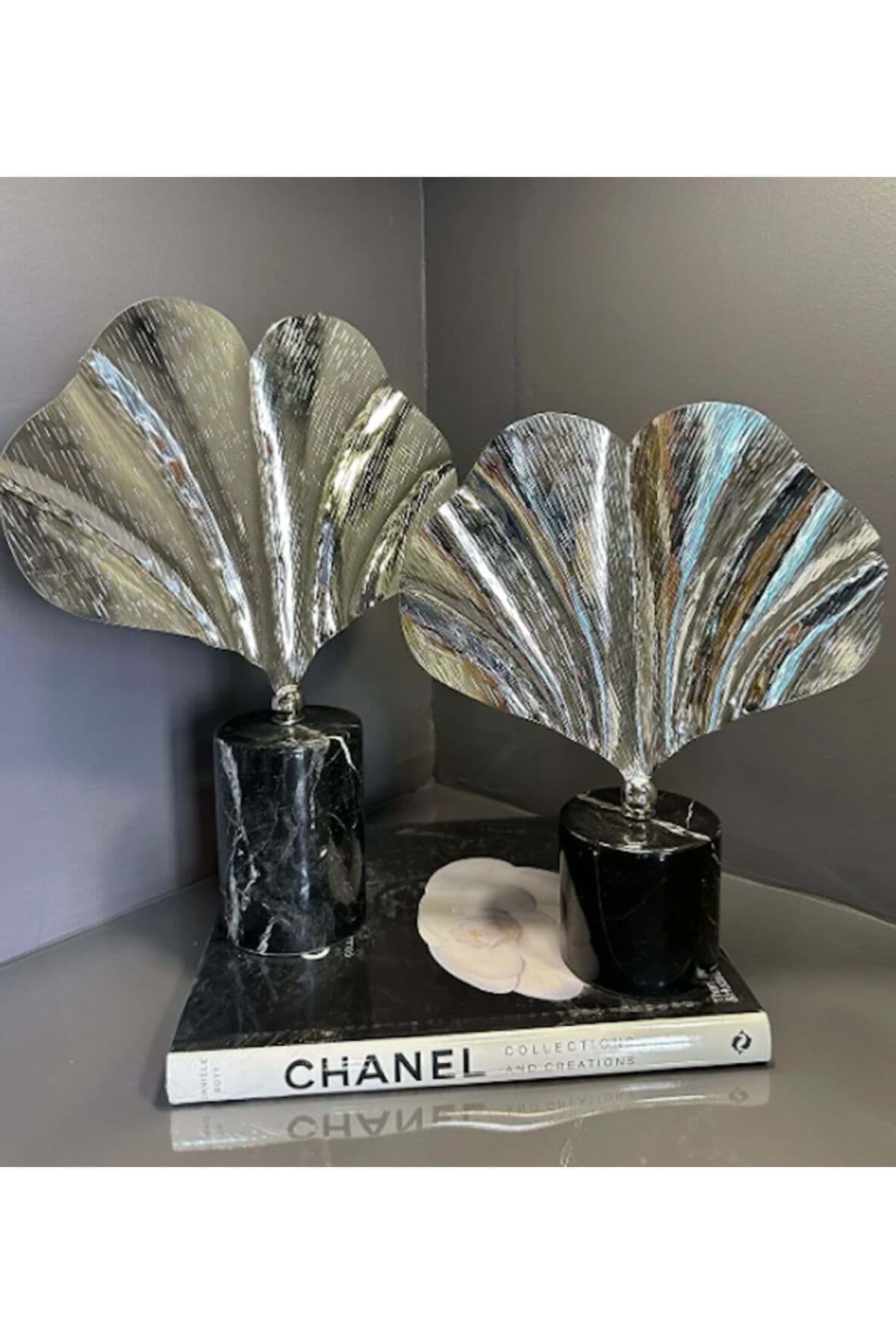 Modern tasarımıyla ev ve ofis dekorasyonunuza şıklık katan dekoratif mermer kaideli 2'li ginko yaprak obje; Dayanıklı metal materyali sayesinde uzun ömürlü kullanım sunar ve kolay temizlenebilir özelliğiyle pratik bir kullanım sağlar; Metal yapısı ile modern ve minimalist dekorasyon tarzlarına uyum sağlayarak mekanınıza çağdaş bir hava katar;