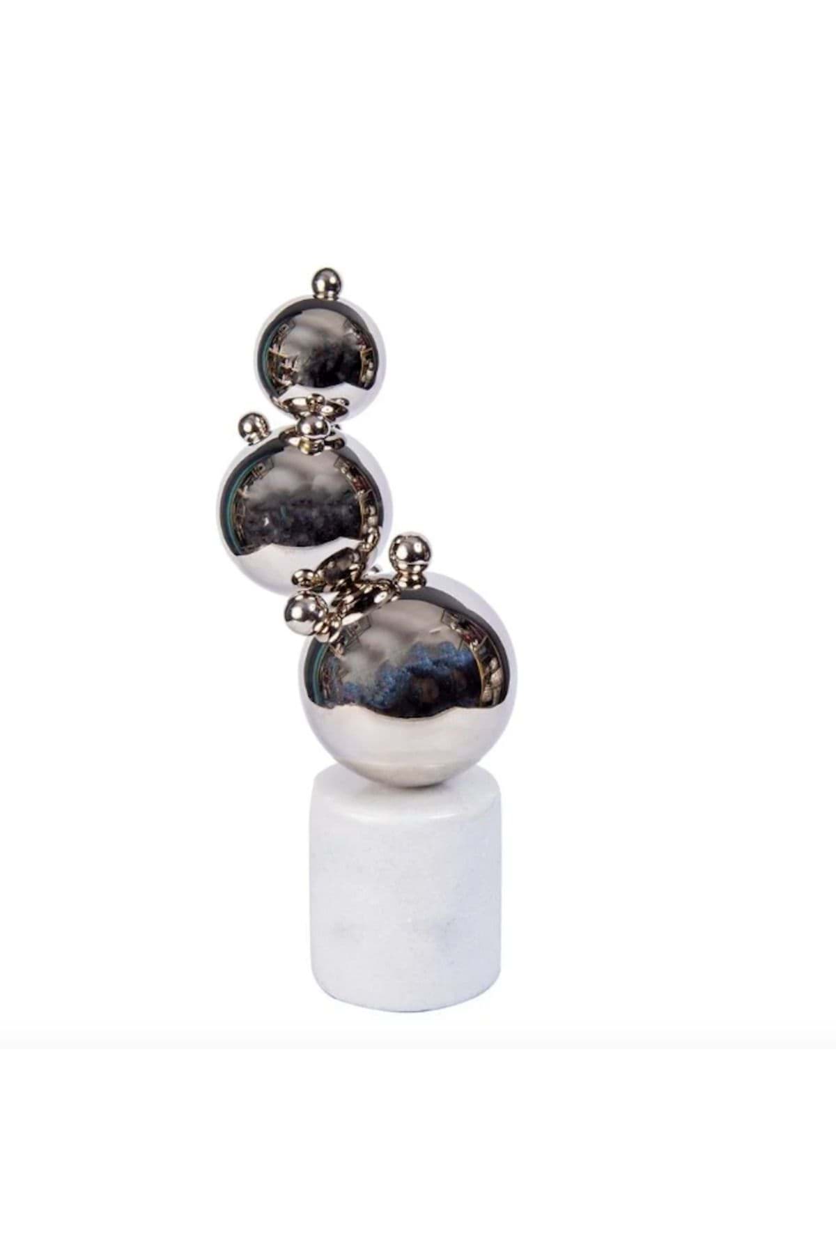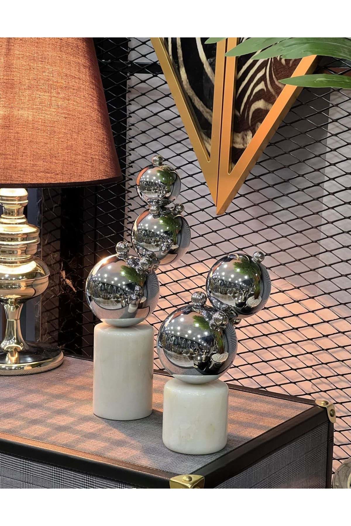 Modern dekorasyon anlayışınıza uyum sağlayacak metal malzeme kullanılarak üretilmiş, dayanıklı ve uzun ömürlü bir dekoratif obje; Şık ve zarif tasarımıyla dikkat çeken, her türlü mekanın atmosferini zenginleştiren modern stil sahibi bir aksesuar; İki adet balon şeklindeki top ile estetik bir görünüm sunan, dekoratif mermer kaideli bu ürün, mekanınıza sofistike bir dokunuş katıyor; Metal malzemesi sayesinde kolay temizlenebilirlik ve dayanıklılık sunarak uzun süreli kullanım imkanı sağlar;