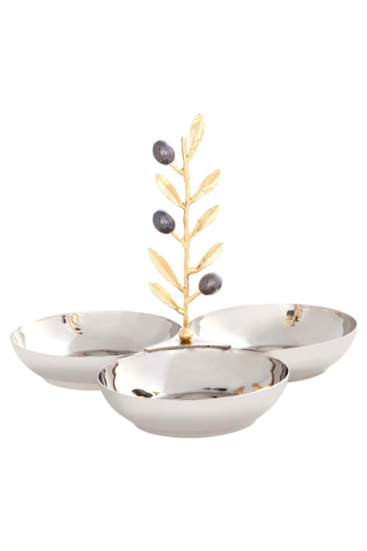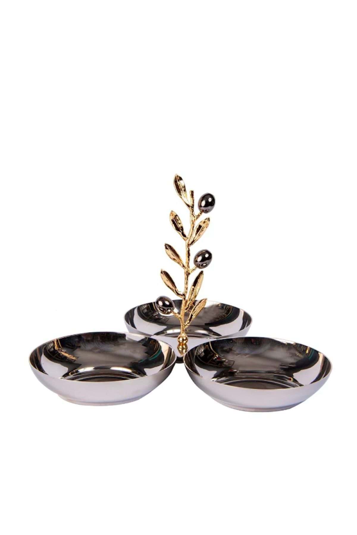 Modern ve şık tasarımıyla her mutfak dekorasyonuna uyum sağlayan pirinç kulplu 3'lü zeytindalı çerezlik, çerezlerinizi sunumunuza zarif bir dokunuş ekler; Dayanıklı çelik materyali sayesinde uzun ömürlü kullanım sunar ve sık kullanıma karşı direnç gösterir; Üç adet zeytin şeklinde tasarlanmış kase, hem göze hitap eder hem de farklı boyutlardaki atıştırmalıklar için idealdir;
