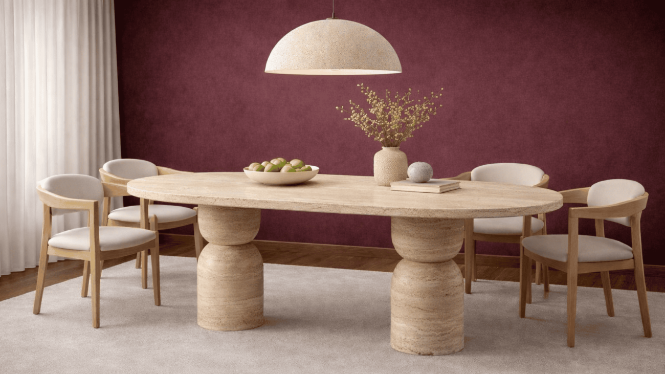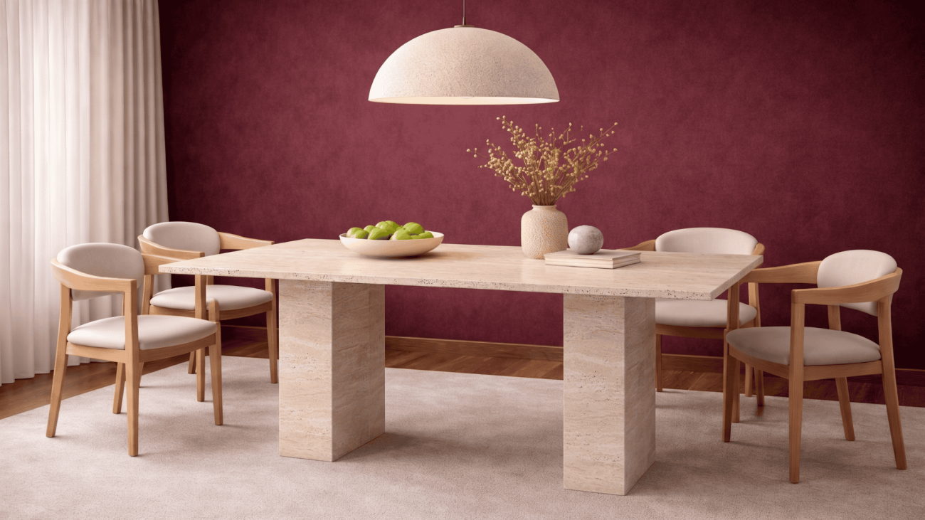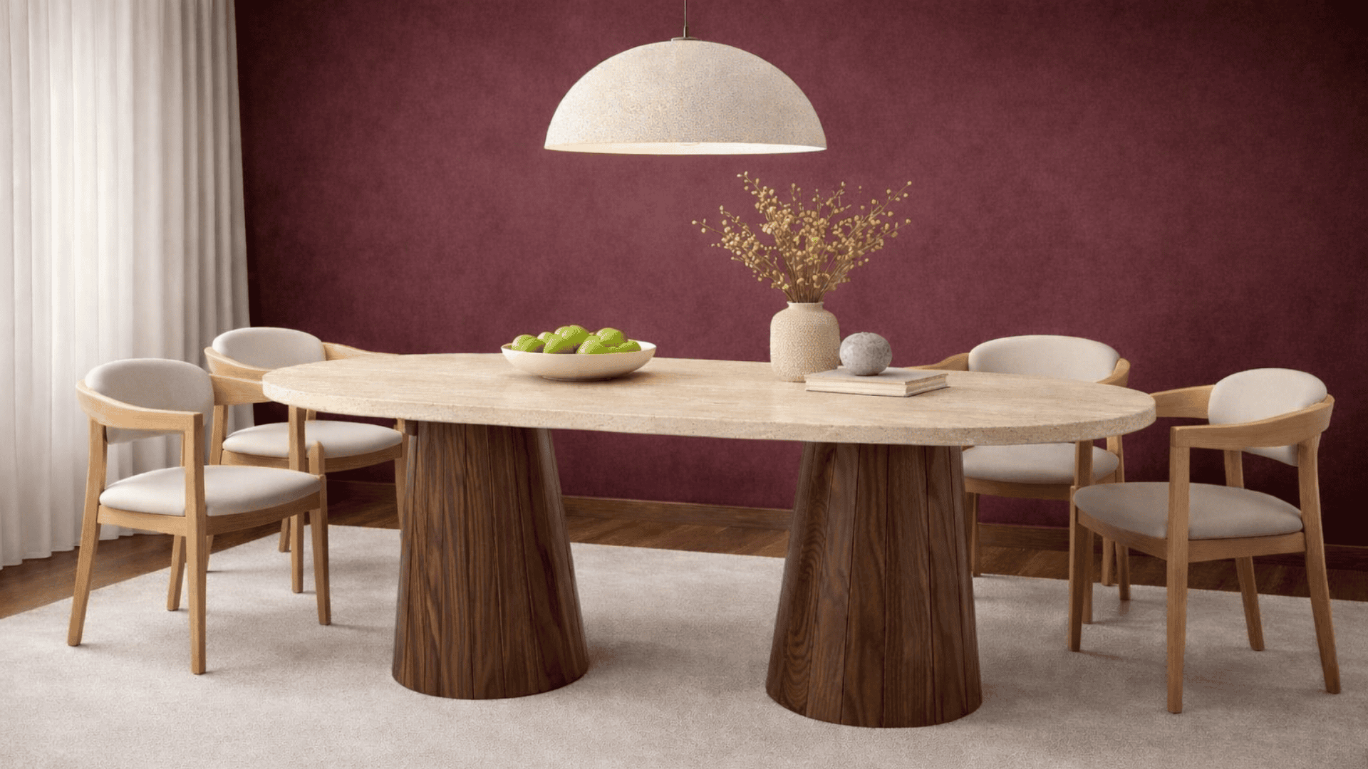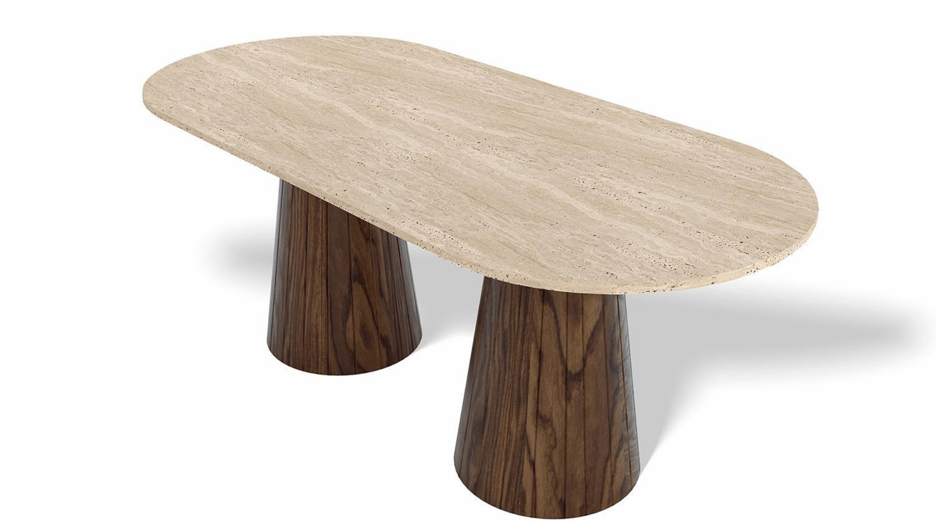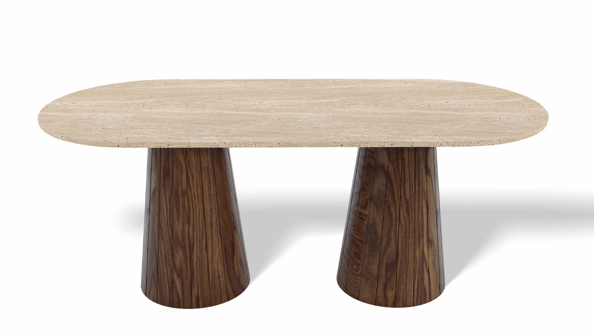 Martha – Ahşap Huni Ayaklı Traverten Mermer Yemek Masası