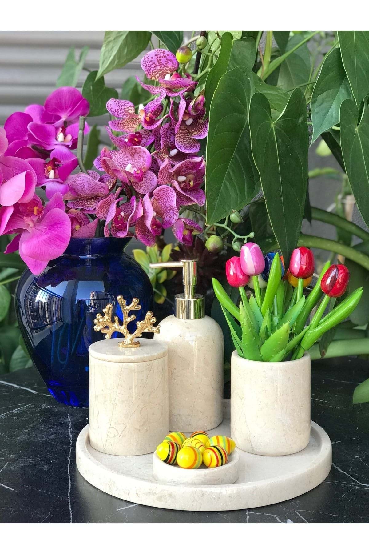 ÜRÜN %100 GER Ç EK DO ĞAL MERMERDEN ÜRETİLMİ Ş TİR. ; TEPSİ ÇAP 30 CM ; SIVI SABUNLUK ÇAP 8 CM Y ÜKSEKLİK 11 CM ; KATI SABUNLUK ÇAP 11 CM ; D İ Ş FIRÇALIK ÇAP 8 CM Y ÜKSEKLİK 10 CM ; PAMUKLUK ÇAP 8.5 CM Y ÜKSEKLİK 11 CM ; ÜRÜN BEJ RENK VE PİRİN Ç MERCAN AKSESUAR DETAYLIDIR. ; GOLD ALTIN RENK AKSESUAR DETAYLIDIR. ;