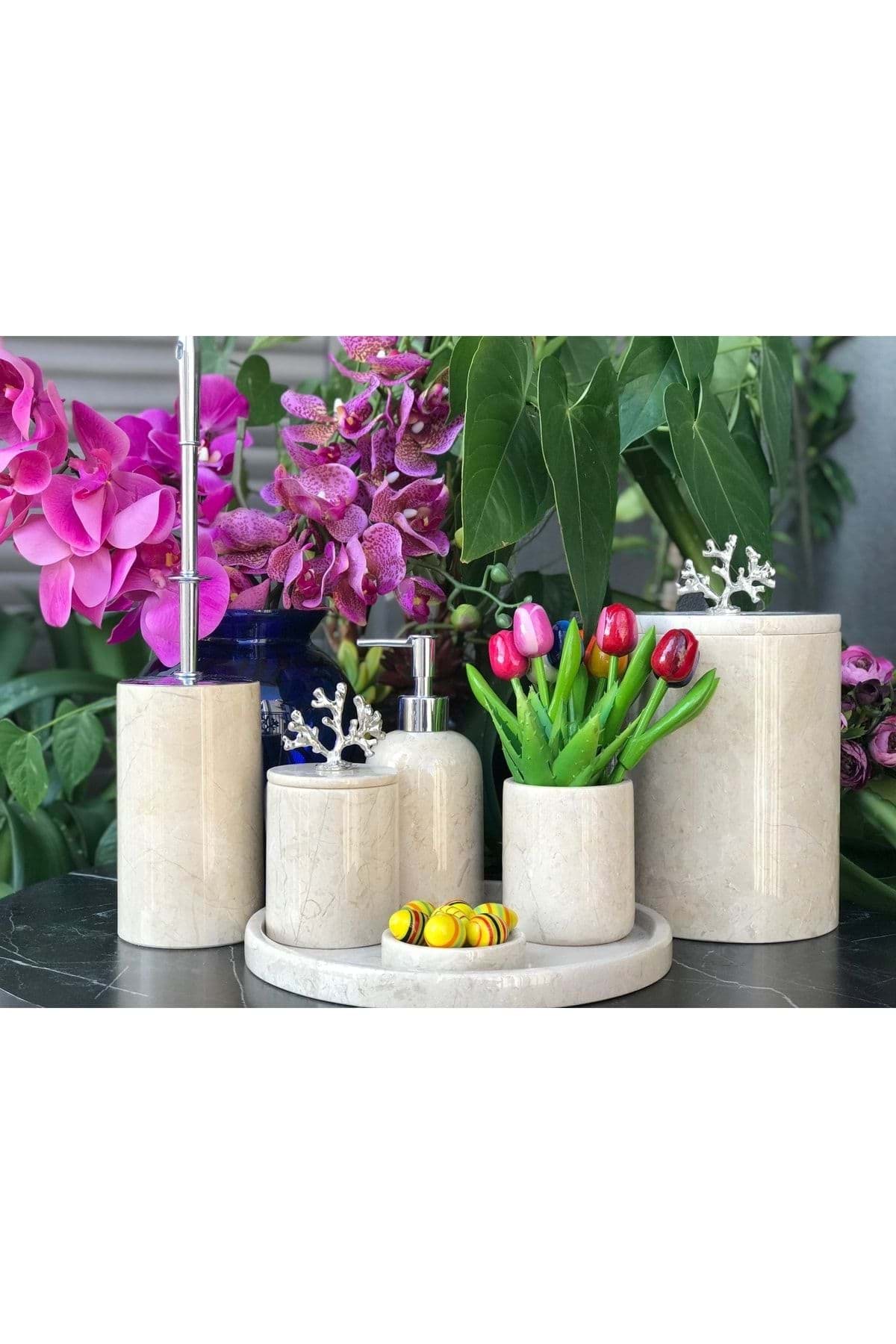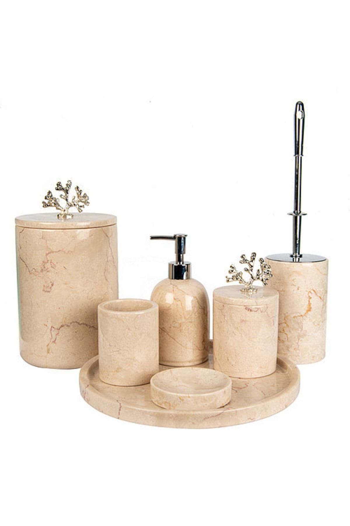 ÜRÜN %100 GERÇEK DOĞAL MERMERDEN ÜRETİLMİŞTİR. ; TEPSİ ÇAP 30 CM ; SIVI SABUNLUK ÇAP 8 CM YÜKSEKLİK 11 CM ; KATI SABUNLUK ÇAP 11 CM ; DİŞ FIRÇALIK ÇAP 8 CM YÜKSEKLİK 10 CM ; PAMUKLUK ÇAP 8.5 CM YÜKSEKLİK 11 CM ; TUVALET FIR ÇALIK ÇAP 10 CM YÜKSEKLİK 15 CM ; ÇÖP KOVASI ÇAP 15 CM YÜKSEKLİK 21 CM ; ÜRÜN BEJ RENK VE PİRİNÇ MERCAN AKSESUAR DETAYLIDIR. ; SILVER GÜMÜŞ RENK AKSESUAR DETAYLIDIR. ;
