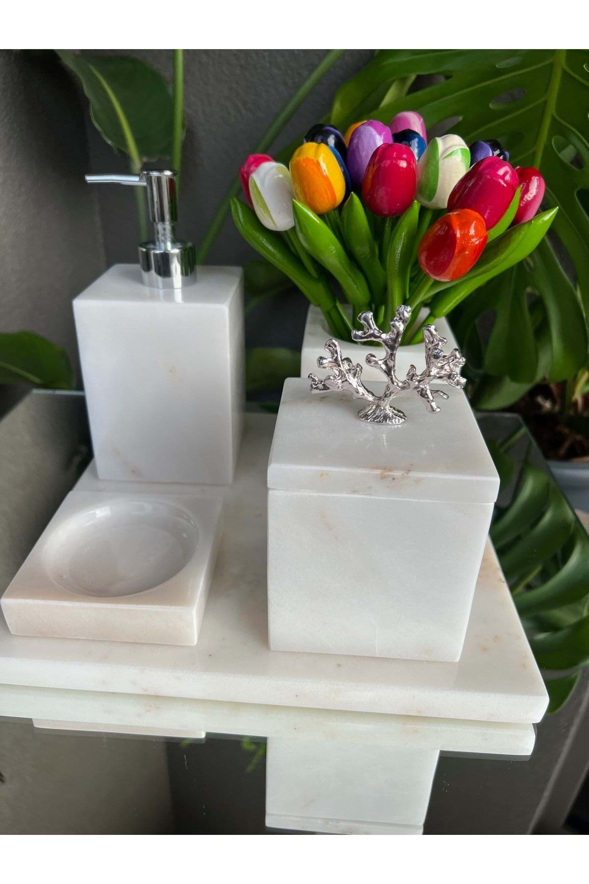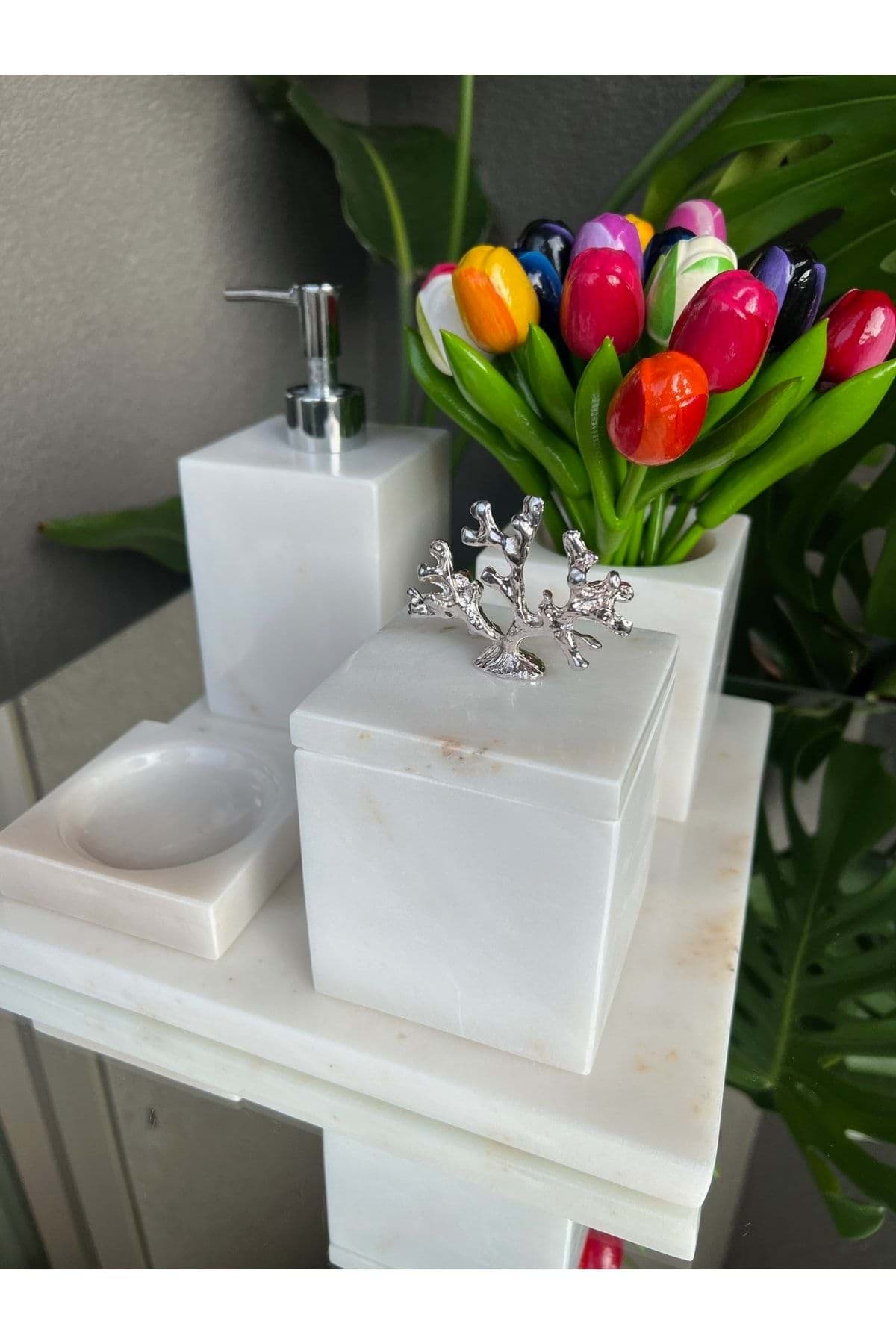 Dekoratif Beyaz Mermer Düz Kare Gümüş Mercan Detaylı 5 Li Banyo Seti Takımı