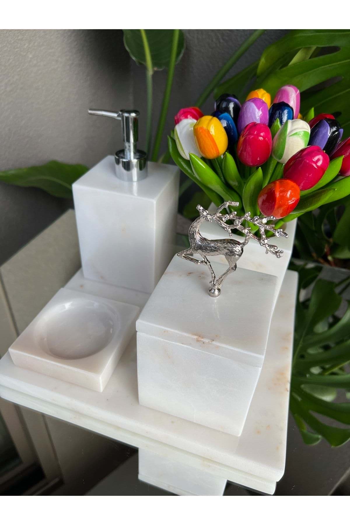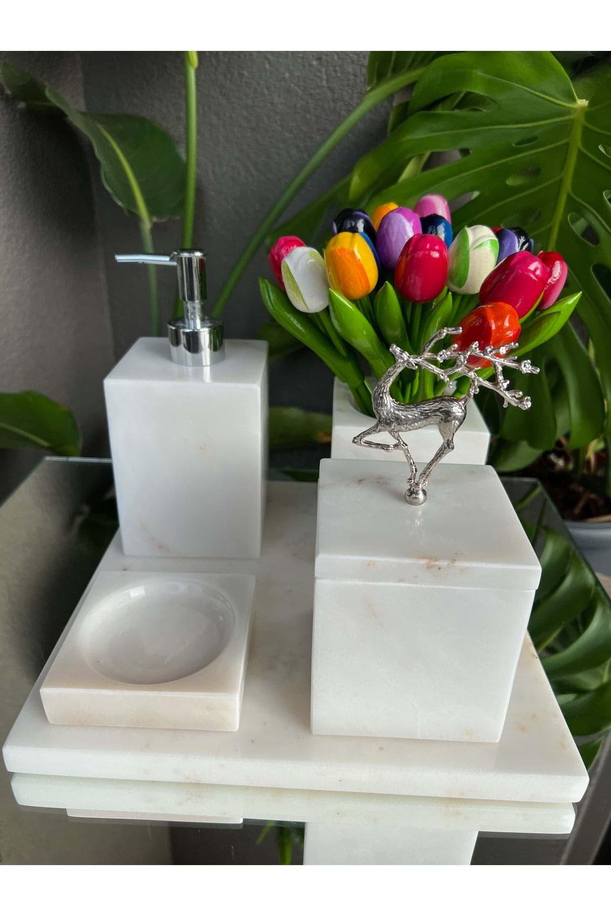 Mermer malzemesi sayesinde uzun ömürlü ve dayanıklı kullanım sunar; Şık ve modern tasarımıyla banyonuza estetik bir dokunuş katar; Gümüş uçan geyik detayları ile göz alıcı bir görünüm sağlar; Kare formu, banyonuzda zarif bir uyum yaratır; 5 parçadan oluşan set, banyo ihtiyaçlarınızı eksiksiz karşılar;