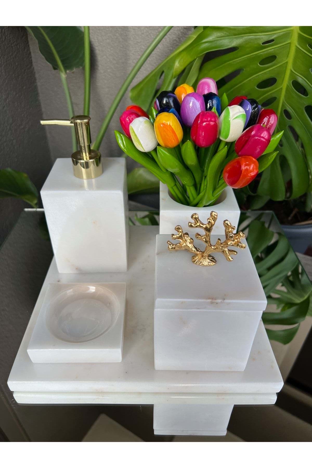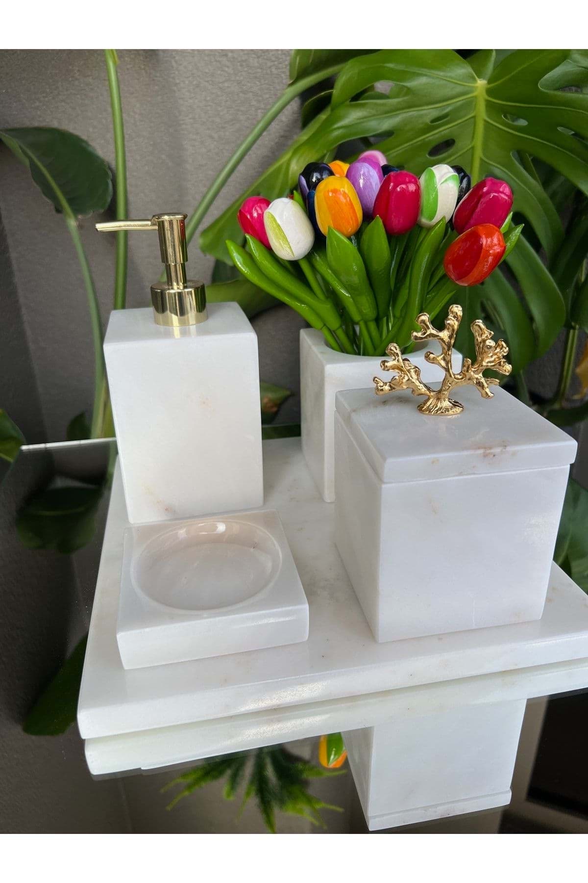 - Mermer malzemesi sayesinde uzun ömürlü ve dayanıklı kullanım sunar; - Beyaz mermerin zarif dokusu, banyonuza modern ve şık bir görünüm kazandırır; - Kare formdaki tasarımıyla modern banyo dekorasyonlarına kolayca uyum sağlar; - Gold mercan detayları ile estetik bir dokunuş ekleyerek banyonuzun atmosferini zenginleştirir; - 5 parçadan oluşan set, banyo ihtiyaçlarınız için eksiksiz bir çözüm sunar;
