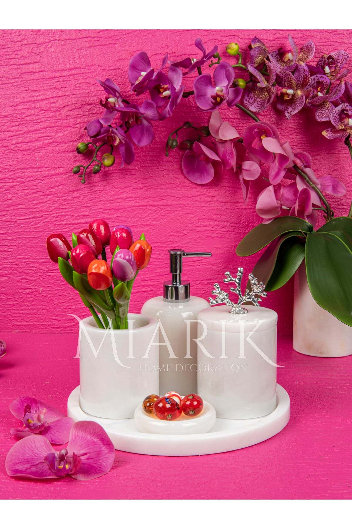 ÜRÜN %100 GERÇEK DOĞAL MERMERDEN ÜRETİLMİŞTİR. ; TEPSİ ÇAP 30 CM. ; SIVI SABUNLUK ÇAP 8 CM YÜKSEKLİK 11 CM. ; KATI SABUNLUK ÇAP 11 CM . ; DİŞ FIRÇALIK ÇAP 8 CM YÜKSEKLİK 10 CM. ; PAMUKLUK ÇAP 8.5 CM YÜKSEKLİK 11 CM. ; ÜRÜN BEYAZ RENK VE PİRİNÇ MERCAN AKSESUAR DETAYLIDIR. ; GÜMÜŞ RENK AKSESUAR DETAYLIDIR ;