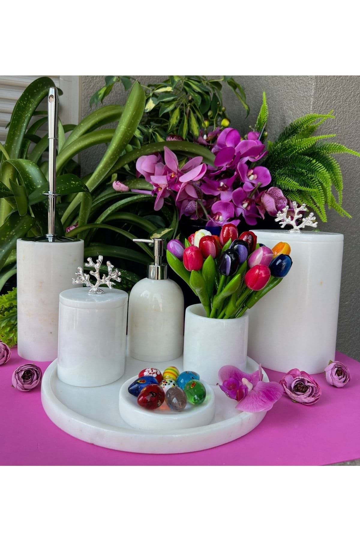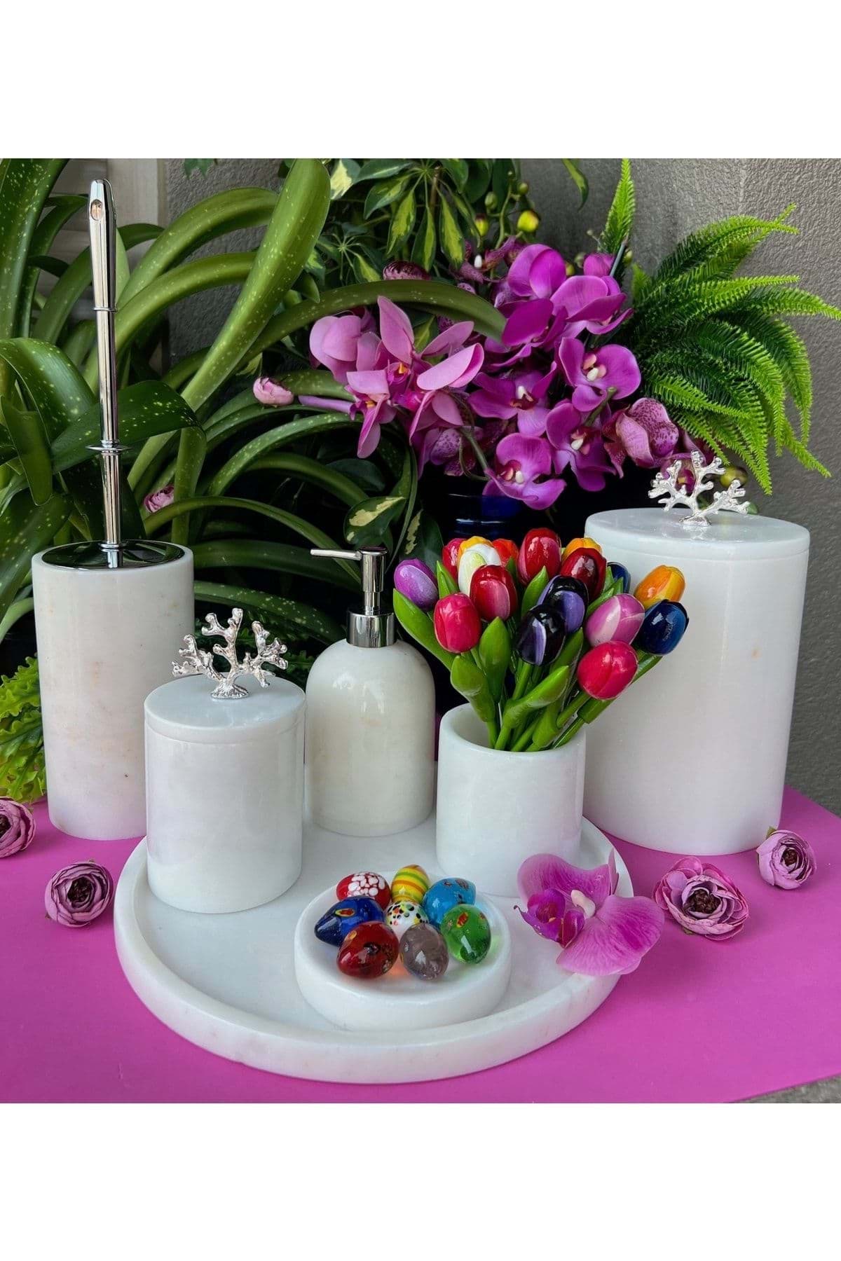ÜRÜN %100 GERÇEK DOĞAL MERMERDEN ÜRETİLMİŞTİR ; TEPSİ ÇAP 30 CM ; SIVI SABUNLUK ÇAP 8 CM YÜKSEKLİK 11 CM ; KATI SABUNLUK ÇAP 11 CM ; DİŞ FIRÇALIK ÇAP 8 CM YÜKSEKLİK 10 CM ; PAMUKLUK ÇAP 8.5 CM YÜKSEKLİK 11 CM ; TUVALET FIRÇASI ÇAP 10 CM YÜKSEKLİK 15 CM ; ÇÖP KOVASI ÇAP 15 CM YÜKSEKLİK 21 CM ; ÜRÜN BEYAZ RENK VE PİRİNÇ MERCAN AKSESUAR DETAYLIDIR. ; GÜMÜŞ RENK AKSESUAR DETAYLIDIR ;
