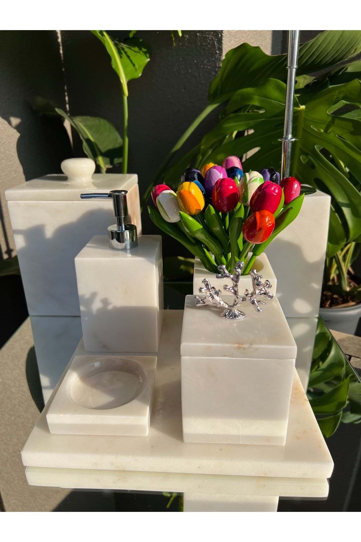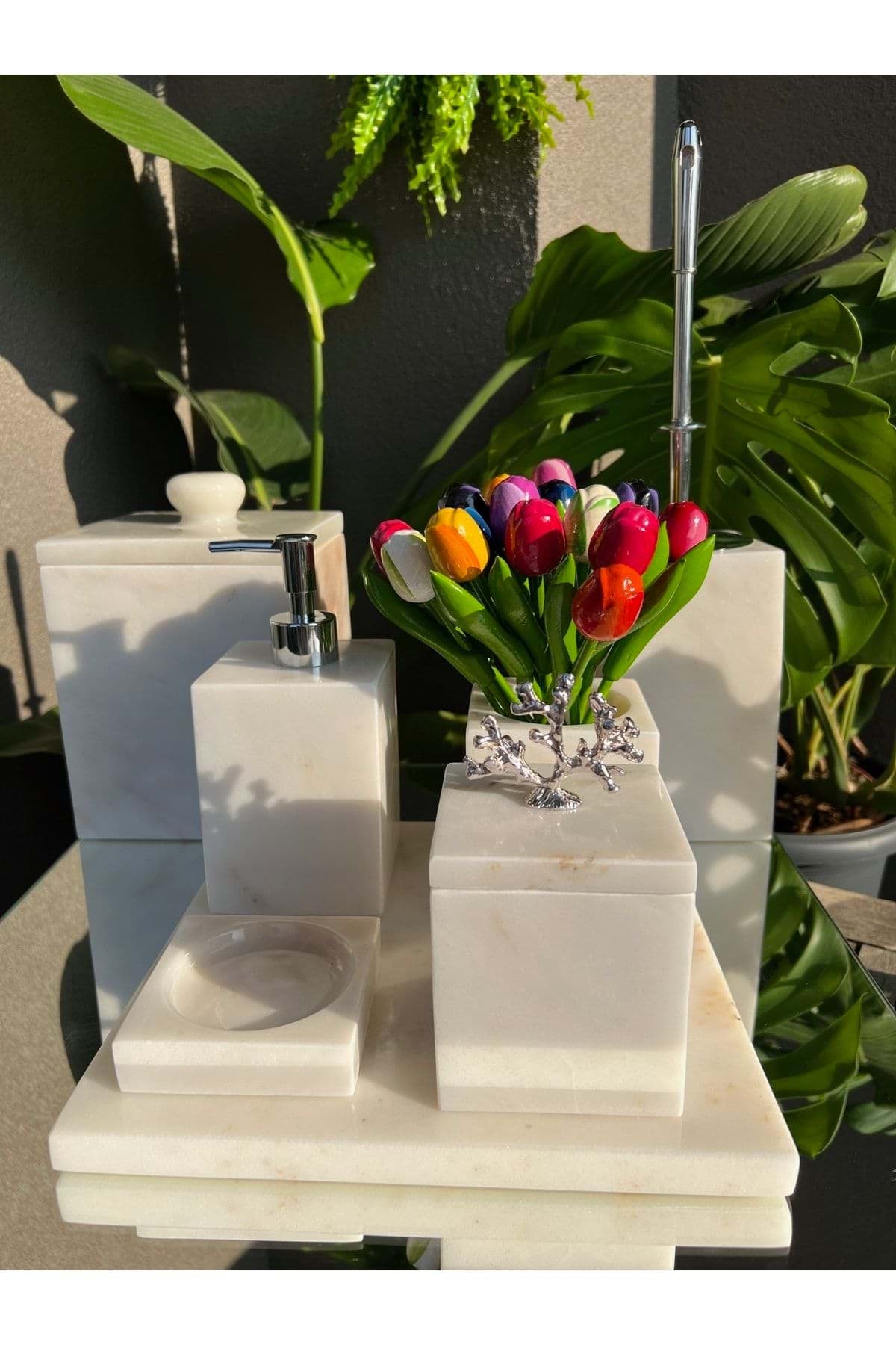 ÜRÜN %100 GERÇEK DOĞAL MERMERDEN ÜRETİLMİŞTİR ; TEPSİ 30 x 30 CM ; SIVI SABUNLUK ÇAP 8 CM YÜKSEKLİK 11 CM ; KATI SABUNLUK ÇAP 11 CM ; DİŞ FIRÇALIK ÇAP 8 CM YÜKSEKLİK 10 CM ; PAMUKLUK ÇAP 8.5 CM YÜKSEKLİK 11 CM ; TUVALET FIRÇASI ÇAP 10 CM YÜKSEKLİK 15 CM ; ÇÖP KOVASI ÇAP 15 CM YÜKSEKLİK 21 CM ; ÜRÜN BEyaz RENK VE PİRİNÇ MERCAN AKSESUAR DETAYLIDIR. ; GÜMÜŞ RENK AKSESUAR DETAYLIDIR ;