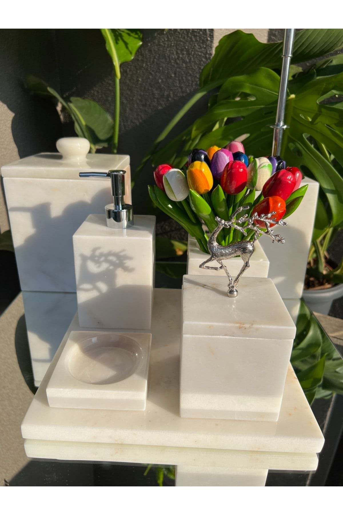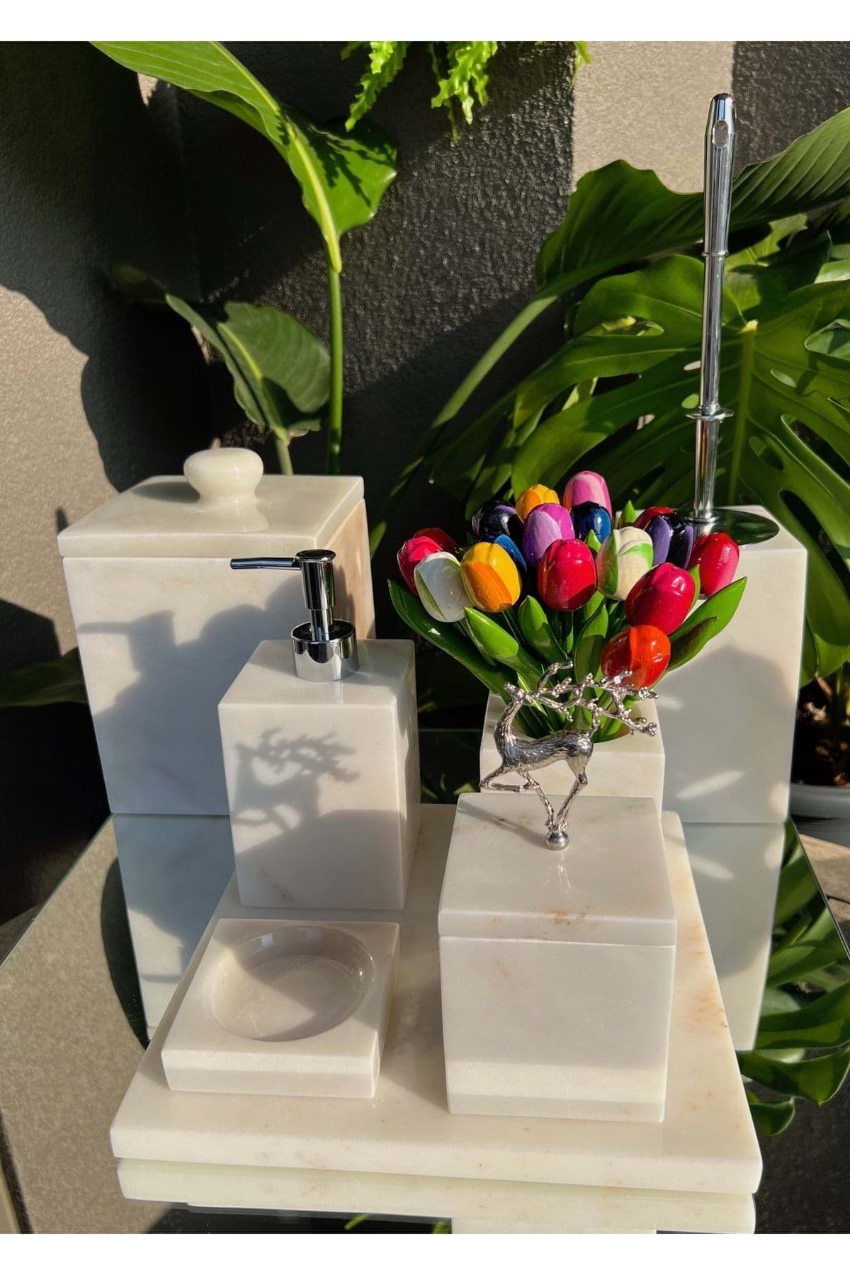 ÜRÜN %100 GERÇEK DOĞAL MERMERDEN ÜRETİLMİŞTİR ; TEPSİ 30 x 30 CM ; SIVI SABUNLUK ÇAP 8 CM YÜKSEKLİK 11 CM ; KATI SABUNLUK ÇAP 11 CM ; DİŞ FIRÇALIK ÇAP 8 CM YÜKSEKLİK 10 CM ; PAMUKLUK ÇAP 8.5 CM YÜKSEKLİK 11 CM ; TUVALET FIRÇASI ÇAP 10 CM YÜKSEKLİK 15 CM ; ÇÖP KOVASI ÇAP 15 CM YÜKSEKLİK 21 CM ; ÜRÜN BEYAZ RENK VE PİRİNÇ GEYIK AKSESUAR DETAYLIDIR. ; GÜMÜŞ RENK AKSESUAR DETAYLIDIR ;