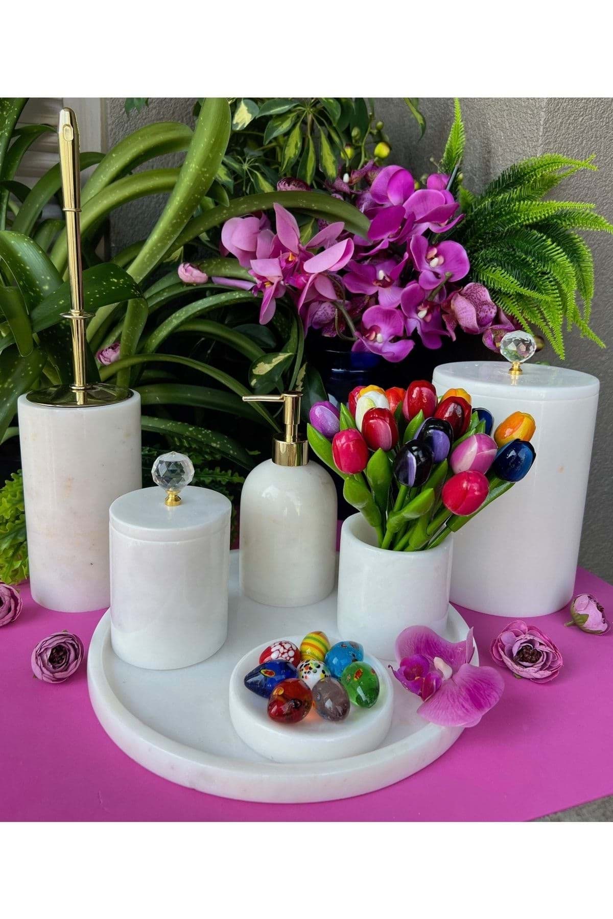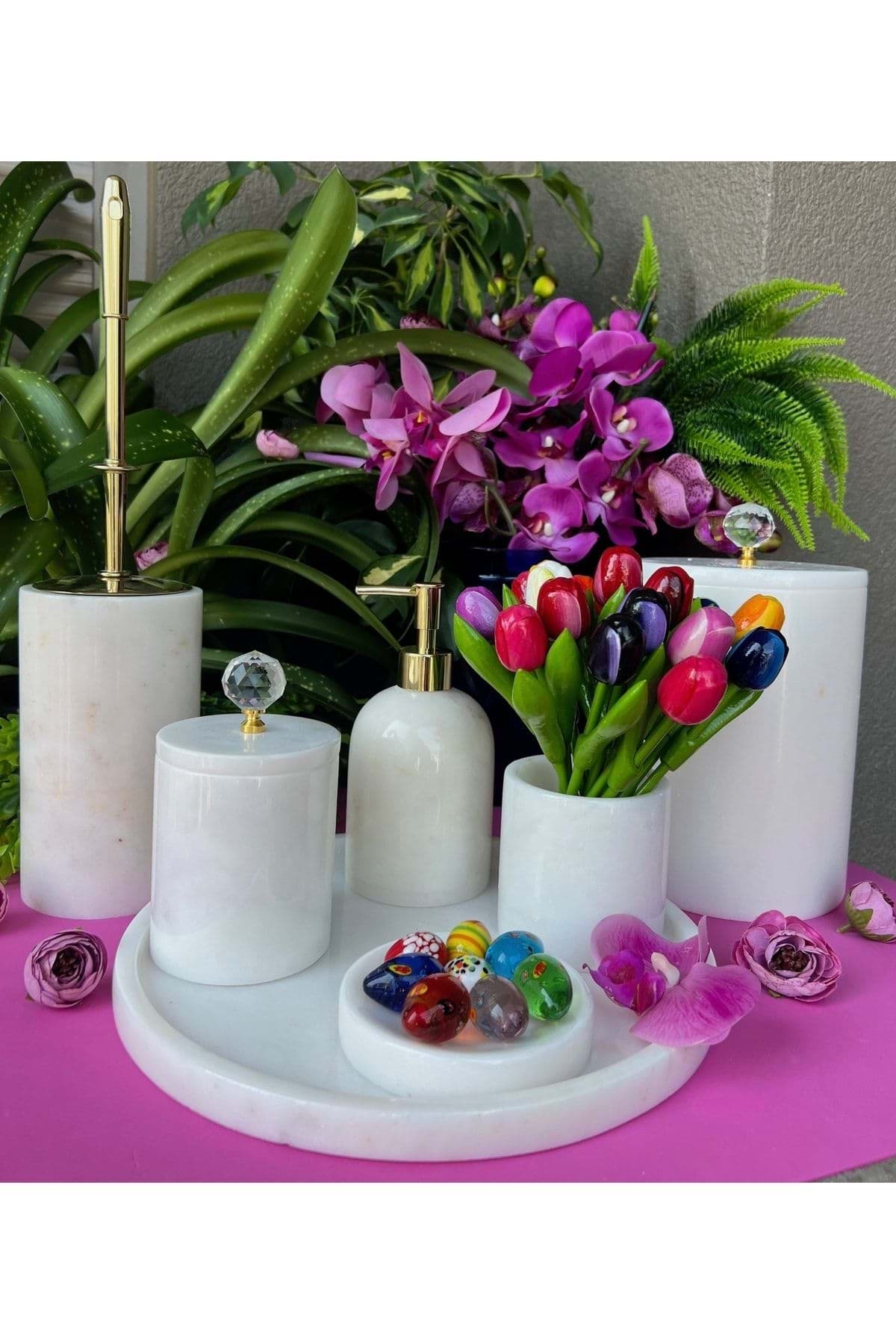 ÜRÜN %100 GERCEK DOGAL MERMERDEN ÜRETİLMİSTIR ; TEPSİ ÇAP 30 CM ; SIVI SABUNLUK ÇAP 8 CM YÜKSEKLİK 11 CM ; KATI SABUNLUK ÇAP 11 CM ; DIS FIRÇALIK ÇAP 8 CM YÜKSEKLİK 10 CM ; PAMUKLUK ÇAP 8.5 CM YÜKSEKLİK 11 CM ; TUVALET FIR ÇALIK ÇAP 10 CM YÜKSEKLİK 15 CM ; ÇÖP KOVASI ÇAP 15 CM YÜKSEKLİK 21 CM ; ÜRÜN BEYAZ RENK VE PİRİNC KRISTAL AKSESUAR DETAYLIDIR. ; GOLD RENK AKSESUAR DETAYLIDIR ;