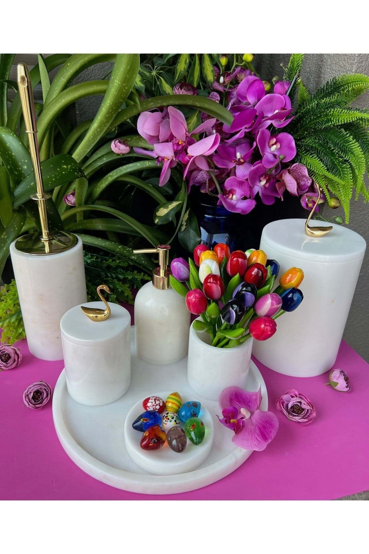 ÜRÜN %100 GERÇEK DOĞAL MERMERDEN ÜRETİLMİŞTİR. ; TEPSİ ÇAP 28 CM ; SIVI SABUNLUK ÇAP 8 CM YÜKSEKLİK 11 CM ; KATI SABUNLUK ÇAP 11 CM DİŞ FIRÇALIK ÇAP 8 CM YÜKSEKLİK 10 CM ; PAMUKLUK ÇAP 8.5 CM YÜKSEKLİK 11 CM ; TUVALET FIR ÇALIK ÇAP 10 CM YÜKSEKLİK 15 CM ; ÇÖP KOVASI ÇAP 15 CM YÜKSEKLİK 21 CM ; ÜRÜN BEYAZ RENK VE PİRİNÇ KUŞ KUĞU AKSESUAR DETAYLIDIR. ; GOLD ALTIN RENK AKSESUAR DETAYLIDIR ;
