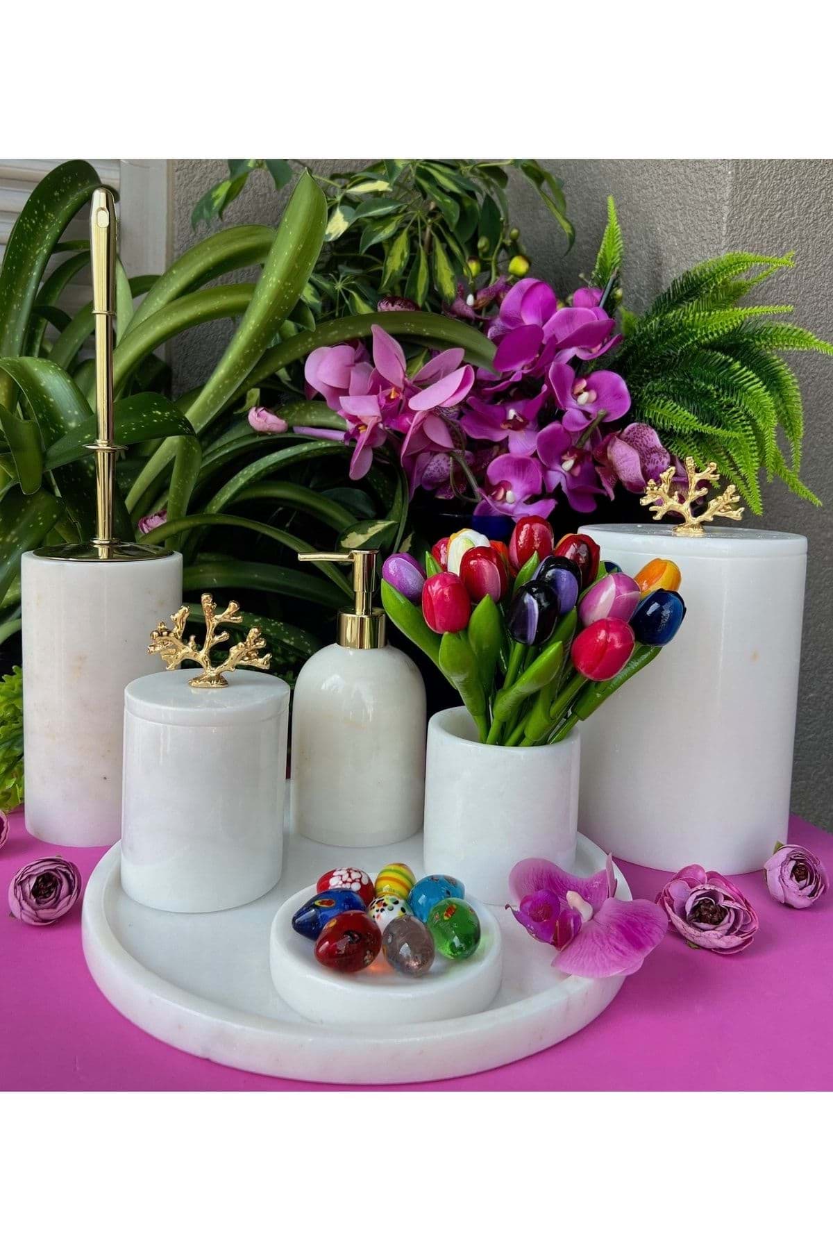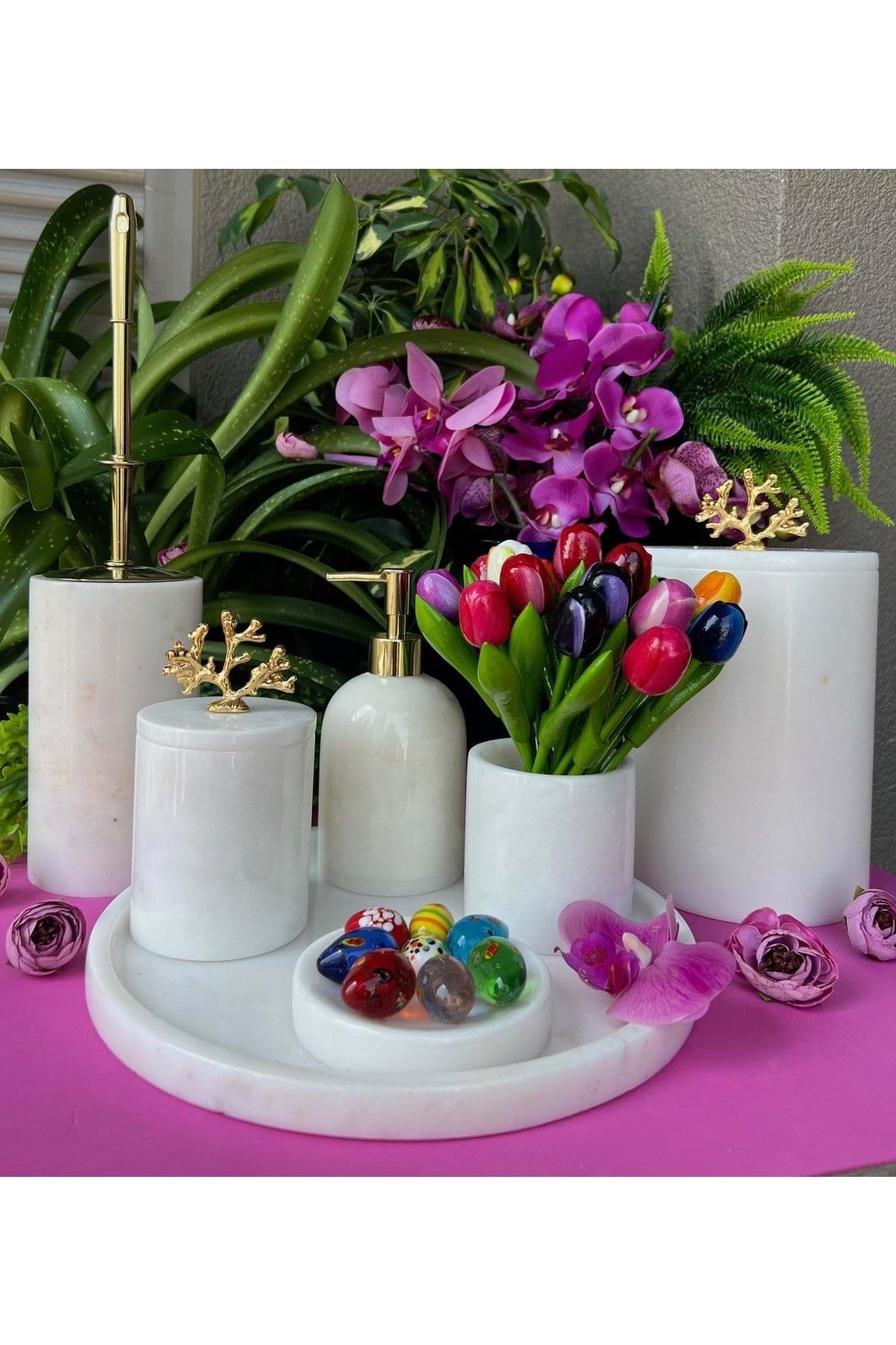 ÜRÜN %100 GERÇEK DOĞAL MERMERDEN ÜRETİLMİŞTİR ; TEPSİ ÇAP 30 CM ; SIVI SABUNLUK ÇAP 8 CM YÜKSEKLİK 11 CM ; KATI SABUNLUK ÇAP 11 CM ; DİŞ FIRÇALIK ÇAP 8 CM YÜKSEKLİK 10 CM ; PAMUKLUK ÇAP 8.5 CM YÜKSEKLİK 11 CM ; TUVALET FIRÇASI ÇAP 10 CM YÜKSEKLİK 15 CM ; ÇÖP KOVASI ÇAP 15 CM YÜKSEKLİK 21 CM ; ÜRÜN BEYAZ RENK VE PİRİNÇ MERCAN AKSESUAR DETAYLIDIR. ; ALTIN RENK AKSESUAR DETAYLIDIR ;