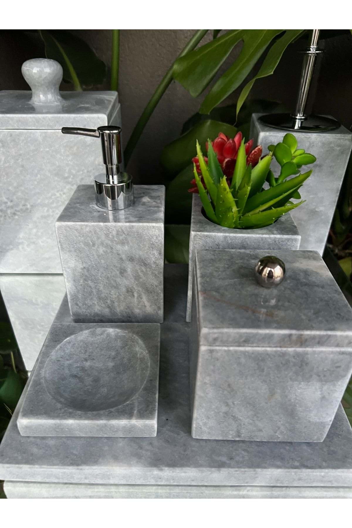 ÜRÜN %100 GERÇEK DOĞAL MERMERDEN ÜRETİLMİŞTİR ; TEPSİ ÇAP 15x25x3 CM ; SIVI SABUNLUK ÇAP 8x8x12 CM ; KATI SABUNLUK ÇAP 11 CM ; DİŞ FIRÇALIK ÇAP 8x8x11 CM ; PAMUKLUK 8x8x9 CM ; TUVALET FIR ÇALIK 10x10x15 CM ; ÇÖP KOVASI 15x20x25 CM ; ÜRÜN GRİ RENKTEDIR ; GÜMÜŞ RENK AKSESUAR DETAYLIDIR ;