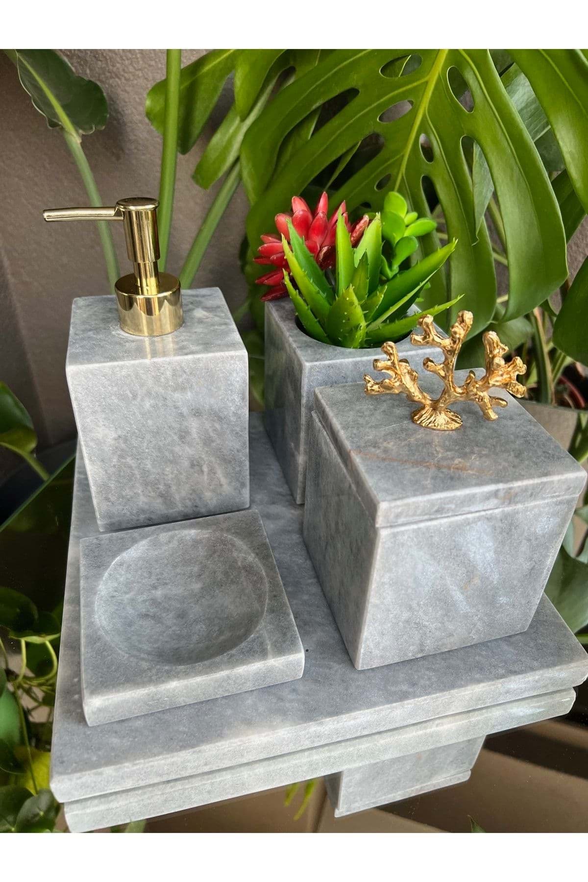 - Mermer malzemesi sayesinde hem şık hem de dayanıklı bir kullanım sunar; - Kare formu ile modern ve estetik bir görünüm sağlar; - Altın rengi mercan detayları ile banyonuza zarif bir dokunuş katar; - 5 parçadan oluşan set, banyonuzda ihtiyacınız olan tüm parçaları tek pakette toplar; - Kolay temizlenebilir yüzeyi sayesinde hijyenik bir kullanım imkanı sunar;