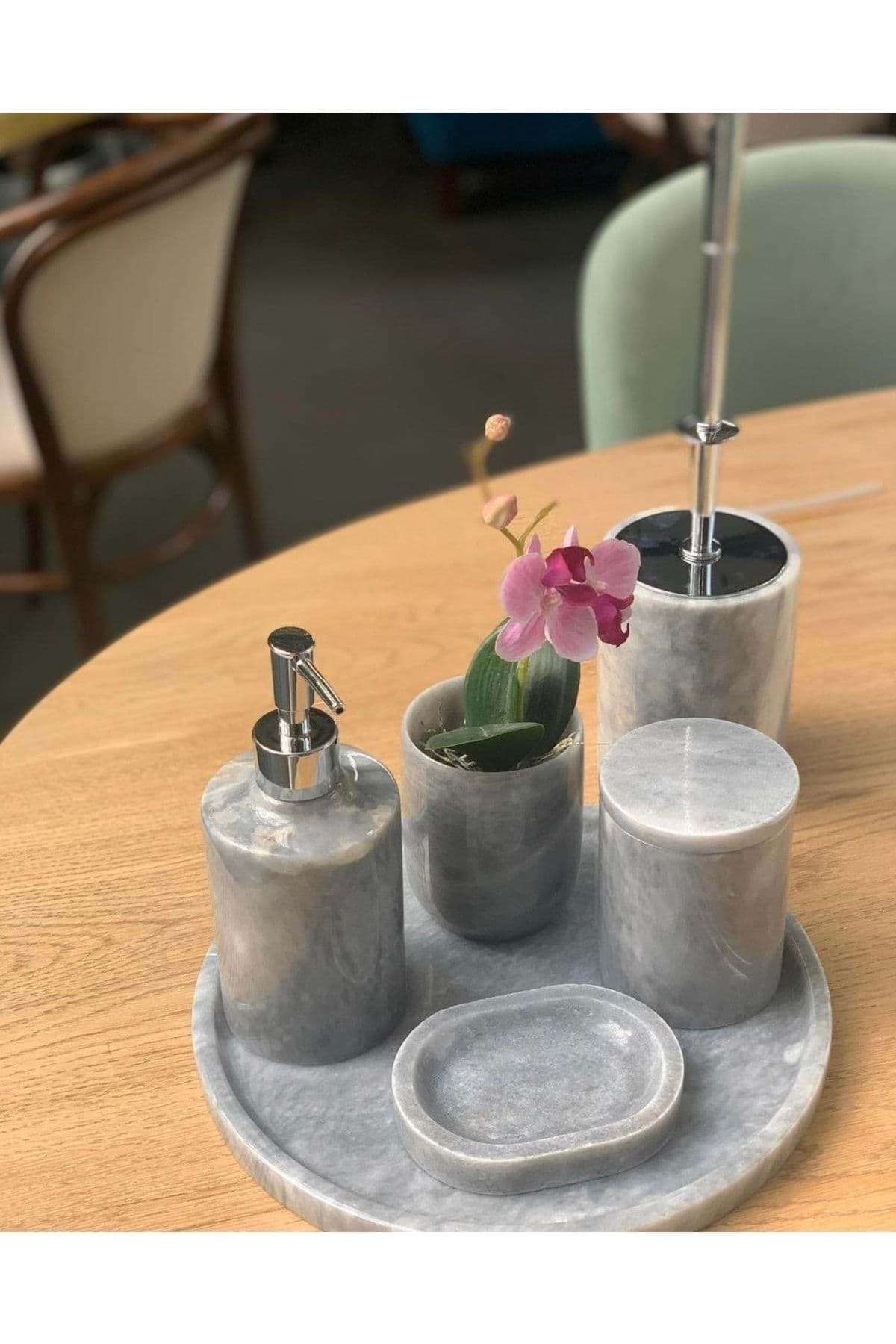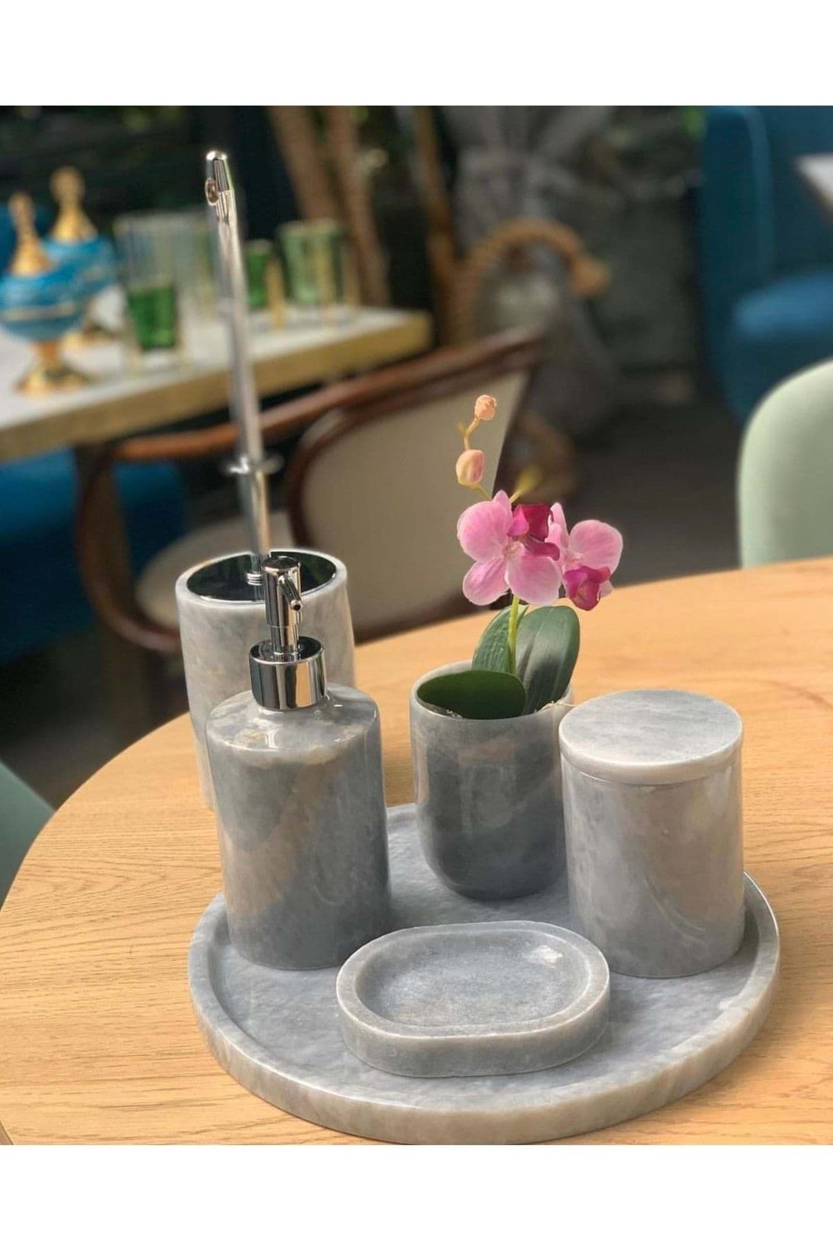 ÜRÜN %100 GERÇEK DOĞAL MERMERDEN ÜRETİLMİŞTİR. ; TEPSİ ÇAP 30 CM ; SIVI SABUNLUK ÇAP 8 CM YÜKSEKLİK 11 CM ; KATI SABUNLUK ÇAP 11 CM ; DİŞ FIRÇALIK ÇAP 8 CM YÜKSEKLİK 10 CM ; PAMUKLUK ÇAP 8.5 CM YÜKSEKLİK 11 CM ; TUVALET FIR ÇALIK ÇAP 10 CM YÜKSEKLİK 15 CM ; ÇÖP KOVASI ÇAP 15 CM YÜKSEKLİK 21 CM ; ÜRÜN GRİ RENKTIR ; GÜMÜŞ RENK AKSESUAR DETAYLIDIR ;