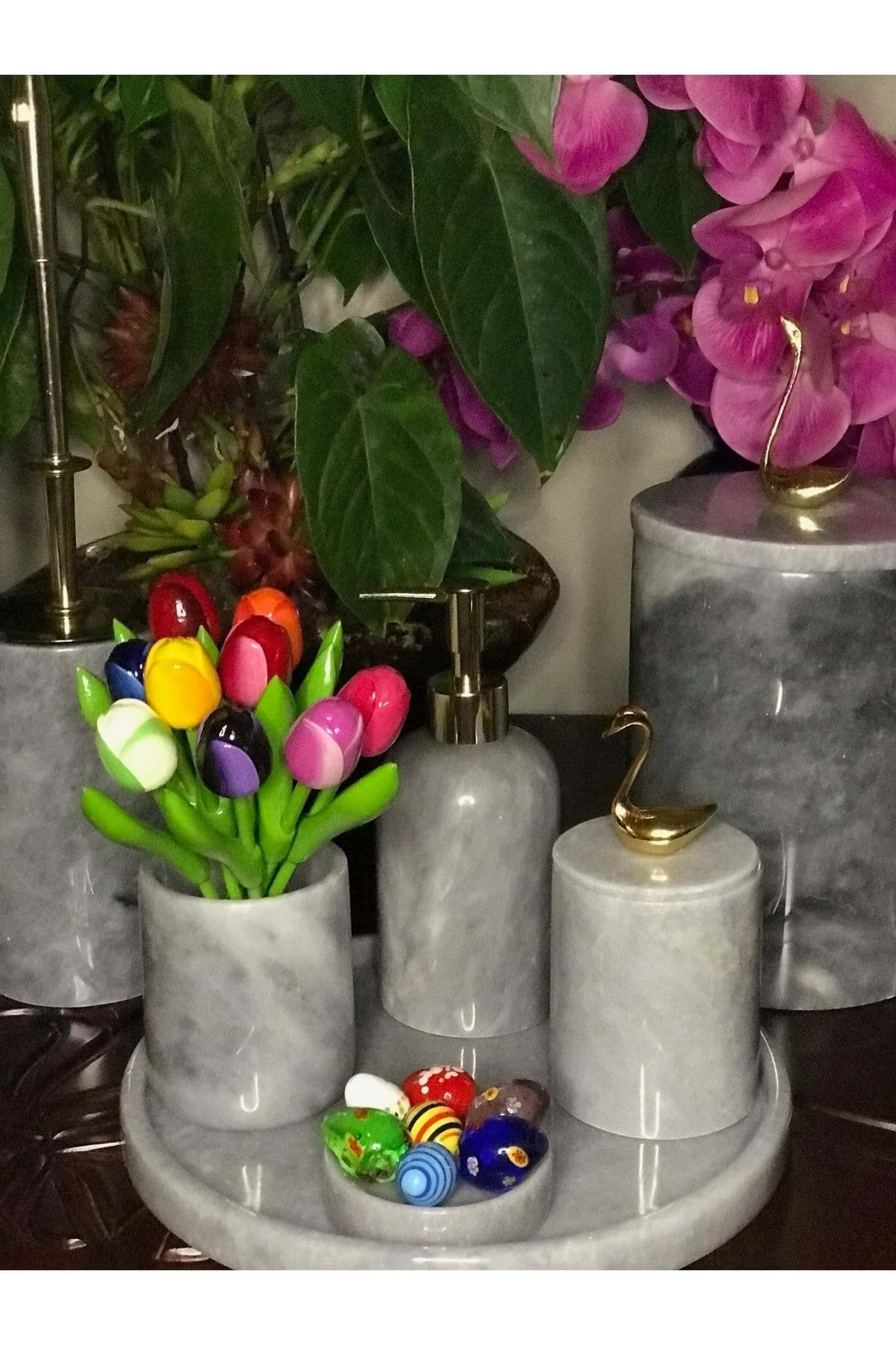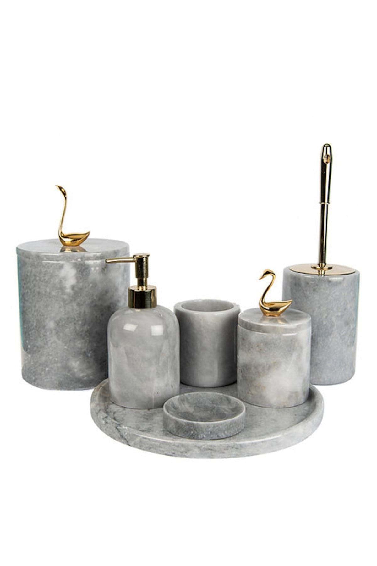 ÜRÜN %100 GERÇEK DOĞAL MERMERDEN ÜRETİLMİŞTİR. ; TEPSİ ÇAP 30 CM ; SIVI SABUNLUK ÇAP 8 CM YÜKSEKLİK 11 CM ; KATI SABUNLUK ÇAP 11 CM ; DİŞ FIRÇALIK ÇAP 8 CM YÜKSEKLİK 10 CM ; PAMUKLUK ÇAP 8.5 CM YÜKSEKLİK 11 CM ; TUVALET FIR ÇALIK ÇAP 10 CM YÜKSEKLİK 15 CM ; ÇÖP KOVASI ÇAP 15 CM Y ÜKSEKLİK 21 CM ; ÜRÜN GRI RENK VE PİRİNÇ KUŞ KUĞU AKSESUAR DETAYLIDIR. ; GOLD ALTIN RENK AKSESUAR DETAYLIDIR ;