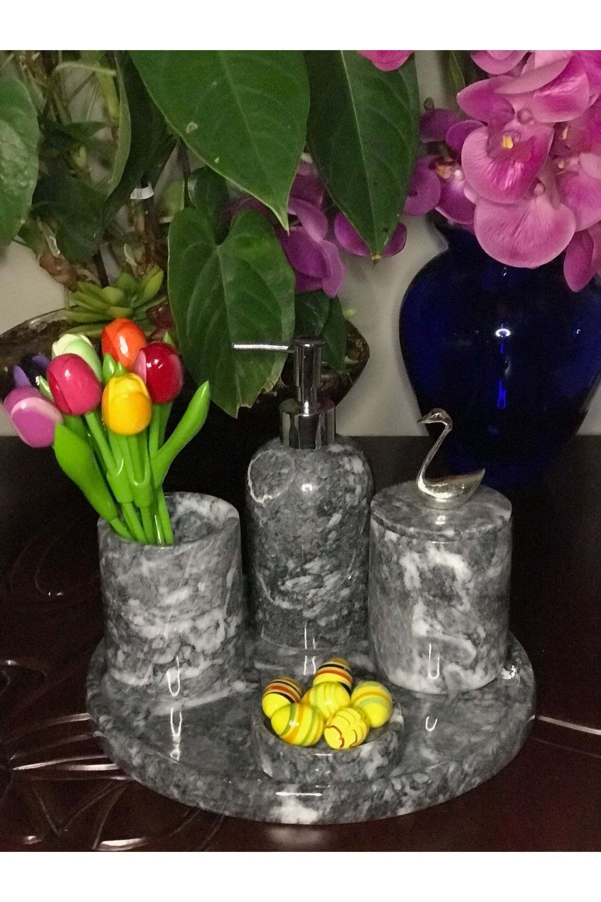 ÜRÜN %100 GERÇEK DOĞAL MERMERDEN ÜRETİLMİŞTİR. ; TEPSİ ÇAP 30 CM ; SIVI SABUNLUK ÇAP 8 CM YÜKSEKLİ K 11 CM ; KATI SABUNLUK ÇAP 11 CM ; DİŞ FIRÇALIK ÇAP 8 CM YÜKSEKLİ K 10 CM ; PAMUKLUK ÇAP 8.5 CM YÜKSEKLİ K 11 CM ; ÜRÜN KOYU GRİ RENK VE PİRİNÇ KUŞ KUĞU AKSESUAR DETAYLIDIR. ; GÜMÜŞ RENK AKSESUAR DETAYLIDIR ;