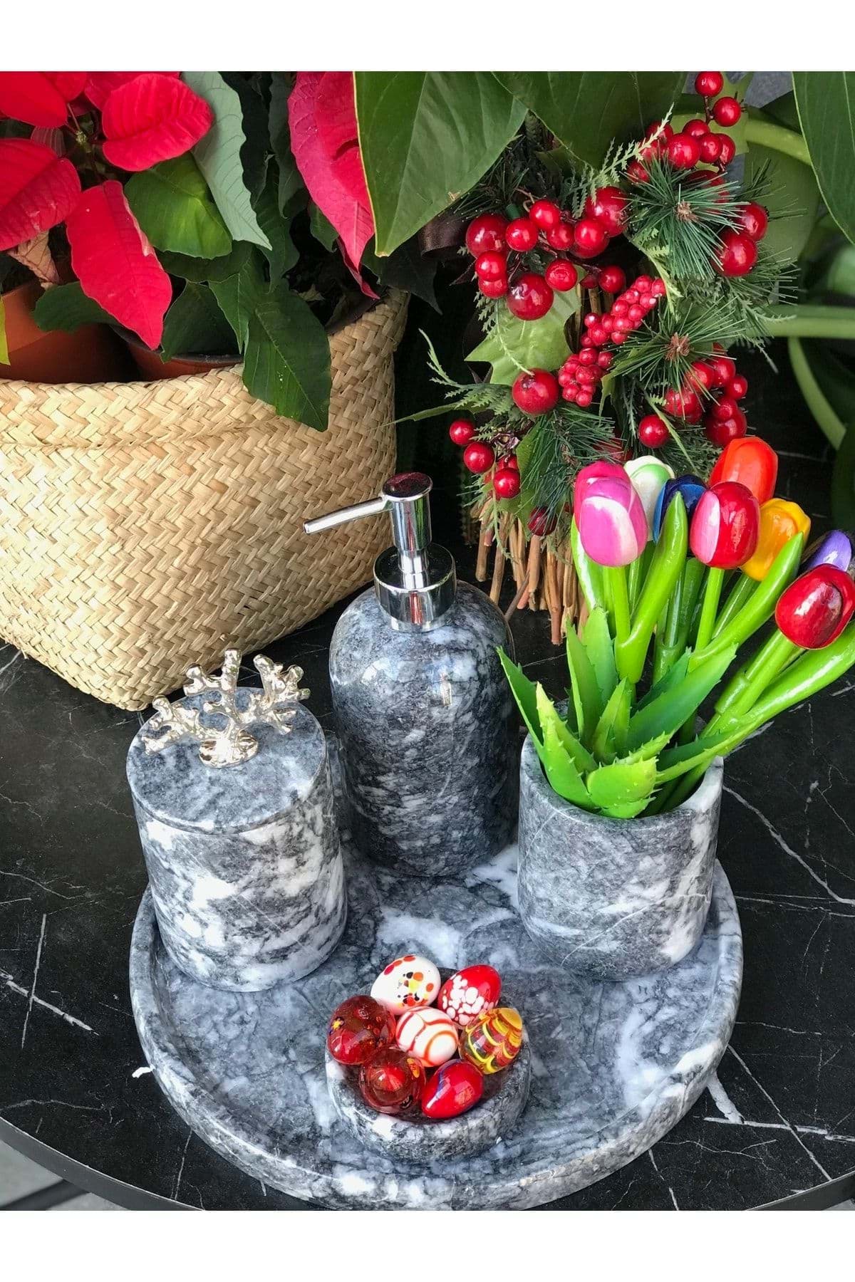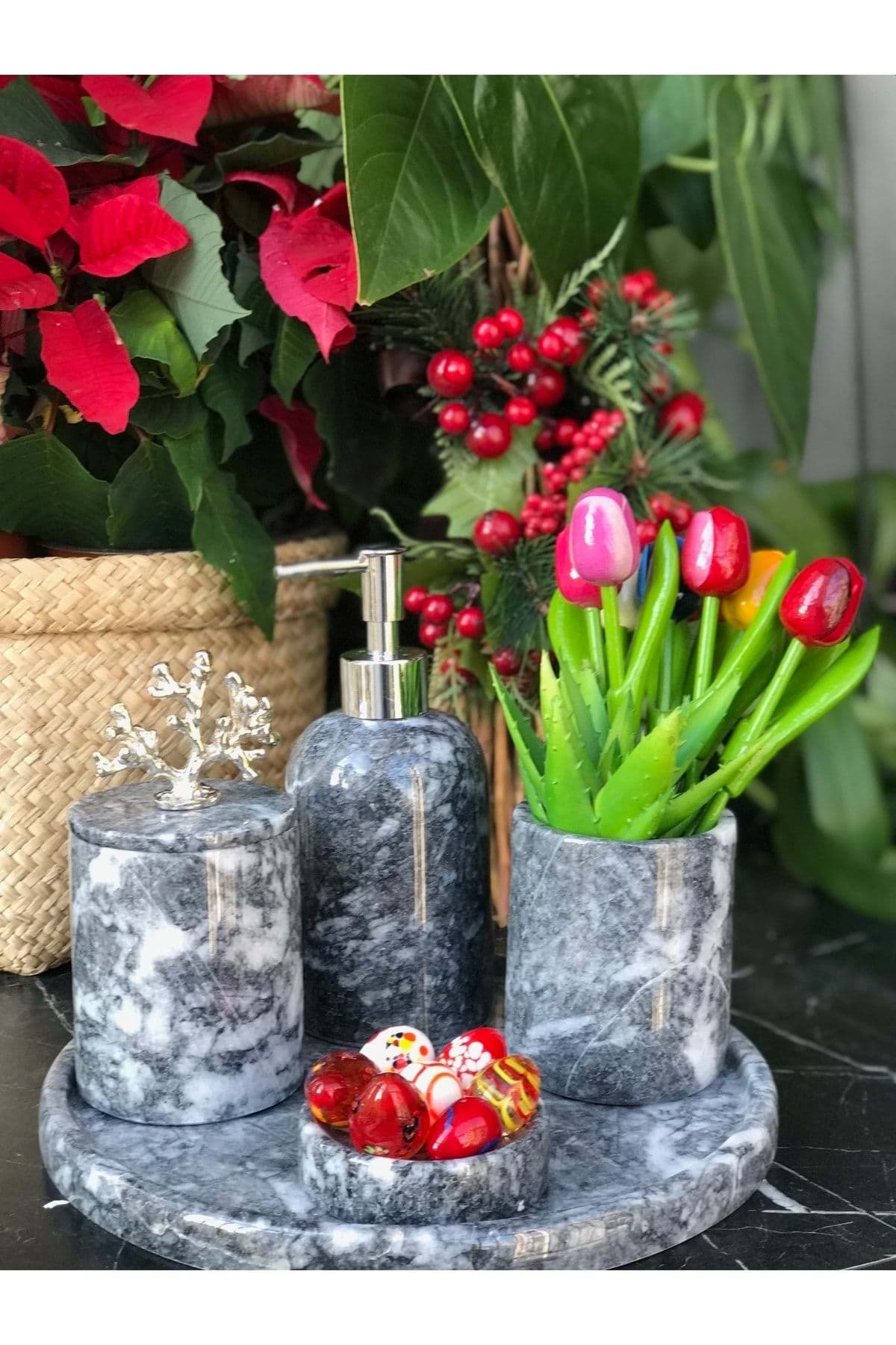 ÜRÜN %100 GER Ç EK DO Ğ AL MERMERDEN ÜRETİLMİ Ş TİR. ; TEPSİ ÇAP 30 CM ; SIVI SABUNLUK ÇAP 8 CM Y ÜKSEKLİK 11 CM ; KATI SABUNLUK ÇAP 11 CM ; D İ Ş FIRÇALIK ÇAP 8 CM Y ÜKSEKLİK 10 CM ; PAMUKLUK ÇAP 8.5 CM Y ÜKSEKLİK 11 CM ; ÜRÜN KOYURENK VE PİRİN Ç MERCAN AKSESUAR DETAYLIDIR. ; GÜMÜŞ RENK AKSESUAR DETAYLIDIR ;