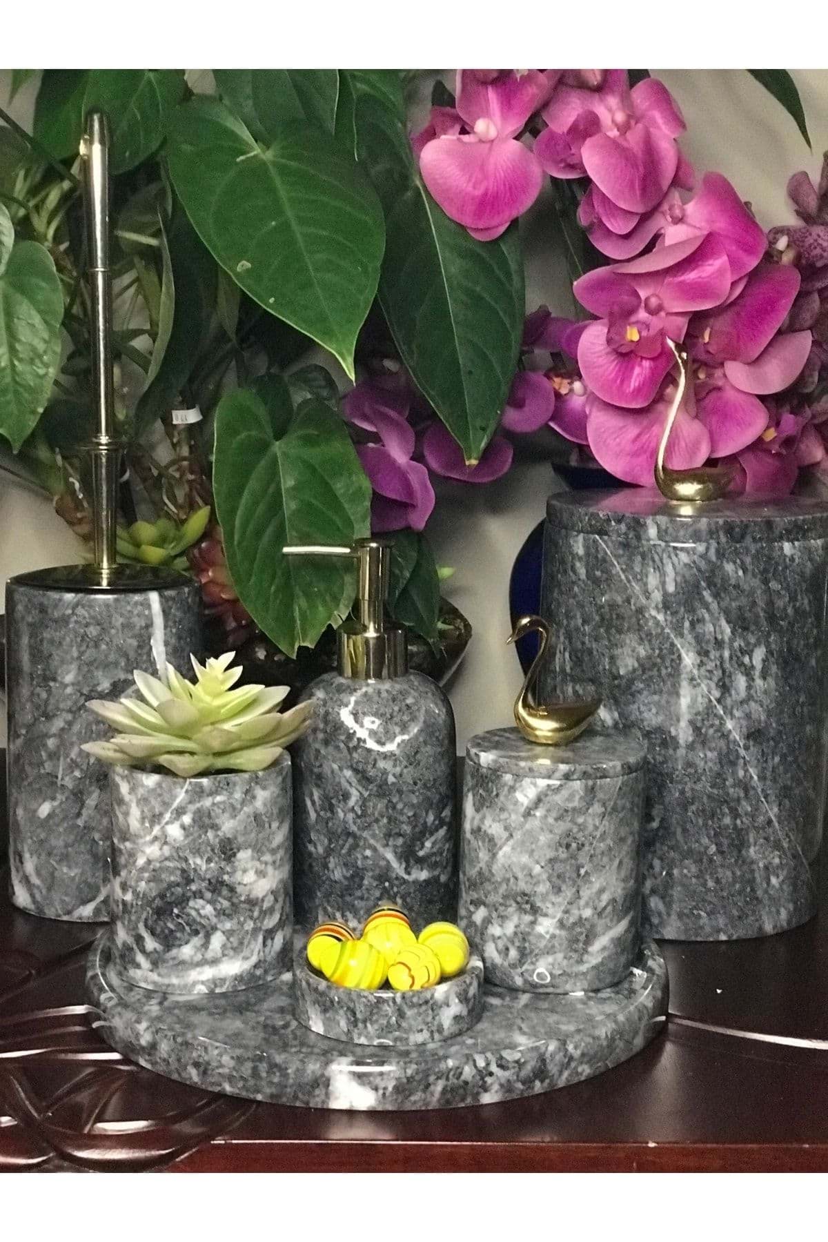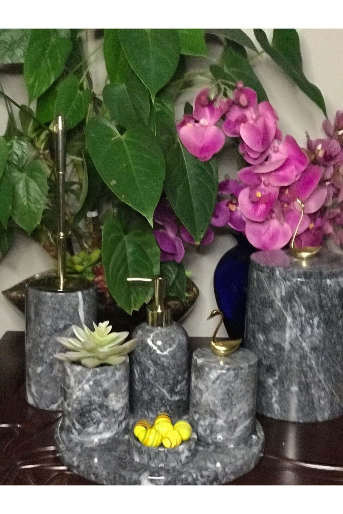 ÜRÜN %100 GERÇEK DOĞAL MERMERDEN ÜRETİLMİŞTİR. ; TEPSİ ÇAP 30 CM ; SIVI SABUNLUK ÇAP 8 CM YÜKSEKLİK 11 CM ; KATI SABUNLUK ÇAP 11 CM ; DİŞ FIRÇALIK ÇAP 8 CM YÜKSEKLİK 10 CM ; PAMUKLUK ÇAP 8.5 CM YÜKSEKLİK 11 CM ; TUVALET FIR ÇALIK ÇAP 10 CM YÜKSEKLİK 15 CM ; ÇÖP KOVASI ÇAP 15 CM YÜKSEKLİK 21 CM ; ÜRÜN KOYU GRI RENK VE PİRİNÇ KUŞ KUĞU AKSESUAR DETAYLIDIR. ; GOLD ALTIN RENK AKSESUAR DETAYLIDIR ;