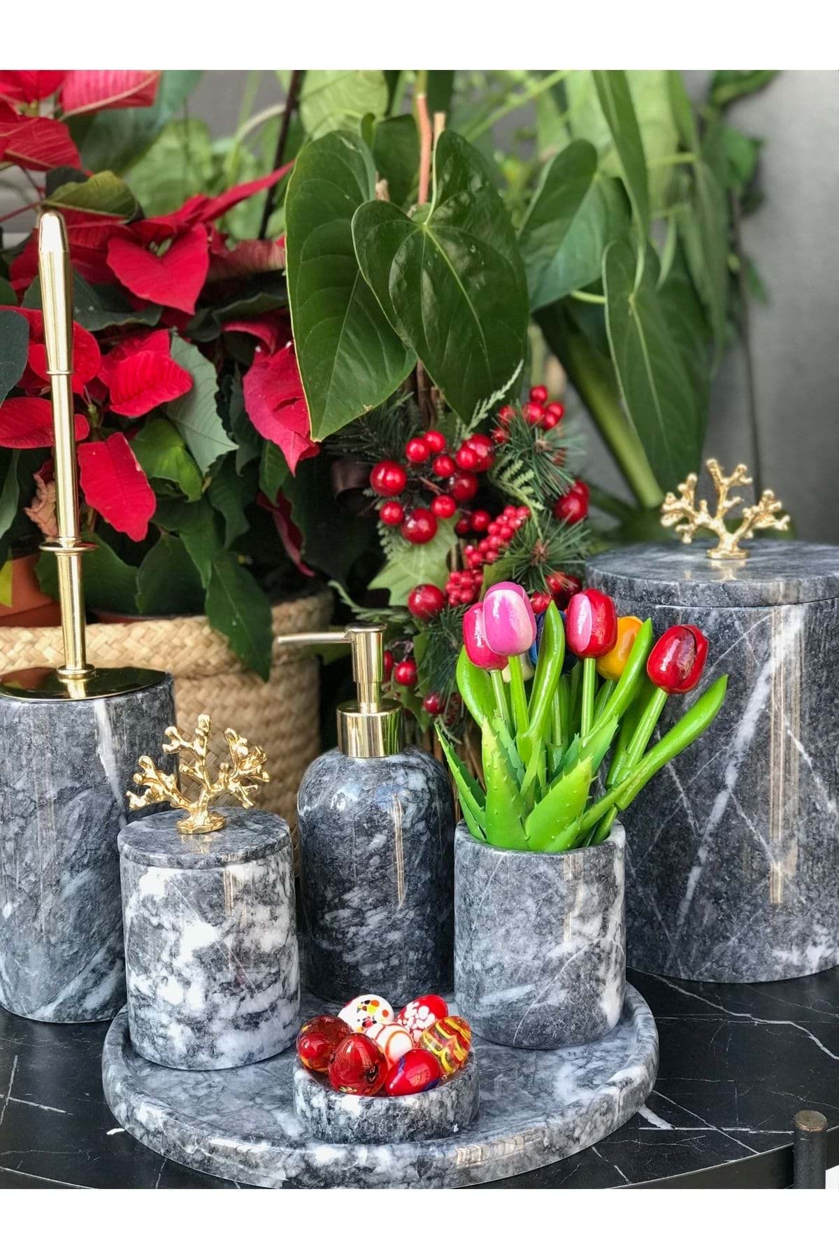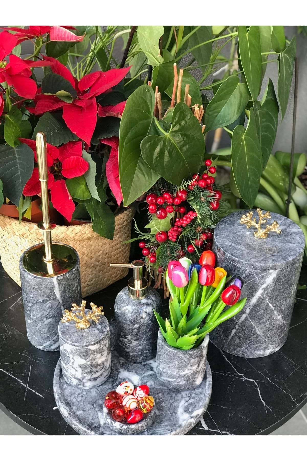 ÜRÜN %100 GER Ç EK DO ĞAL MERMERDEN ÜRETİLMİ Ş TİR. ; TEPSİ ÇAP 30 CM ; SIVI SABUNLUK ÇAP 8 CM Y ÜKSEKLİK 11 CM ; KATI SABUNLUK ÇAP 11 CM ; D İ Ş FIRÇALIK ÇAP 8 CM Y ÜKSEKLİK 10 CM ; PAMUKLUK ÇAP 8.5 CM Y ÜKSEKLİK 11 CM ; TUVALET FIR ÇALIK ÇAP 10 CM Y ÜKSEKLİK 15 CM ; ÇÖP KOVASI ÇAP 15 CM Y ÜKSEKLİK 21 CM ; ÜRÜN KOYU GRI RENK VE PİRİN Ç MERCAN AKSESUAR DETAYLIDIR. ; GOLDS RENK AKSESUAR DETAYLIDIR ;