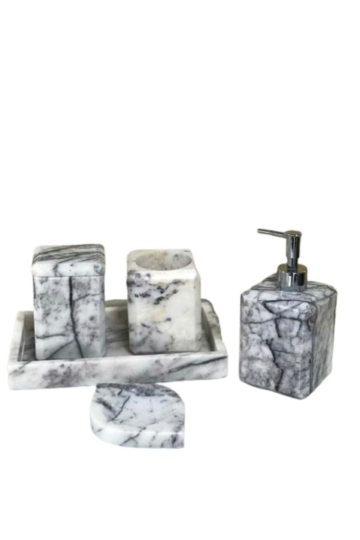 ÜRÜN %100 GER Ç EK DO ĞAL MERMERDEN ÜRETİLMİ Ş TİR. ; TEPSİ ÇAP 15x25x3 CM ; SIVI SABUNLUK ÇAP 8x8x12 CM ; KATI SABUNLUK ÇAP 11 CM ; D İ Ş FIRÇALIK ÇAP 8x8x11 CM ; PAMUKLUK 8x8x9 CM ; TUVALET FIR ÇALIK 10x10x15 CM ; ÇÖP KOVASI 15x20x25 CM ; ÜRÜN LEYLAK BEYAZ DAMARLI RENKTEDIR ; GÜMÜŞ RENK AKSESUAR DETAYLIDIR ;