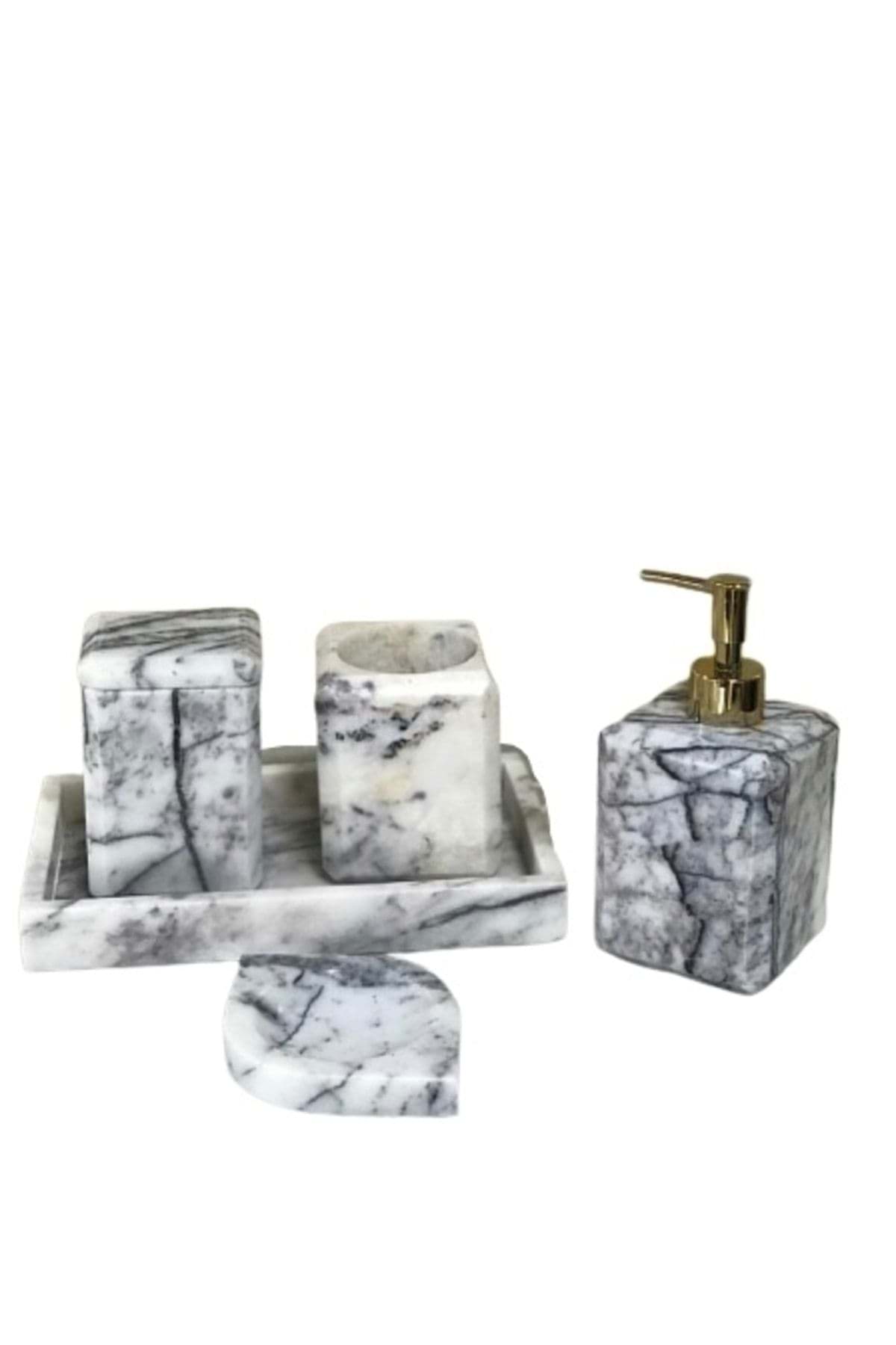 Ürün %100 gerçek doğal Mermerden üretilmiştir. ; Tepsi Çap 15x25x3 Cm ; Sıvı sabunluk Çap 8x8x12 cm ; Katı sabunluk Çap 11 cm ; Diş Fırçalık Çap 8x8x11 cm ; Pamukluk 8x8x9 cm ; Tuvalet fır Çalık 10x10x15 cm ; Çöp kovası 15x20x25 cm ; Ürün leylak beyaz damarlı renktedır ; Gold renk aksesuar detaylıdır ;