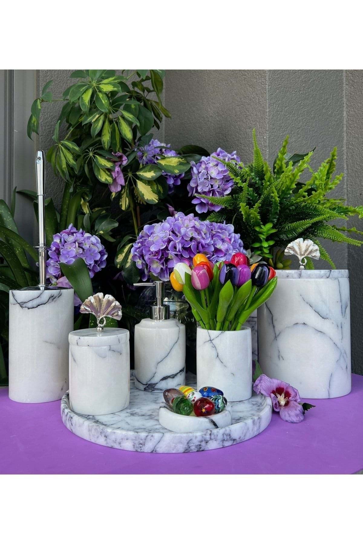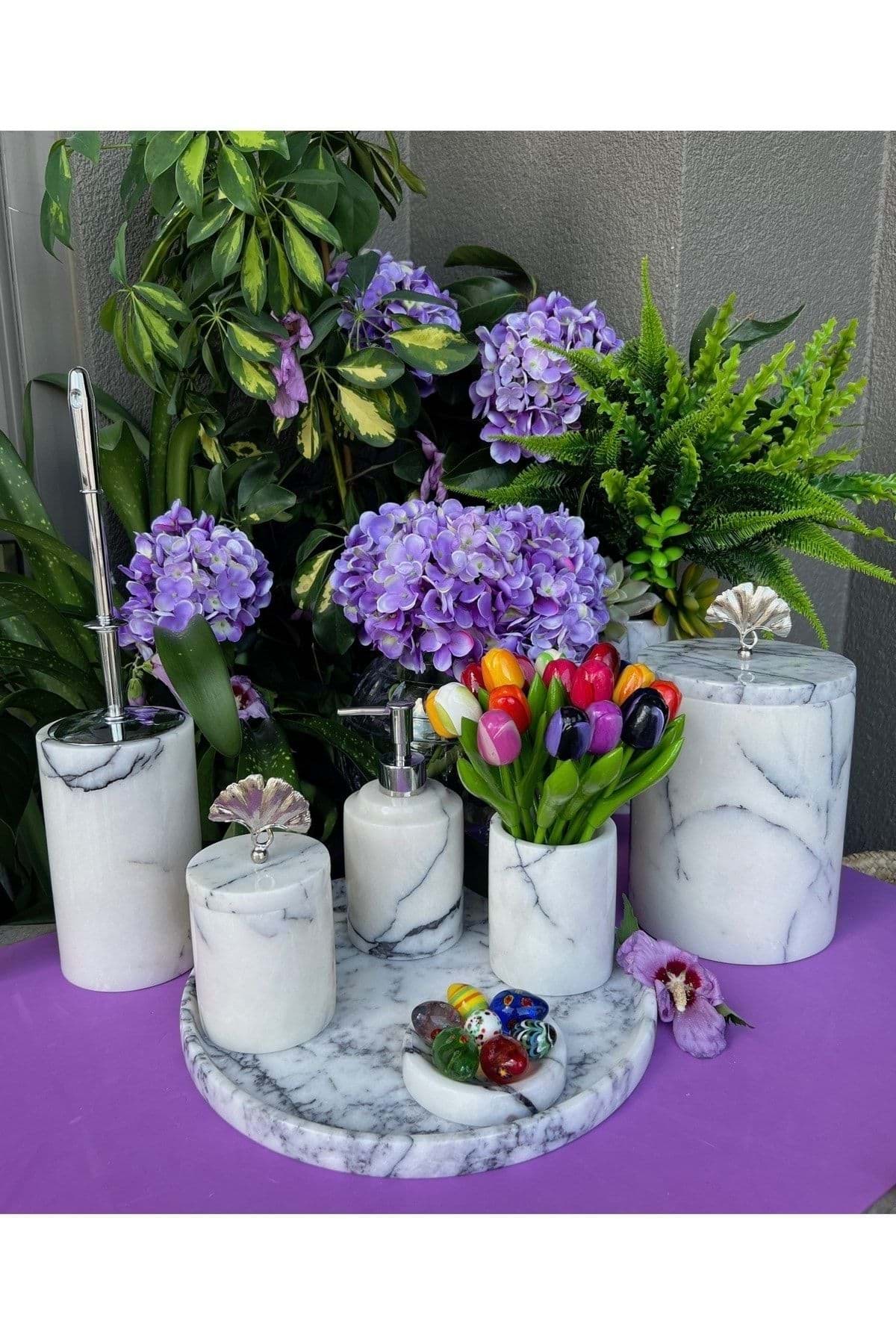 ÜRÜN %100 GERÇEK DOĞAL MERMERDEN ÜRETİLMİŞTİR ; TEPSİ ÇAP 30 CM ; SIVI SABUNLUK ÇAP 8 CM YÜKSEKLİK 11 CM ; KATI SABUNLUK ÇAP 11 CM ; DİŞ FIRÇALIK ÇAP 8 CM YÜKSEKLİK 10 CM ; PAMUKLUK ÇAP 8.5 CM YÜKSEKLİK 11 CM ; TUVALET FIRÇASI ÇAP 10 CM YÜKSEKLİK 15 CM ; ÇÖP KOVASI ÇAP 15 CM YÜKSEKLİK 21 CM ; ÜRÜN LEYLAK BEYAZ RENK VE PİRİNÇ GONK ÇİÇEK AKSESUAR DETAYLIDIR. ; GÜMÜŞ RENK AKSESUAR DETAYLIDIR ;
