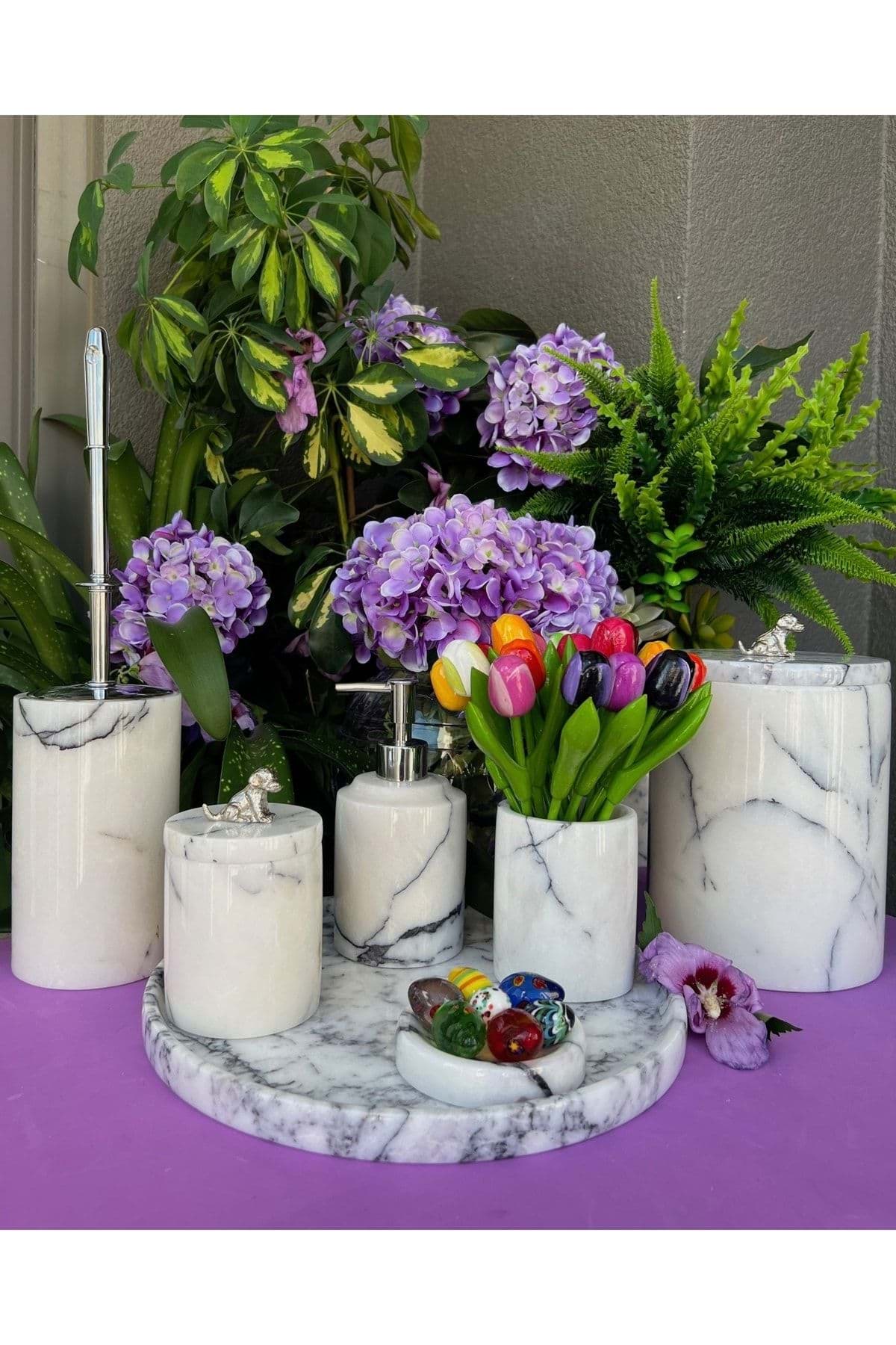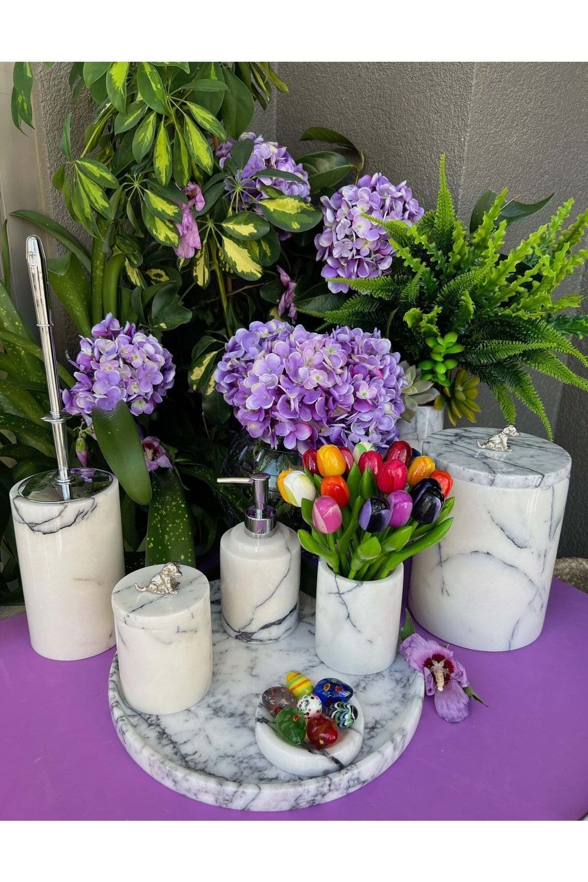 ÜRÜN %100 GERÇEK DOĞAL MERMERDEN ÜRETİLMİŞTİR ; TEPSİ ÇAP 30 CM ; SIVI SABUNLUK ÇAP 8 CM YÜKSEKLİK 11 CM ; KATI SABUNLUK ÇAP 11 CM ; DİŞ FIRÇALIK ÇAP 8 CM YÜKSEKLİK 10 CM ; PAMUKLUK ÇAP 8.5 CM YÜKSEKLİK 11 CM ; TUVALET FIRÇASI ÇAP 10 CM YÜKSEKLİK 15 CM ; ÇÖP KOVASI ÇAP 15 CM YÜKSEKLİK 21 CM ; ÜRÜN LEYLAK BEYAZ RENK VE PİRİNÇ KÖPEK AKSESUAR DETAYLIDIR. ; GÜMÜŞ RENK AKSESUAR DETAYLIDIR ;