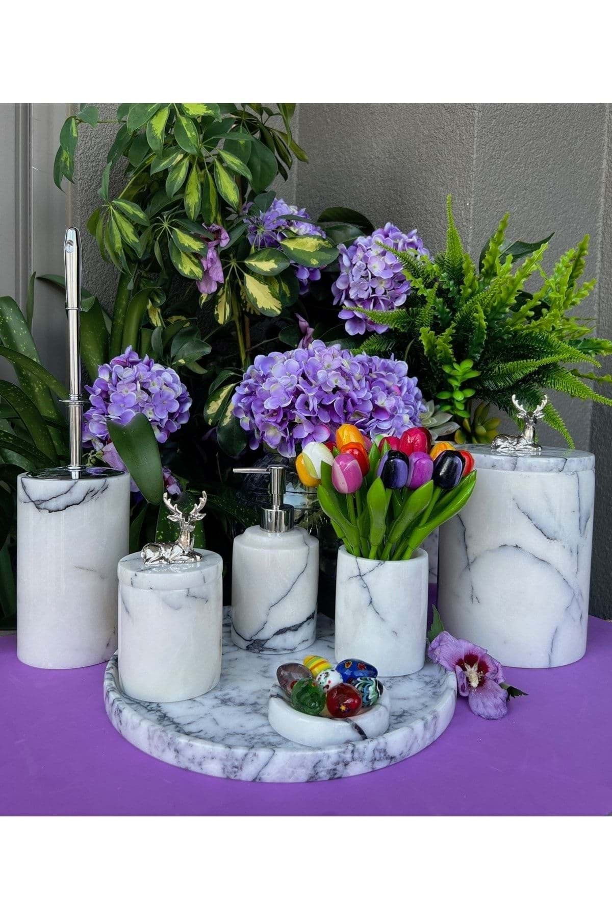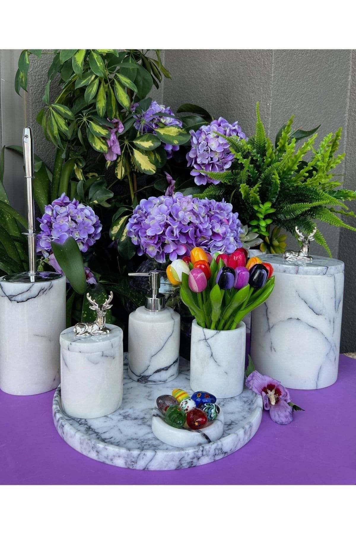 ÜRÜN %100 GERÇEK DOĞAL MERMERDEN ÜRETİLMİŞTİR ; TEPSİ ÇAP 30 CM ; SIVI SABUNLUK ÇAP 8 CM YÜKSEKLİK 11 CM ; KATI SABUNLUK ÇAP 11 CM ; DİŞ FIRÇALIK ÇAP 8 CM YÜKSEKLİK 10 CM ; PAMUKLUK ÇAP 8.5 CM YÜKSEKLİK 11 CM ; TUVALET FIRÇASI ÇAP 10 CM YÜKSEKLİK 15 CM ; ÇÖP KOVASI ÇAP 15 CM YÜKSEKLİK 21 CM ; ÜRÜN LEYLAK BEYAZ RENK VE PİRİNÇ OTURAN GEYİK AKSESUAR DETAYLIDIR. ; GÜMÜŞ RENK AKSESUAR DETAYLIDIR ;
