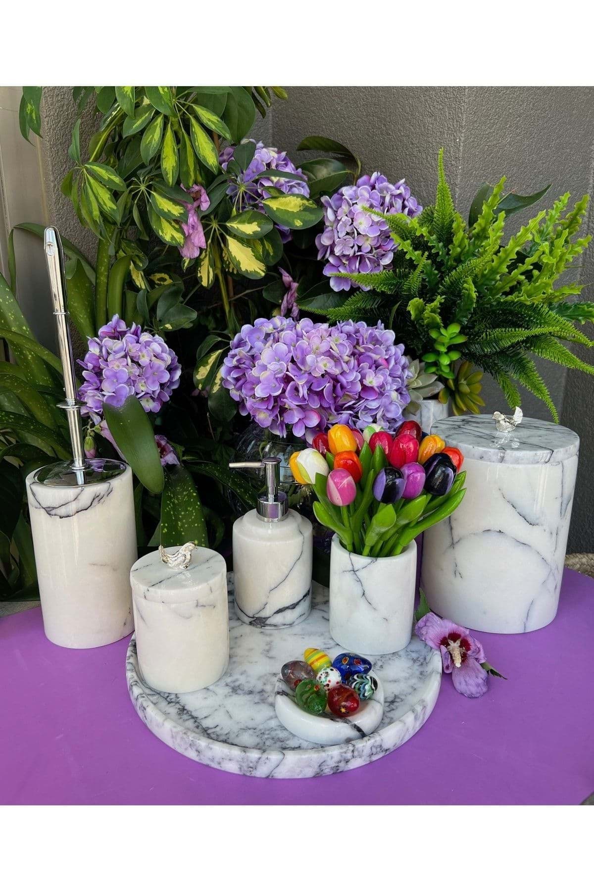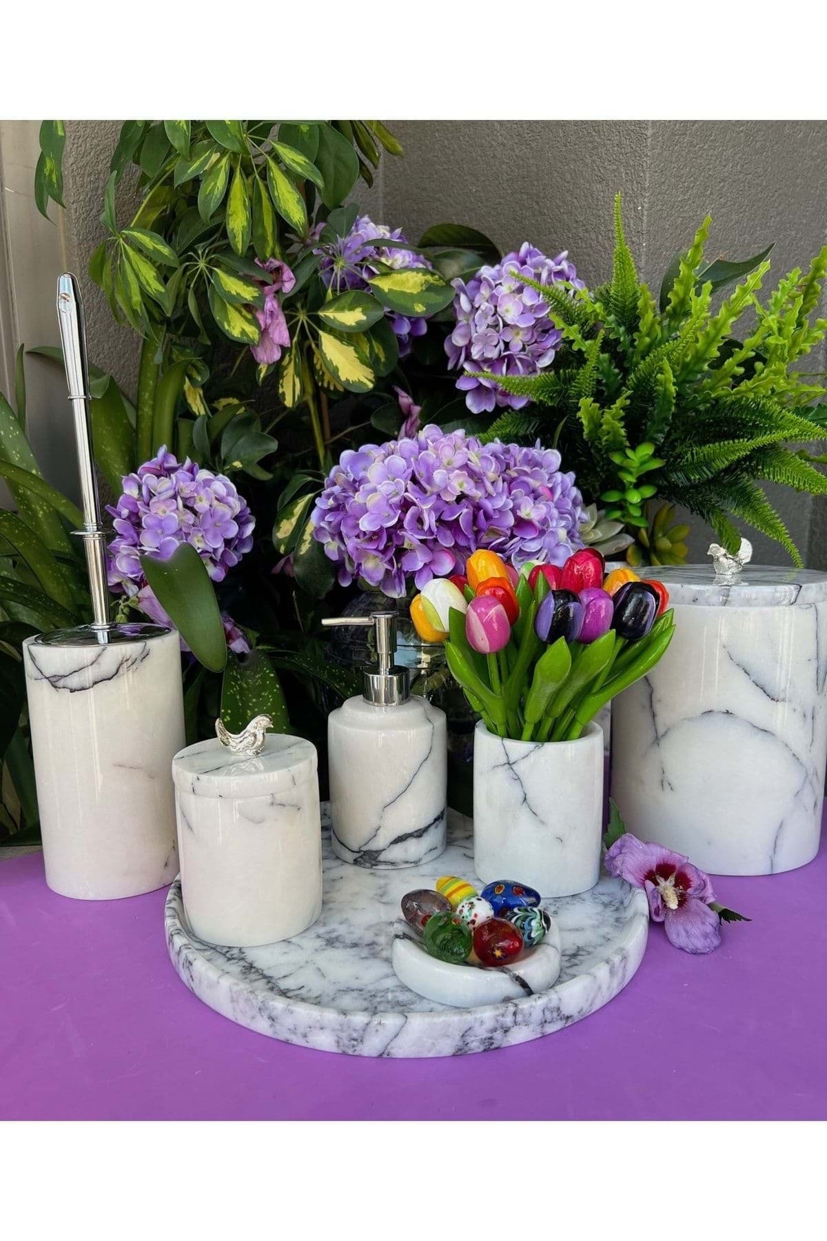 ÜRÜN %100 GERÇEK DOĞAL MERMERDEN ÜRETİLMİŞTİR ; TEPSİ ÇAP 30 CM ; SIVI SABUNLUK ÇAP 8 CM YÜKSEKLİK 11 CM ; KATI SABUNLUK ÇAP 11 CM ; DİŞ FIRÇALIK ÇAP 8 CM YÜKSEKLİK 10 CM ; PAMUKLUK ÇAP 8.5 CM YÜKSEKLİK 11 CM ; TUVALET FIRÇASI ÇAP 10 CM YÜKSEKLİK 15 CM ; ÇÖP KOVASI ÇAP 15 CM YÜKSEKLİK 21 CM ; ÜRÜN LEYLAK BEYAZ RENK VE PİRİNÇ SERÇE AKSESUAR DETAYLIDIR. ; GÜMÜŞ RENK AKSESUAR DETAYLIDIR ;