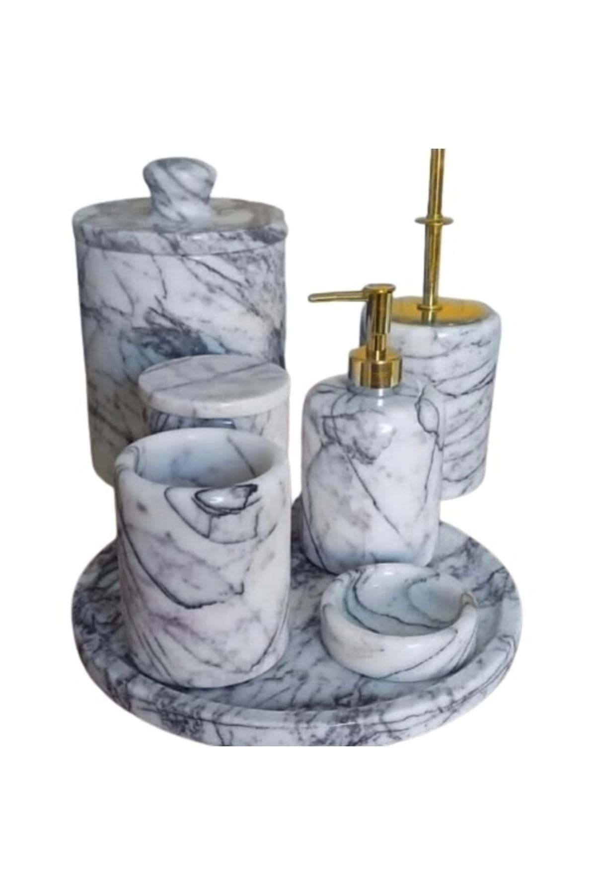 ÜRÜN %100 GERÇEK DOĞAL MERMERDEN ÜRETİLMİŞTİR. ; TEPSİ ÇAP 30 CM ; SIVI SABUNLUK ÇAP 8 CM YÜKSEKLİK 11 CM ; KATI SABUNLUK ÇAP 11 CM ; DİŞ FIRÇALIK ÇAP 8 CM YÜKSEKLİK 10 CM ; PAMUKLUK ÇAP 8.5 CMYÜKSEKLİK 11 CM ; TUVALET FIR ÇALIK ÇAP 10 CM YÜKSEKLİK 15 CM ; ÇÖP KOVASI ÇAP 15 CM YÜKSEKLİK 21 CM ; ÜRÜN LEYLAK BEYAZ RENKTIR ; GOLD ALTIN RENK AKSESUAR DETAYLIDIR ;