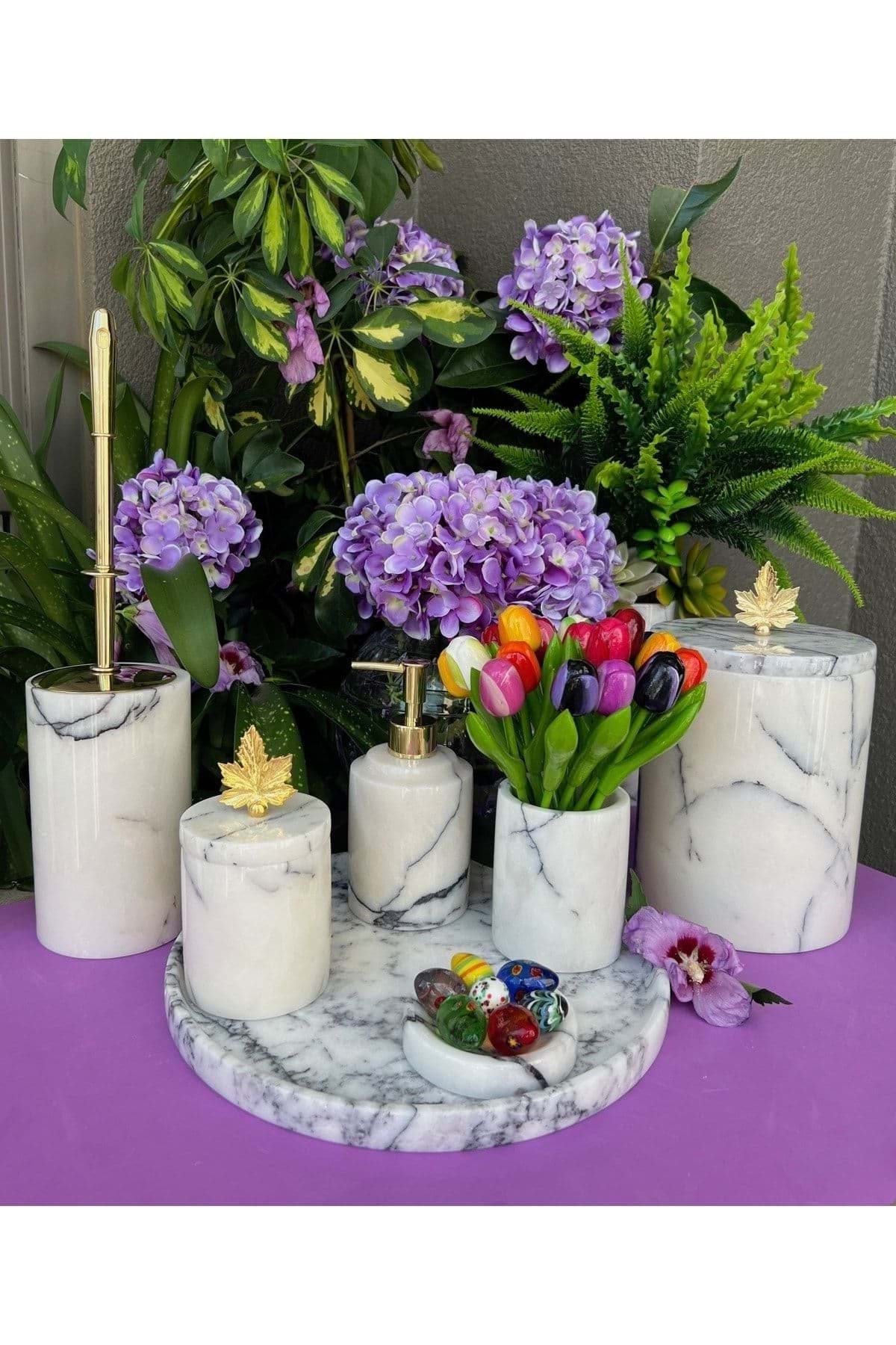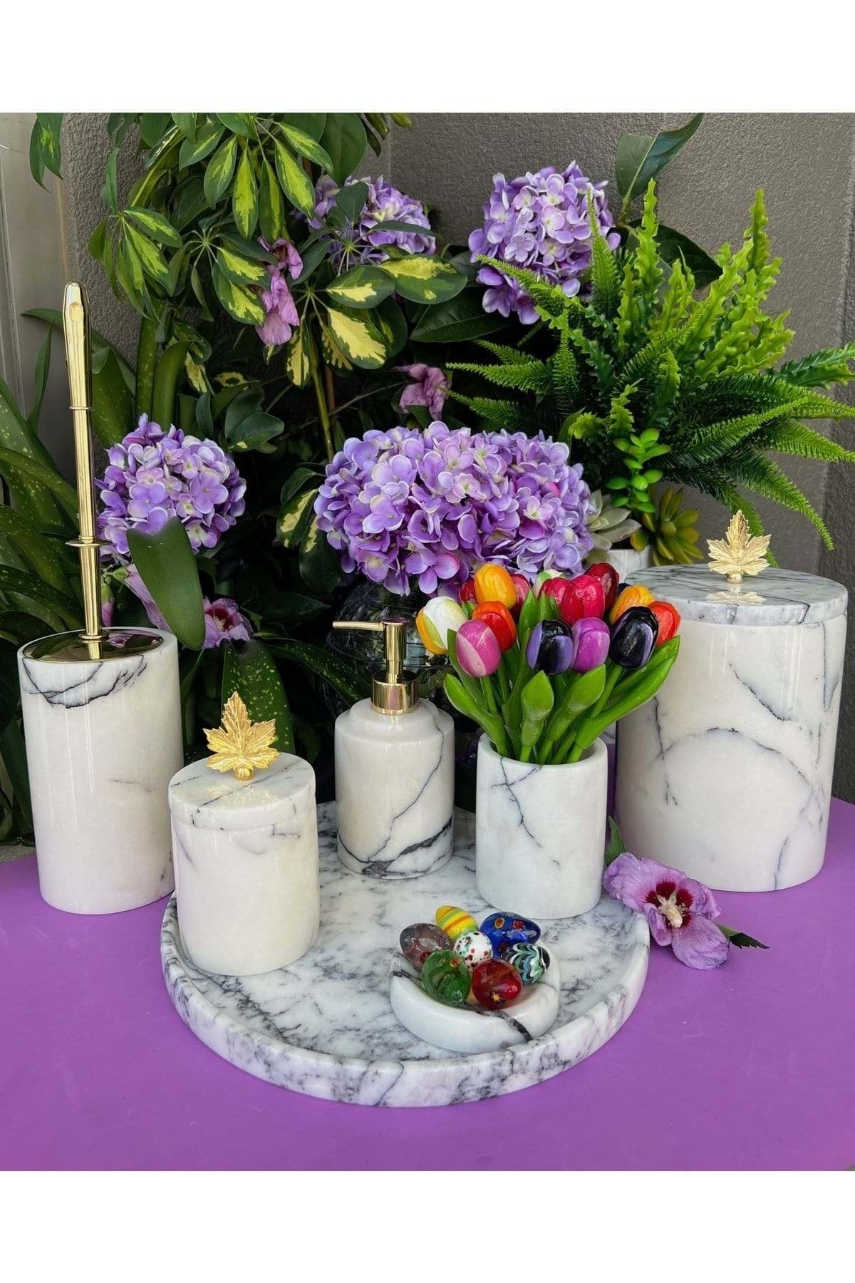 ÜRÜN %100 GERÇEK DOĞAL MERMERDEN ÜRETİLMİŞTİR ; TEPSİ ÇAP 30 CM ; SIVI SABUNLUK ÇAP 8 CM YÜKSEKLİK 11 CM ; KATI SABUNLUK ÇAP 11 CM ; DİŞ FIRÇALIK ÇAP 8 CM YÜKSEKLİK 10 CM ; PAMUKLUK ÇAP 8.5 CM YÜKSEKLİK 11 CM ; TUVALET FIRÇASI ÇAP 10 CM YÜKSEKLİK 15 CM ; ÇÖP KOVASI ÇAP 15 CM YÜKSEKLİK 21 CM ; ÜRÜN LEYLAK BEYAZ RENK VE PİRİNÇ ÇINAR YAPRAĞI AKSESUAR DETAYLIDIR. ; GOLD RENK AKSESUAR DETAYLIDIR ;