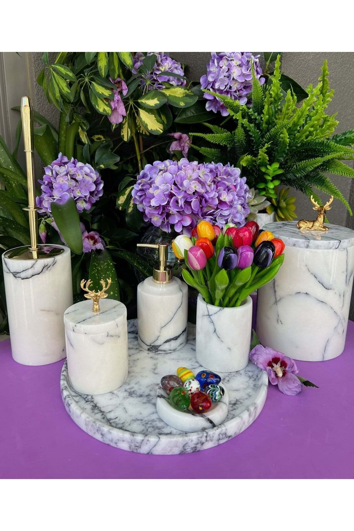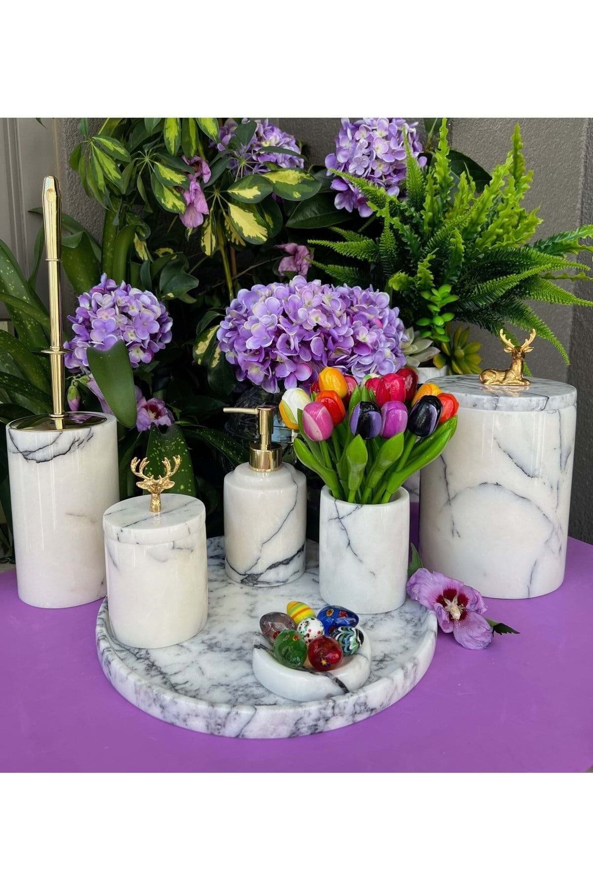 ÜRÜN %100 GERÇEK DOĞAL MERMERDEN ÜRETİLMİŞTİR ; TEPSİ ÇAP 30 CM ; SIVI SABUNLUK ÇAP 8 CM YÜKSEKLİK 11 CM ; KATI SABUNLUK ÇAP 11 CM ; DİŞ FIRÇALIK ÇAP 8 CM YÜKSEKLİK 10 CM ; PAMUKLUK ÇAP 8.5 CM YÜKSEKLİK 11 CM ; TUVALET FIRÇASI ÇAP 10 CM YÜKSEKLİK 15 CM ; ÇÖP KOVASI ÇAP 15 CM YÜKSEKLİK 21 CM ; ÜRÜN LEYLAK BEYAZ RENK VE PİRİNÇ GEYİK FARKLI AKSESUAR DETAYLIDIR. ; GOLDRENK AKSESUAR DETAYLIDIR ;