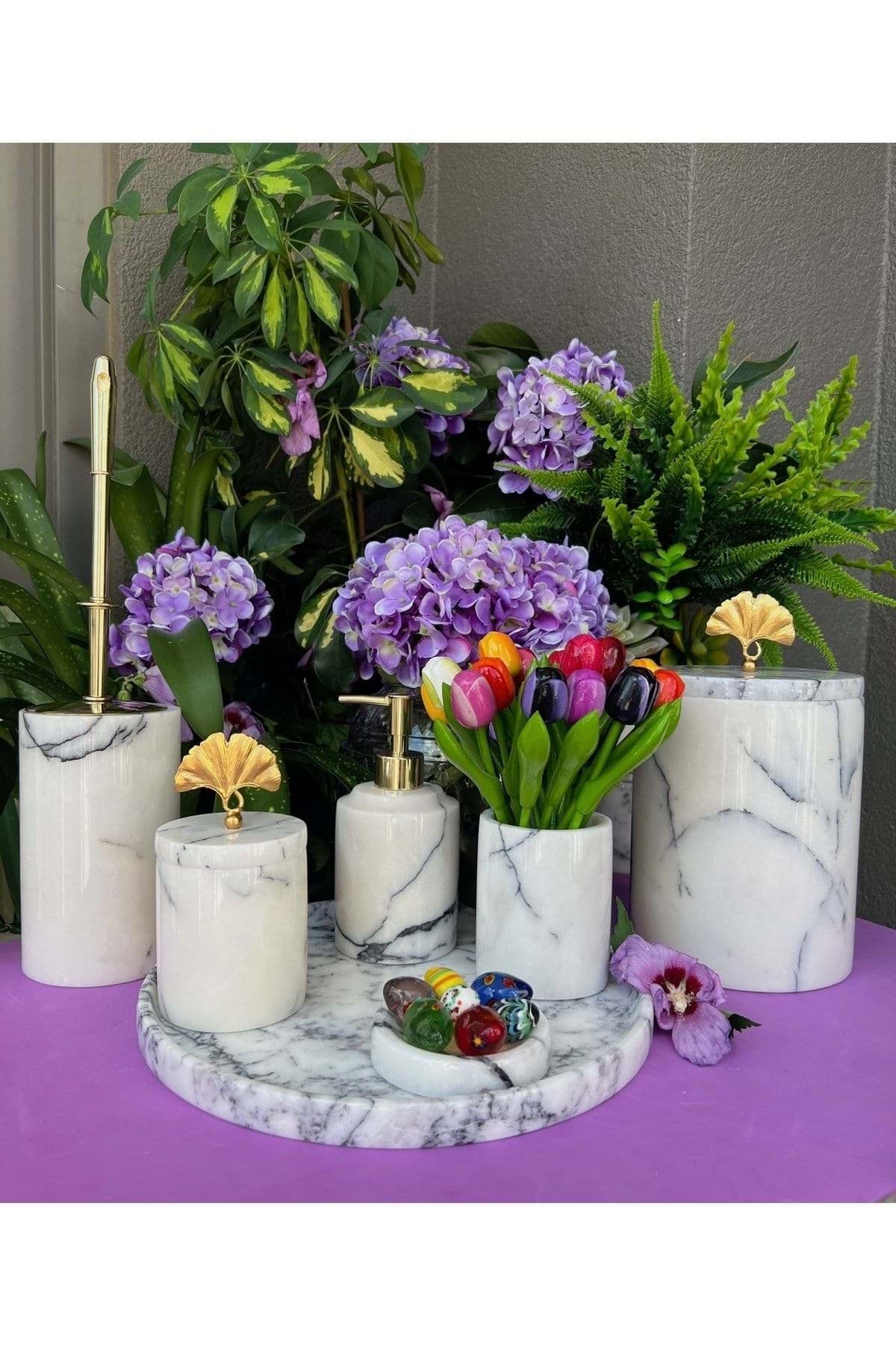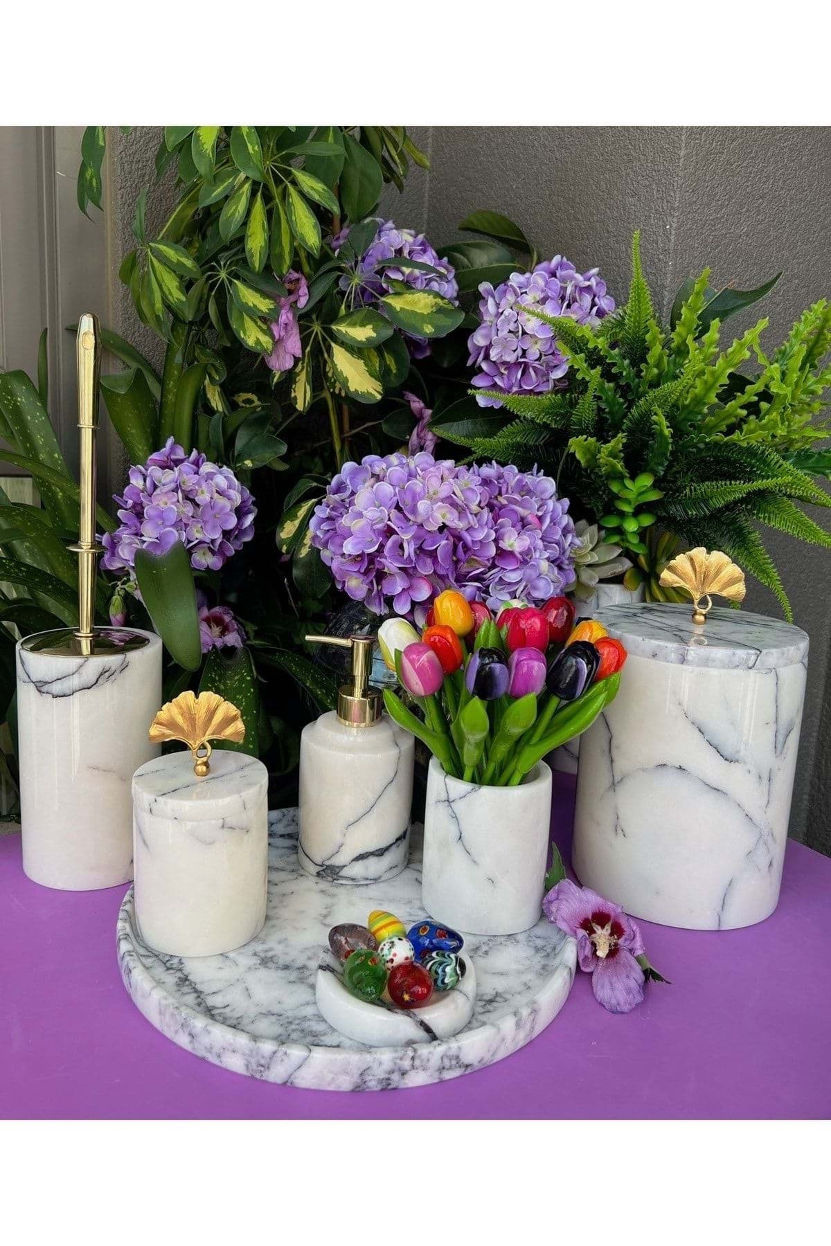ÜRÜN %100 GERÇEK DOĞAL MERMERDEN ÜRETİLMİŞTİR ; TEPSİ ÇAP 30 CM ; SIVI SABUNLUK ÇAP 8 CM YÜKSEKLİK 11 CM ; KATI SABUNLUK ÇAP 11 CM ; DİŞ FIRÇALIK ÇAP 8 CM YÜKSEKLİK 10 CM ; PAMUKLUK ÇAP 8.5 CM YÜKSEKLİK 11 CM ; TUVALET FIRÇASI ÇAP 10 CM YÜKSEKLİK 15 CM ; ÇÖP KOVASI ÇAP 15 CM YÜKSEKLİK 21 CM ; ÜRÜN LEYLAK BEYAZ RENK VE PİRİNÇ GONK ÇİÇEK AKSESUAR DETAYLIDIR. ; GOLD RENK AKSESUAR DETAYLIDIR ;