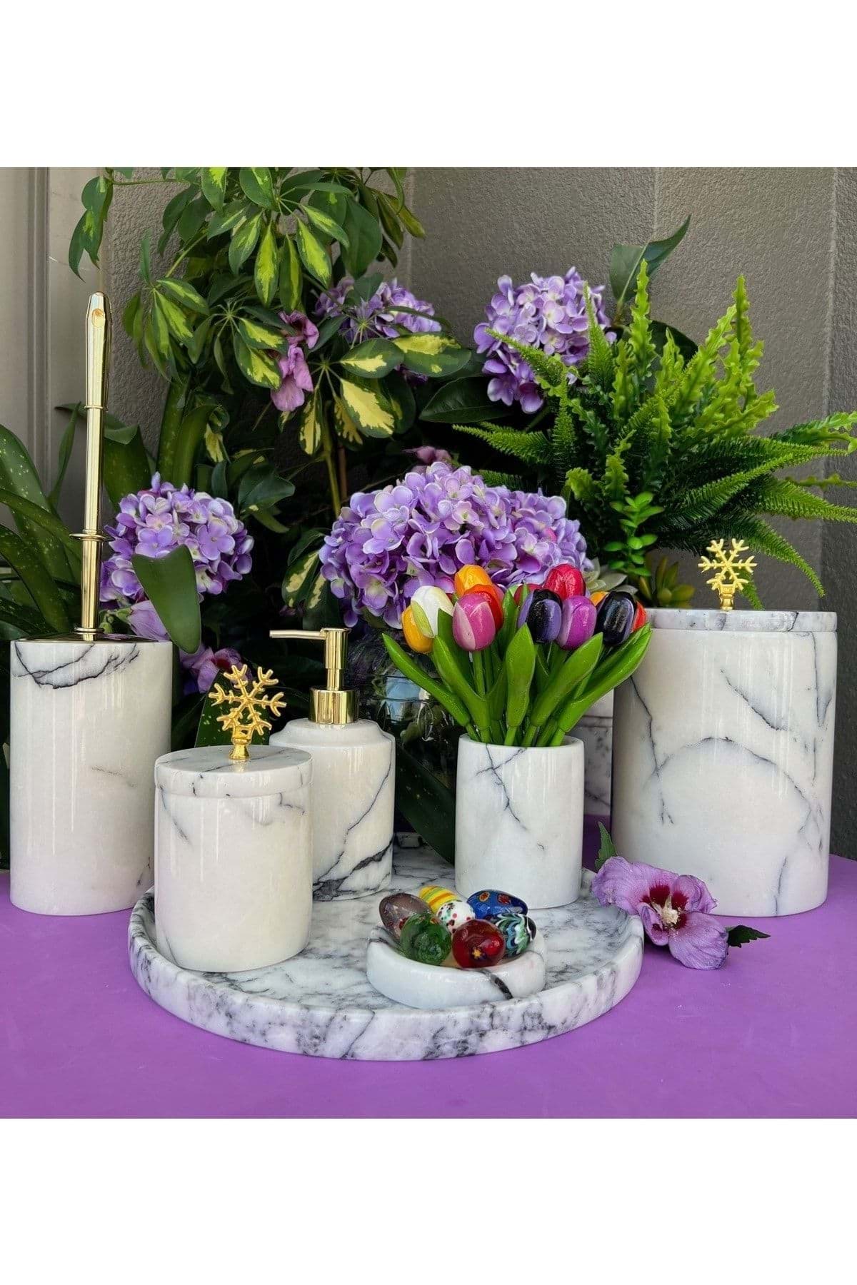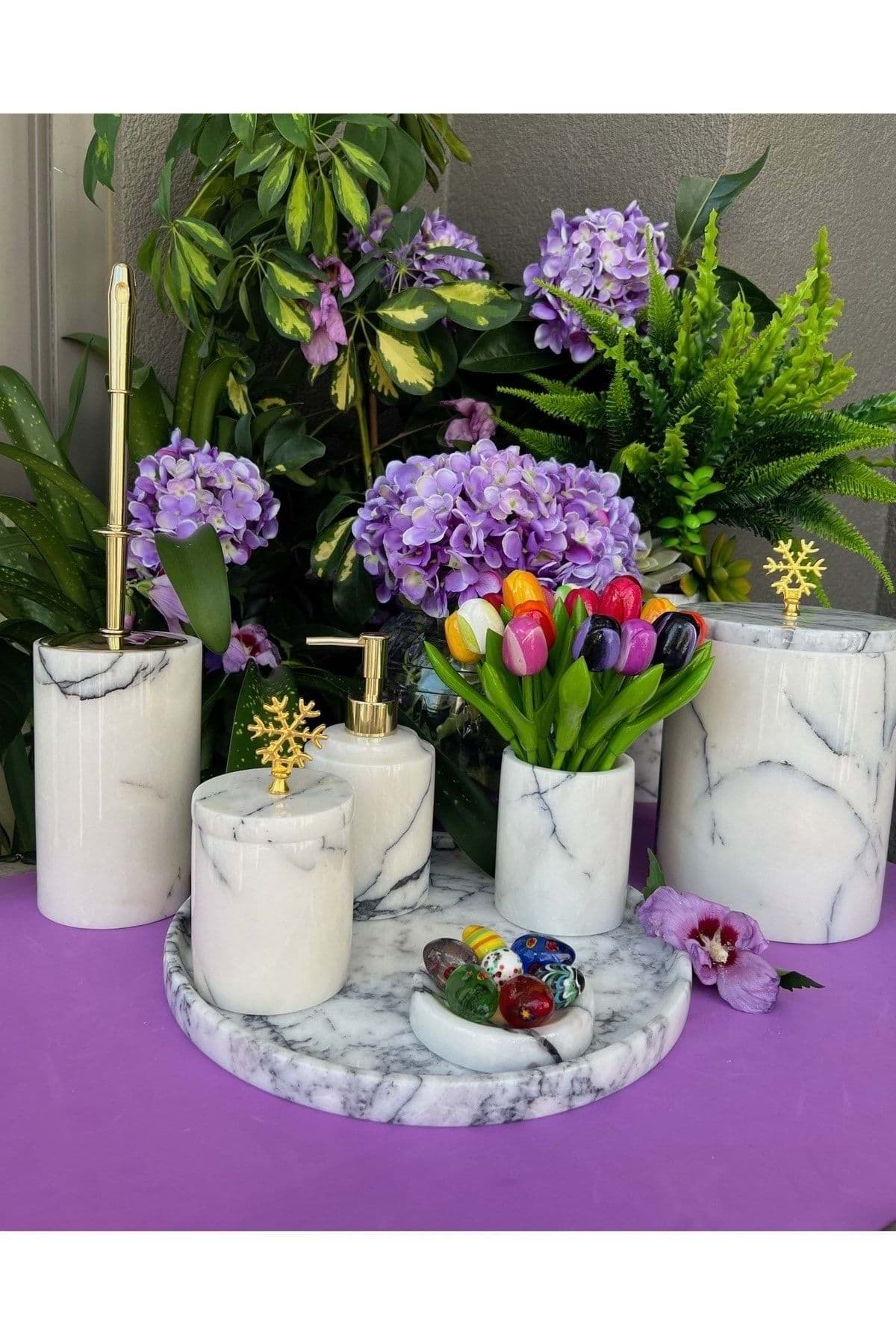 ÜRÜN %100 GERÇEK DOĞAL MERMERDEN ÜRETİLMİŞTİR ; TEPSİ ÇAP 30 CM ; SIVI SABUNLUK ÇAP 8 CM YÜKSEKLİK 11 CM ; KATI SABUNLUK ÇAP 11 CM ; DİŞ FIRÇALIK ÇAP 8 CM YÜKSEKLİK 10 CM ; PAMUKLUK ÇAP 8.5 CM YÜKSEKLİK 11 CM ; TUVALET FIR ÇALIK ÇAP 10 CM Y ÜKSEKLİK 15 CM ; ÇÖP KOVASI ÇAP 15 CM YÜKSEKLİK 21 CM ; ÜRÜN LEYLAK BEYAZ RENK VE PİRİNÇ KAR TANESİ AKSESUAR DETAYLIDIR. ; GOLD RENK AKSESUAR DETAYLIDIR ;