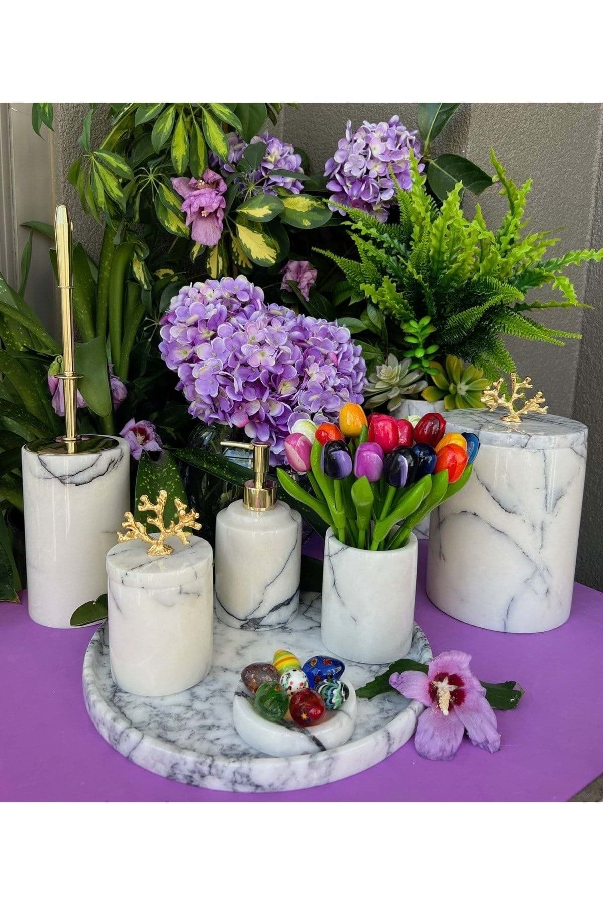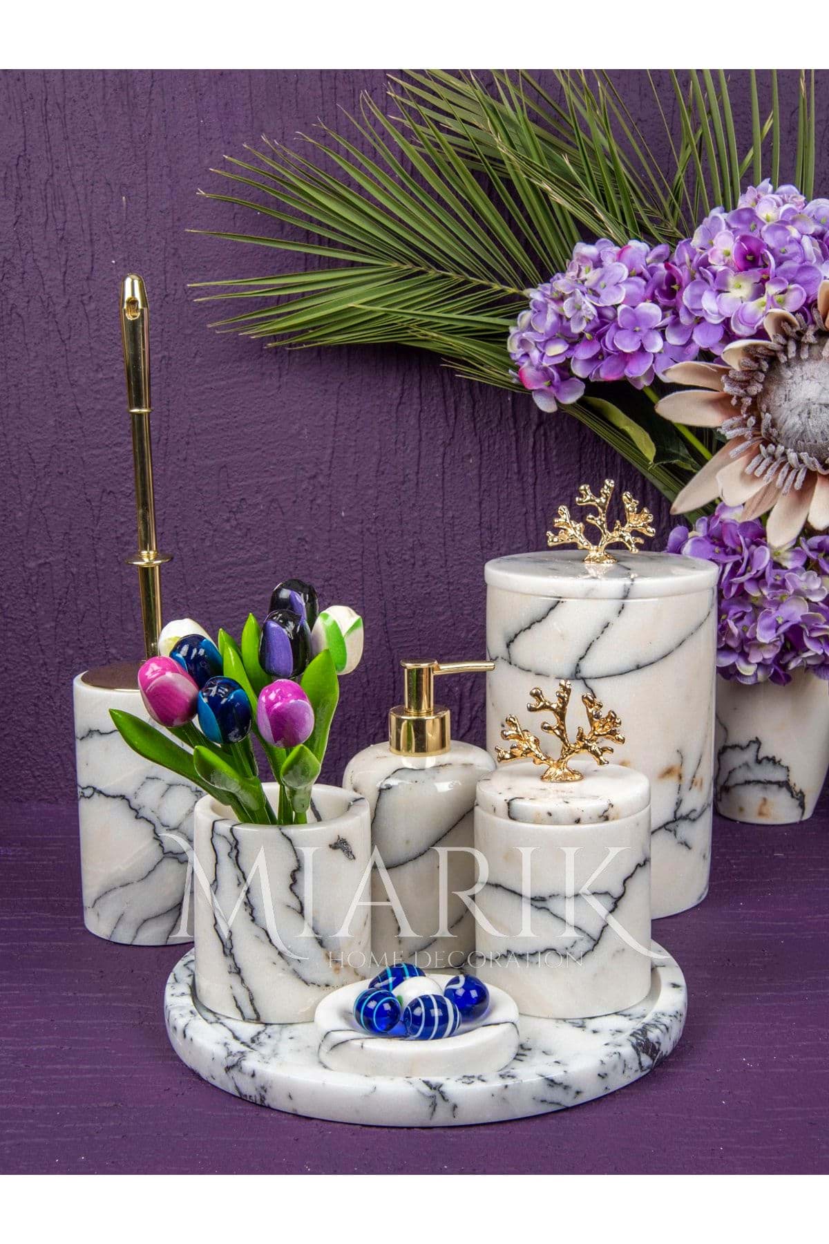 ÜRÜN %100 GERÇEK DOĞAL MERMERDEN ÜRETİLMİŞTİR ; TEPSİ ÇAP 30 CM ; SIVI SABUNLUK ÇAP 8 CM YÜKSEKLİK 11 CM ; KATI SABUNLUK ÇAP 11 CM ; DİŞ FIRÇALIK ÇAP 8 CM YÜKSEKLİK 10 CM ; PAMUKLUK ÇAP 8.5 CM YÜKSEKLİK 11 CM ; TUVALET FIR ÇALIK ÇAP 10 CM YÜKSEKLİK 15 CM ; ÇÖP KOVASI ÇAP 15 CM YÜKSEKLİK 21 CM ; ÜRÜN LEYLAK BEYAZ RENK VE PİRİNÇ MERCAN AKSESUAR DETAYLIDIR. ; GOLD ALTIN RENK AKSESUAR DETAYLIDIR ;