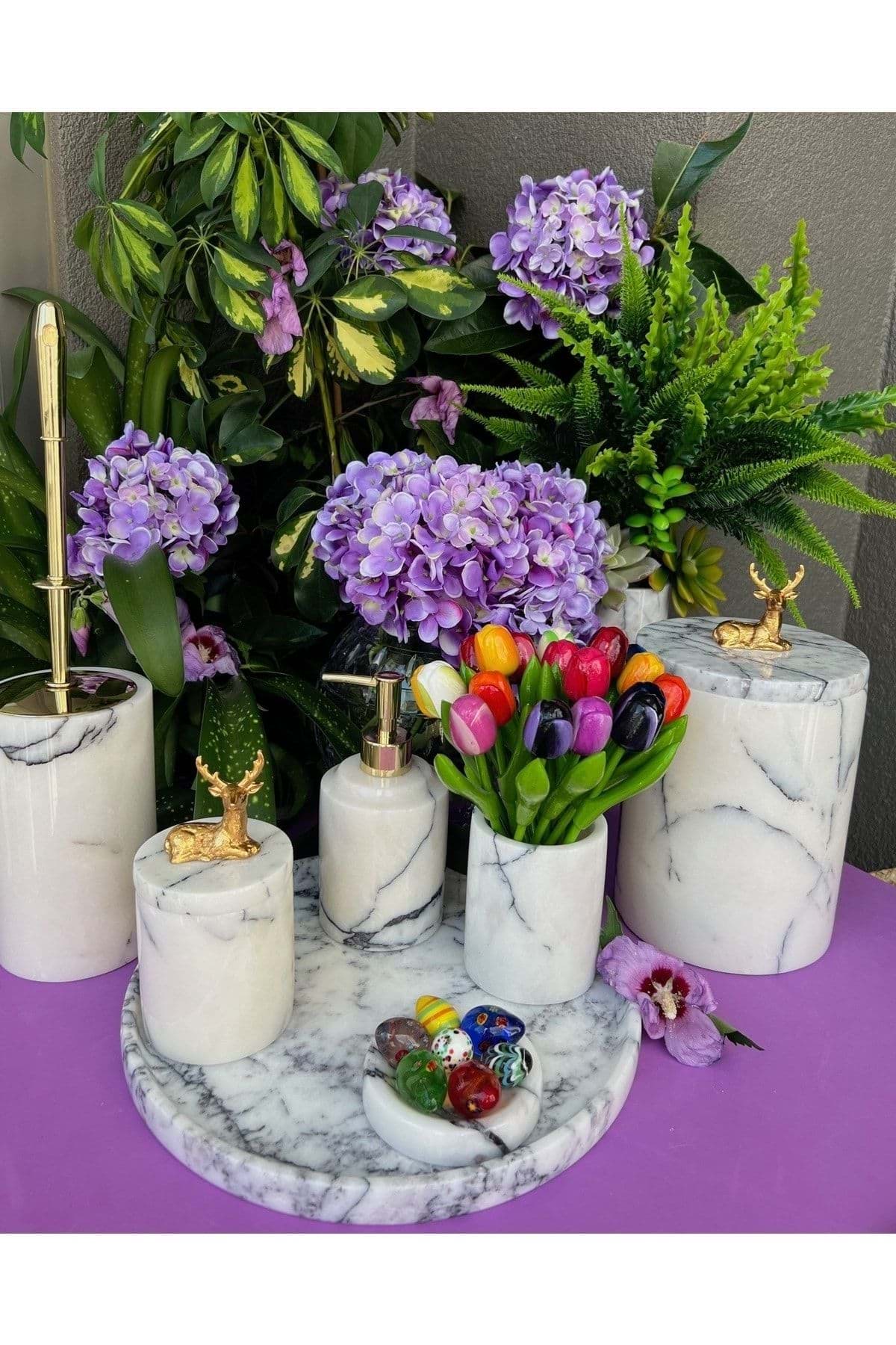 ÜRÜN %100 GERÇEK DOĞAL MERMERDEN ÜRETİLMİŞTİR ; TEPSİ ÇAP 30 CM ; SIVI SABUNLUK ÇAP 8 CM YÜKSEKLİK 11 CM ; KATI SABUNLUK ÇAP 11 CM ; DİŞ FIRÇALIK ÇAP 8 CM YÜKSEKLİK 10 CM ; PAMUKLUK ÇAP 8.5 CM YÜKSEKLİK 11 CM ; TUVALET FIRÇASI ÇAP 10 CM YÜKSEKLİK 15 CM ; ÇÖP KOVASI ÇAP 15 CM YÜKSEKLİK 21 CM ; ÜRÜN LEYLAK BEYAZ RENK VE PİRİNÇ OTURAN GEYİK AKSESUAR DETAYLIDIR. ; GOLD RENK AKSESUAR DETAYLIDIR ;