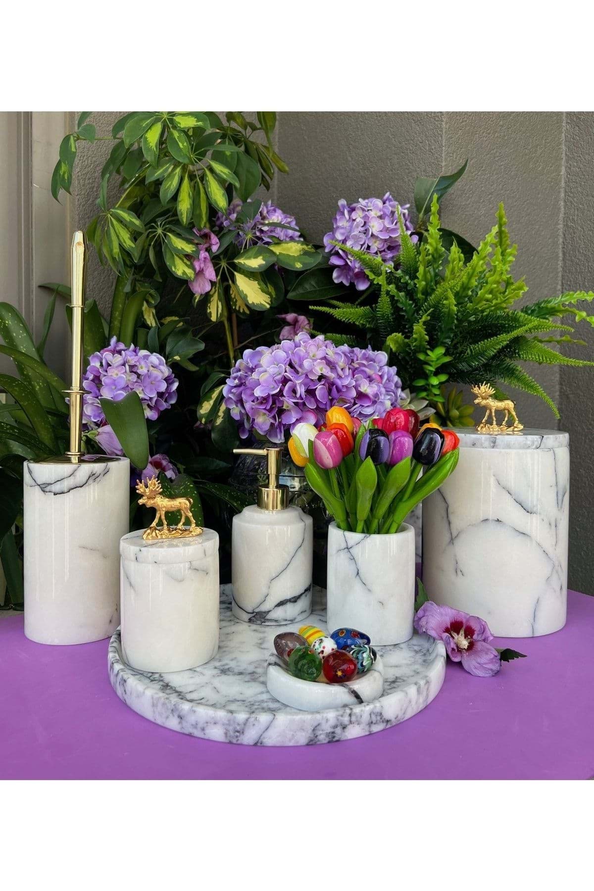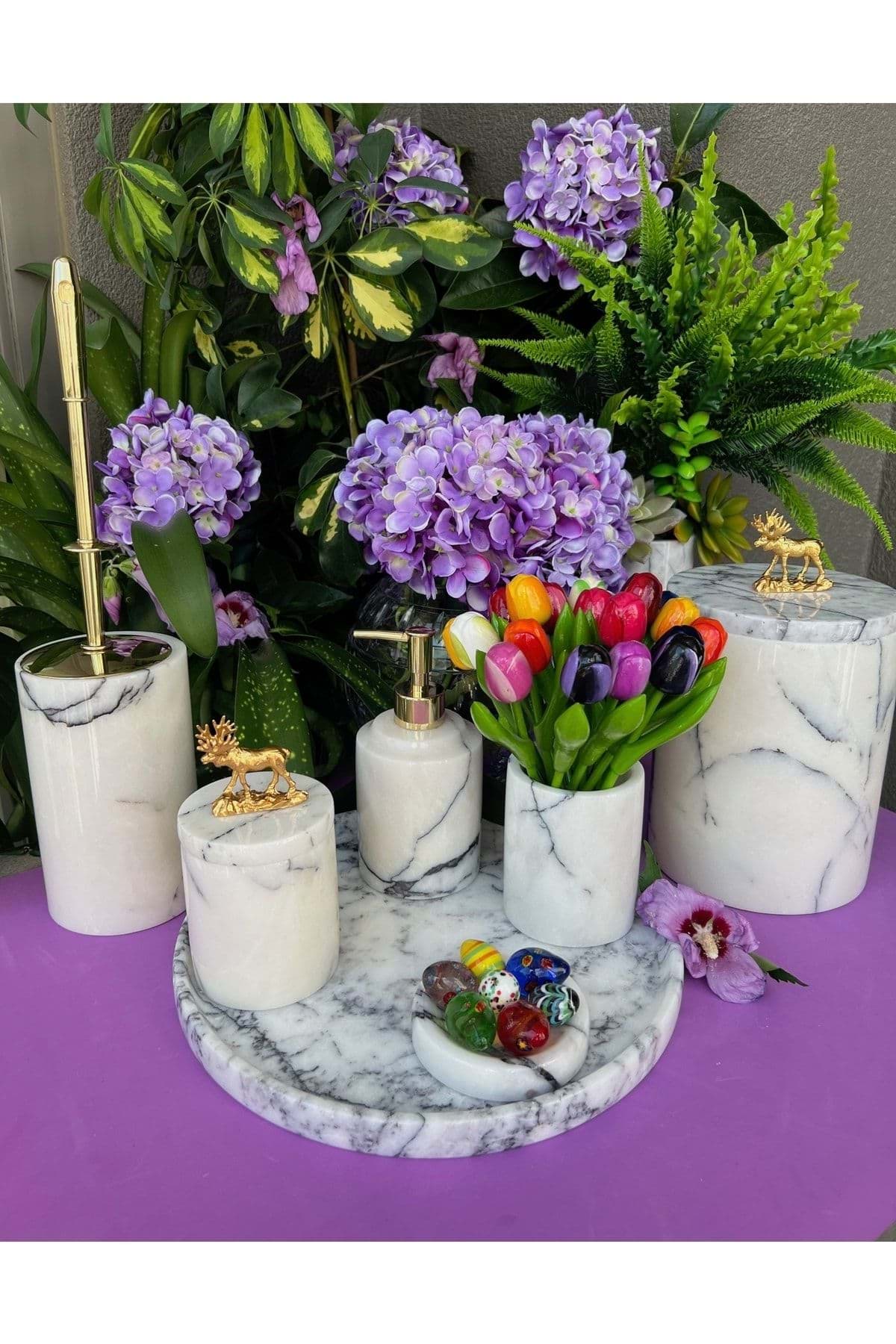 ÜRÜN %100 GERÇEK DOĞAL MERMERDEN ÜRETİLMİŞTİR ; TEPSİ ÇAP 30 CM ; SIVI SABUNLUK ÇAP 8 CM YÜKSEKLİK 11 CM ; KATI SABUNLUK ÇAP 11 CM ; DİŞ FIRÇALIK ÇAP 8 CM YÜKSEKLİK 10 CM ; PAMUKLUK ÇAP 8.5 CM YÜKSEKLİK 11 CM ; TUVALET FIRÇASI ÇAP 10 CM YÜKSEKLİK 15 CM ; ÇÖP KOVASI ÇAP 15 CM YÜKSEKLİK 21 CM ; ÜRÜN LEYLAK BEYAZ RENK VE PİRİNÇ REN GEYİĞİ AKSESUAR DETAYLIDIR. ; GOLD RENK AKSESUAR DETAYLIDIR ;
