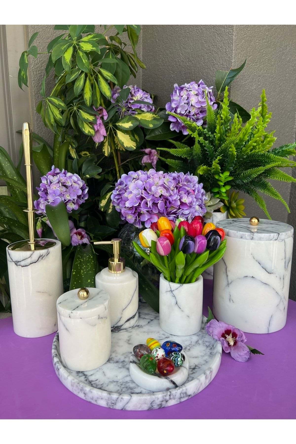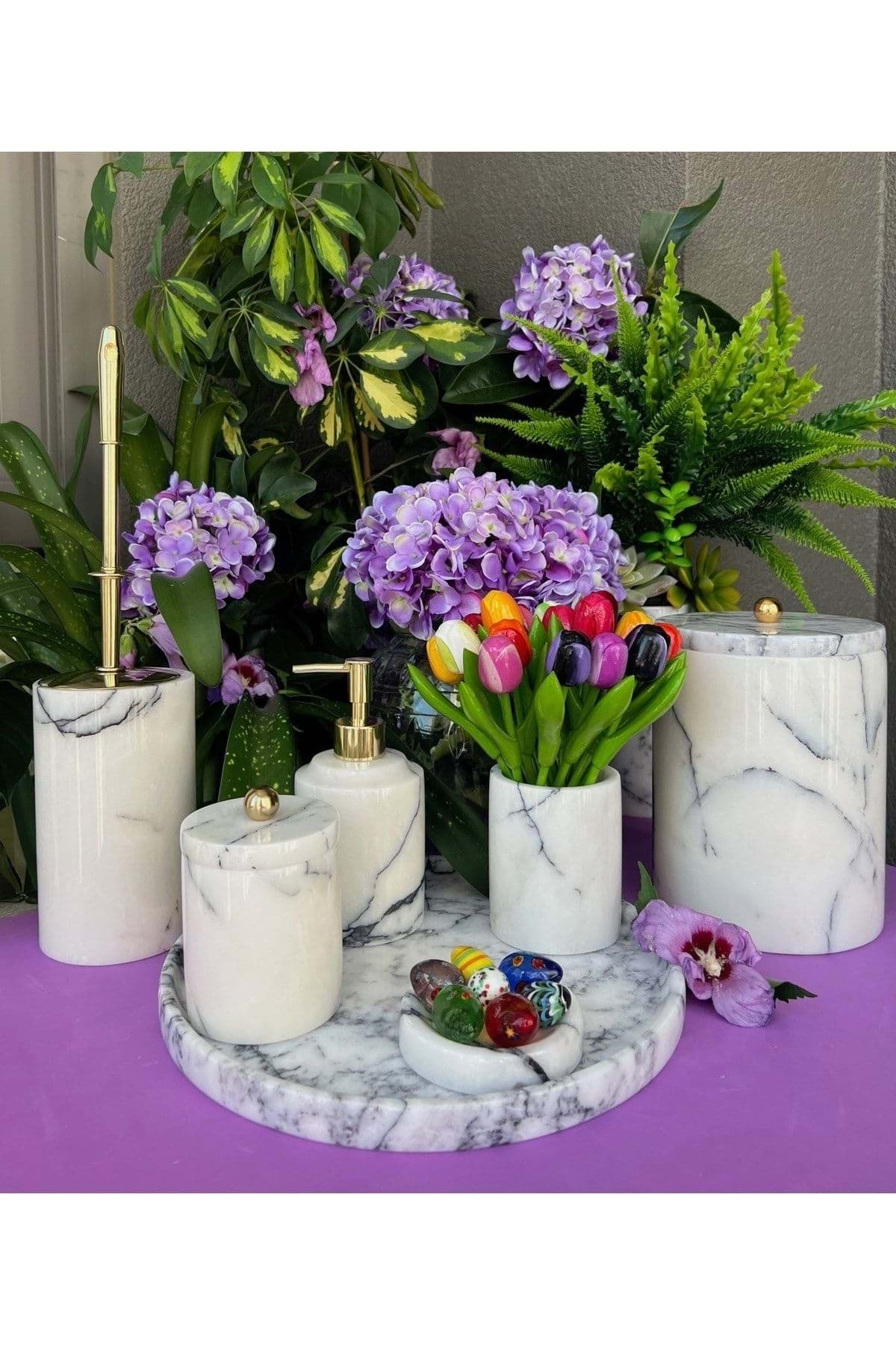 ÜRÜN %100 GERÇEK DOĞAL MERMERDEN ÜRETİLMİŞTİR ; TEPSİ ÇAP 30 CM ; SIVI SABUNLUK ÇAP 8 CM YÜKSEKLİK 11 CM ; KATI SABUNLUK ÇAP 11 CM ; DİŞ FIRÇALIK ÇAP 8 CM YÜKSEKLİK 10 CM ; PAMUKLUK ÇAP 8.5 CM YÜKSEKLİK 11 CM ; TUVALET FIR ÇALIK ÇAP 10 CM Y ÜKSEKLİK 15 CM ; ÇÖP KOVASI ÇAP 15 CM YÜKSEKLİK 21 CM ; ÜRÜN LEYLAK BEYAZ RENK VE PİRİNÇ TOP AKSESUAR DETAYLIDIR. ; GOLD RENK AKSESUAR DETAYLIDIR ;