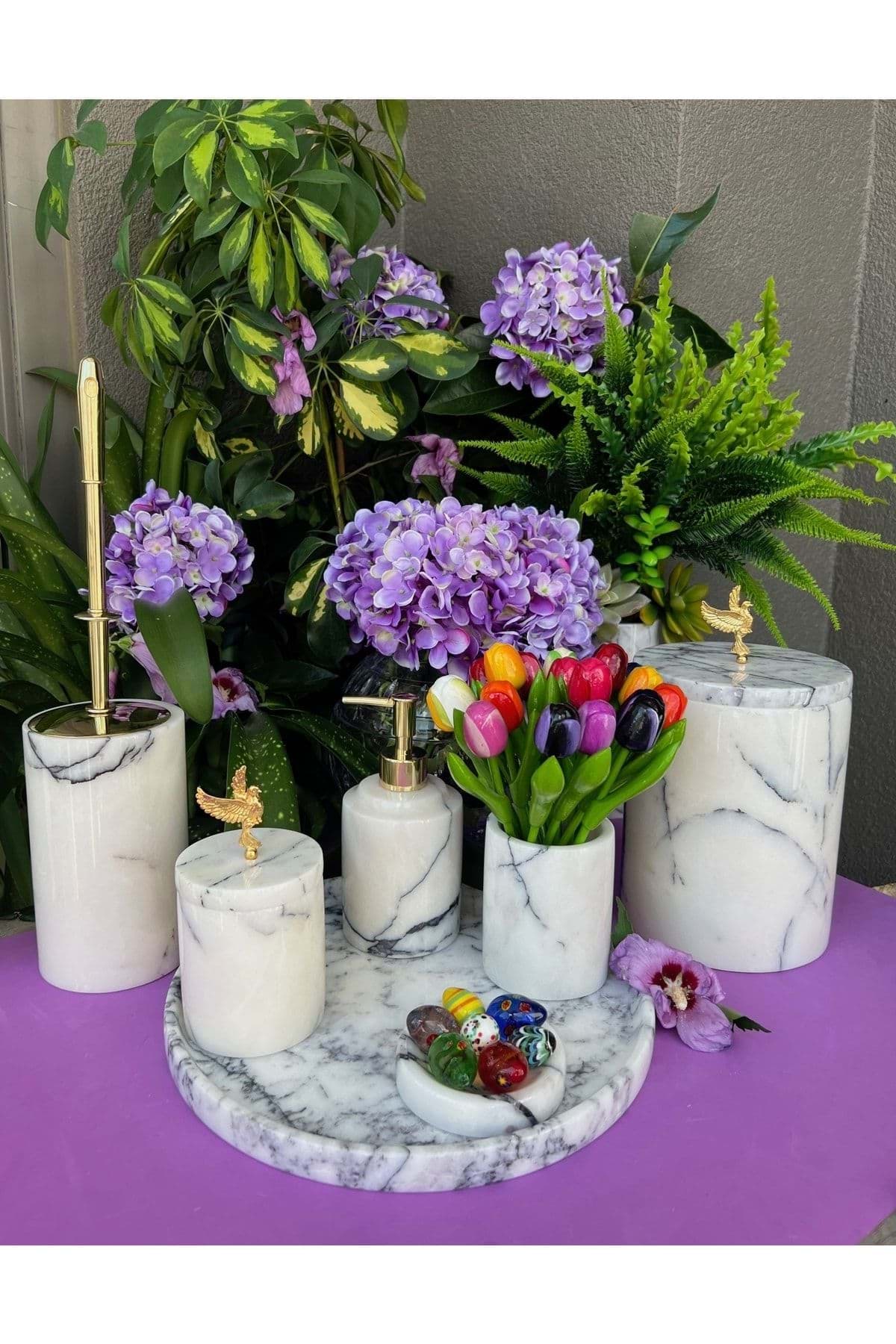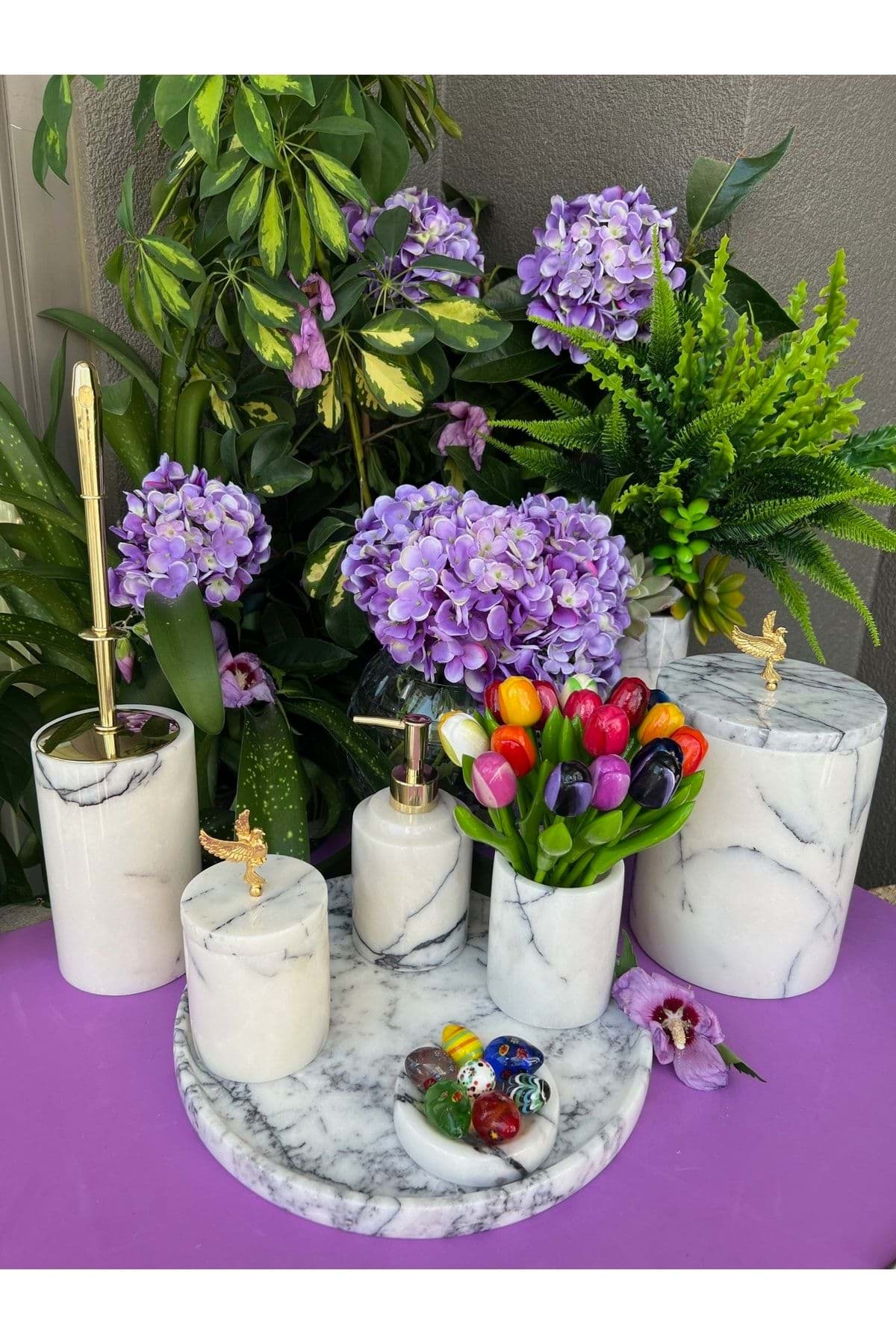 ÜRÜN %100 GERÇEK DOĞAL MERMERDEN ÜRETİLMİŞTİR ; TEPSİ ÇAP 30 CM ; SIVI SABUNLUK ÇAP 8 CM YÜKSEKLİK 11 CM ; KATI SABUNLUK ÇAP 11 CM ; DİŞ FIRÇALIK ÇAP 8 CM YÜKSEKLİK 10 CM ; PAMUKLUK ÇAP 8.5 CM YÜKSEKLİK 11 CM ; TUVALET FIR ÇALIK ÇAP 10 CM Y ÜKSEKLİK 15 CM ; ÇÖP KOVASI ÇAP 15 CM YÜKSEKLİK 21 CM ; ÜRÜN LEYLAK BEYAZ RENK VE PİRİNÇ UÇAN KUŞ AKSESUAR DETAYLIDIR. ; GOLD RENK AKSESUAR DETAYLIDIR ;