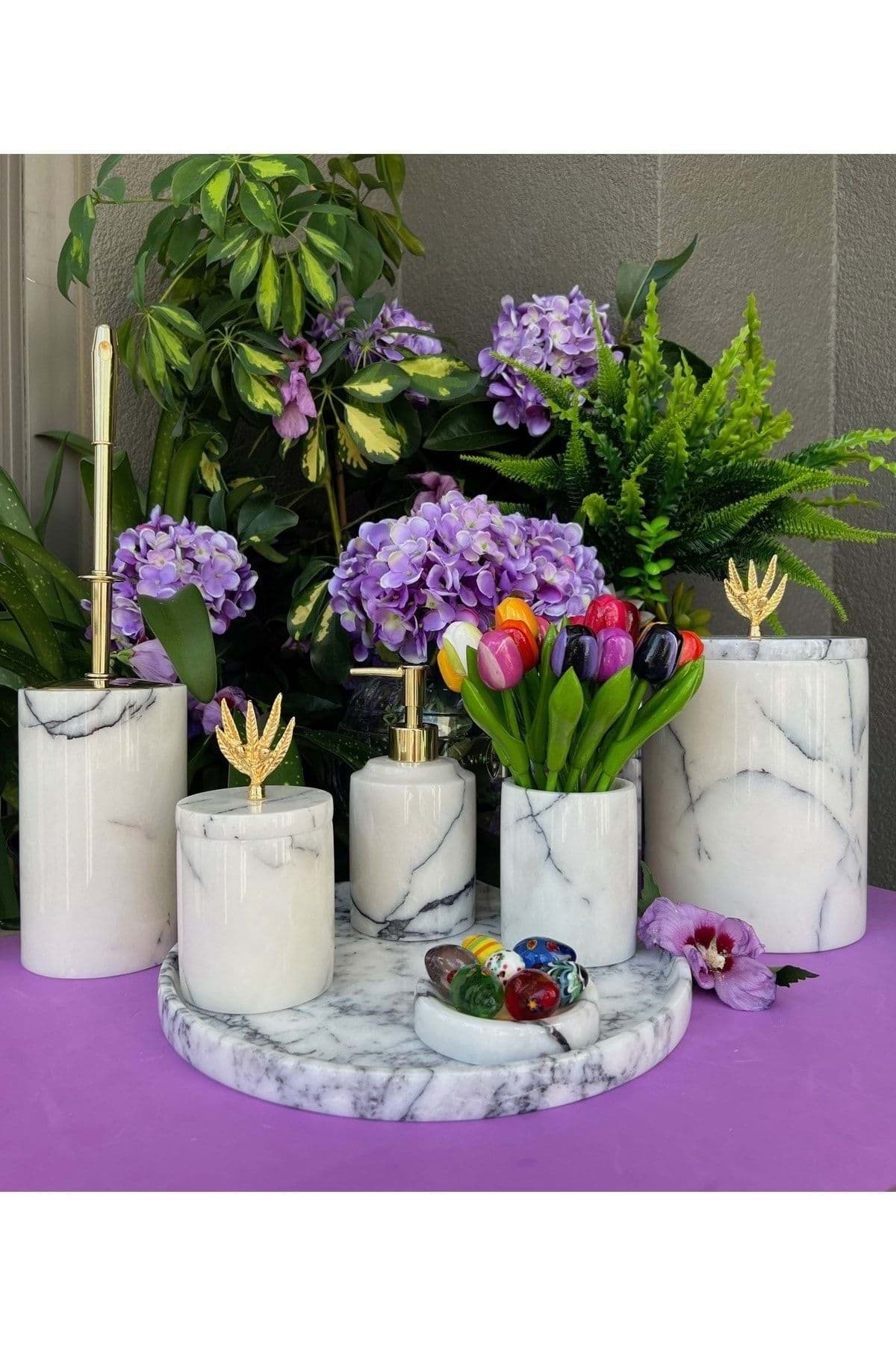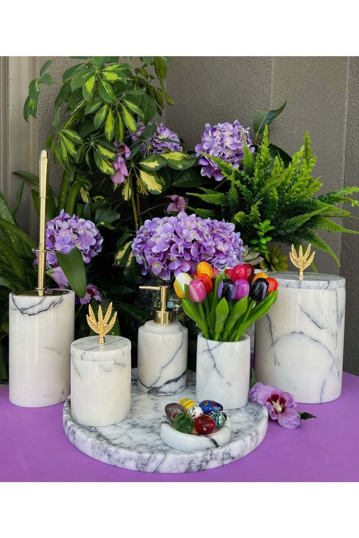 ÜRÜN %100 GERÇEK DOĞAL MERMERDEN ÜRETİLMİŞTİR ; TEPSİ ÇAP 30 CM ; SIVI SABUNLUK ÇAP 8 CM YÜKSEKLİK 11 CM ; KATI SABUNLUK ÇAP 11 CM ; DİŞ FIRÇALIK ÇAP 8 CM YÜKSEKLİK 10 CM ; PAMUKLUK ÇAP 8.5 CM YÜKSEKLİK 11 CM ; TUVALET FIRÇASI ÇAP 10 CM YÜKSEKLİK 15 CM ; ÇÖP KOVASI ÇAP 15 CM YÜKSEKLİK 21 CM ; ÜRÜN LEYLAK BEYAZ RENK VE PİRİNÇ ZEYTİN DALI AKSESUAR DETAYLIDIR. ; GOLD RENK AKSESUAR DETAYLIDIR ;
