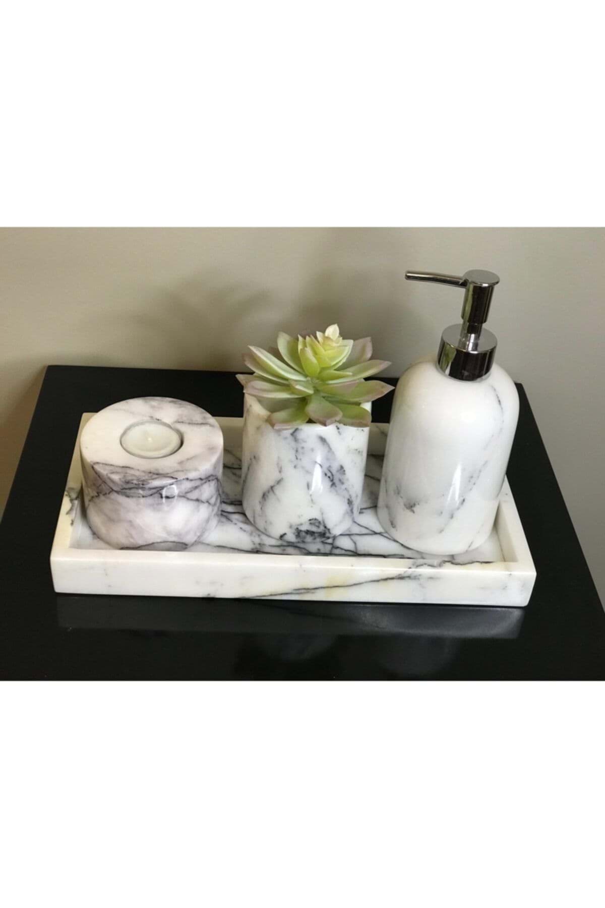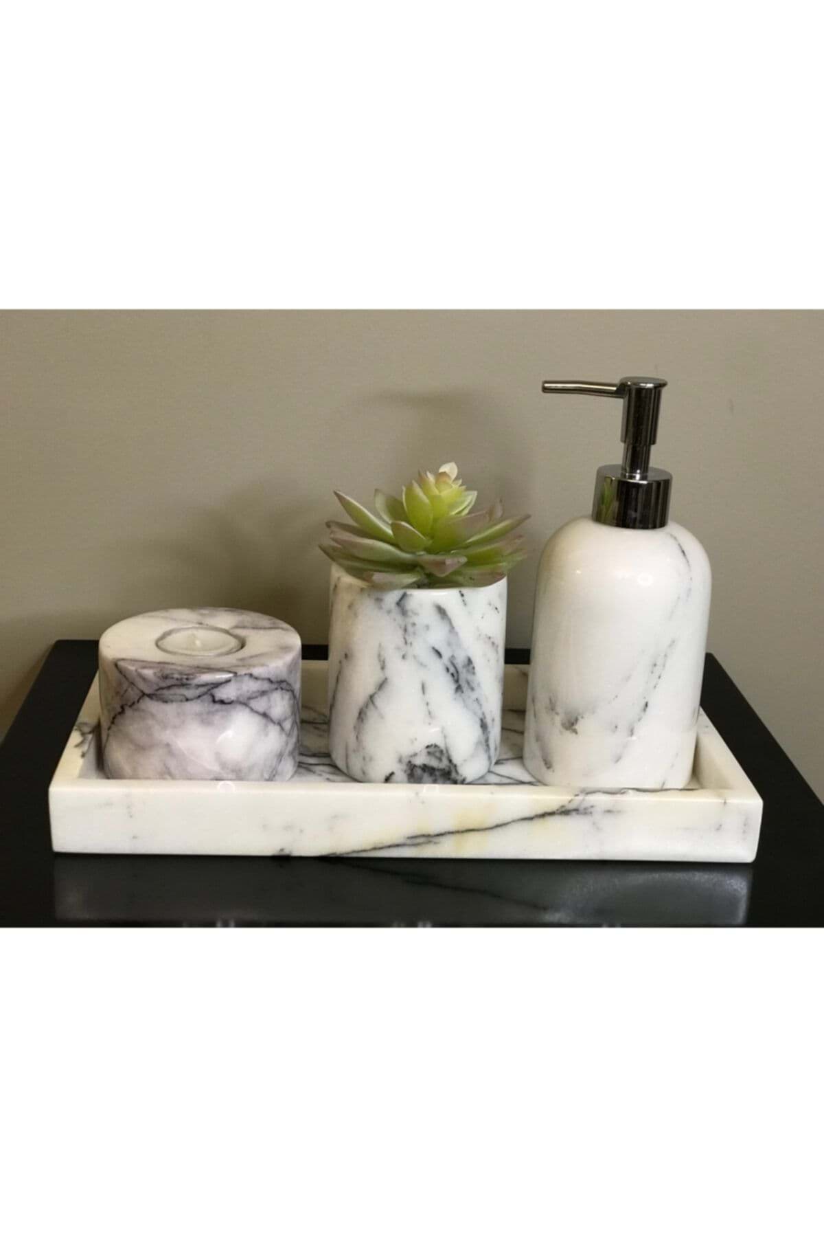 Mermer malzemesi sayesinde uzun ömürlü ve dayanıklı kullanım sunar; Gümüş detaylarla zenginleştirilmiş tasarım, banyonuza modern ve şık bir görünüm kazandırır; 4 parçadan oluşan set, banyo ihtiyaçlarınızı karşılamak için eksiksiz bir çözüm sunar; Dekoratif leylak rengi, banyonuzun atmosferini canlandırarak ferah bir his yaratır;
