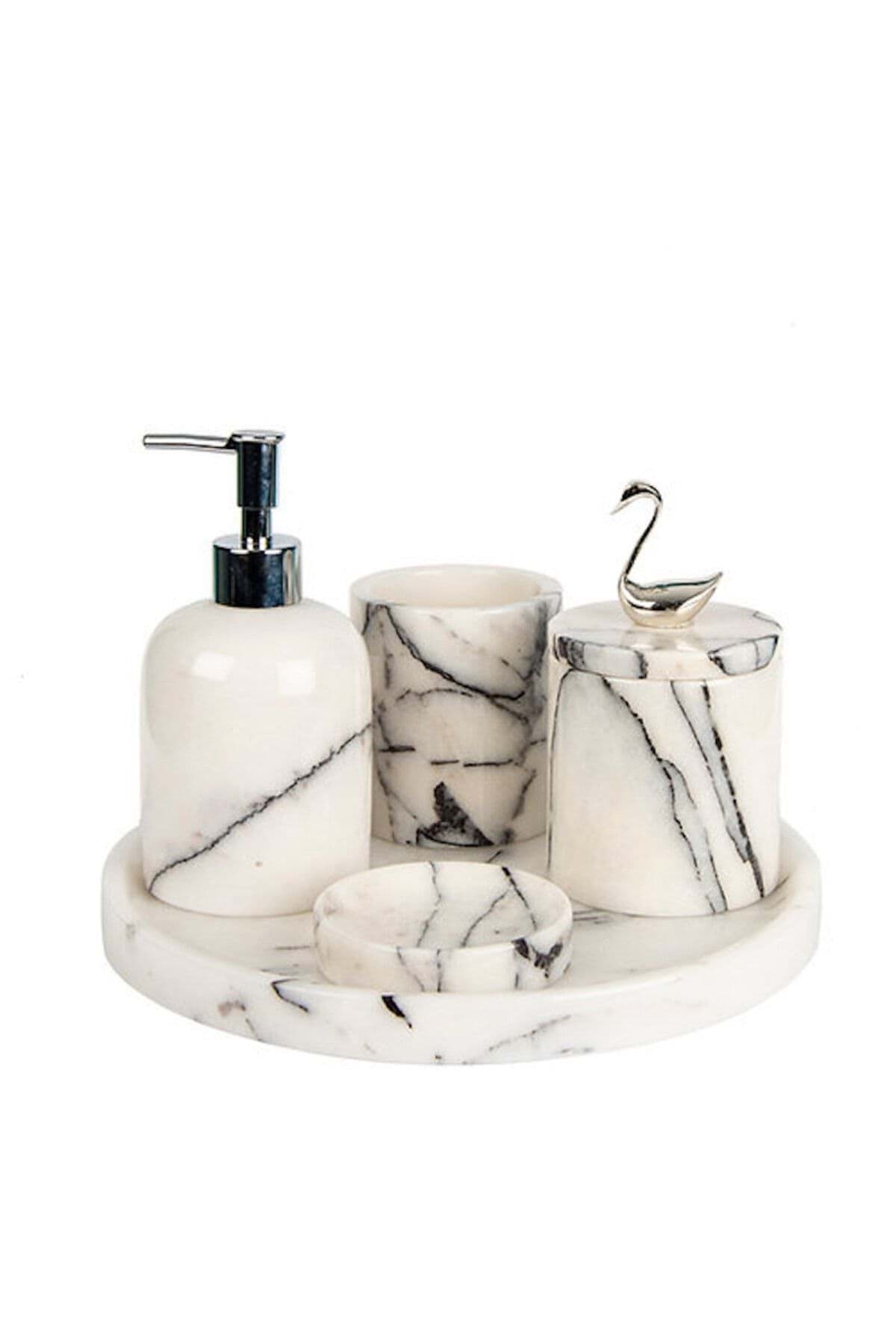 Mermer malzemesi sayesinde uzun ömürlü ve dayanıklı kullanım sunar; Şık ve modern tasarımıyla banyonuza estetik bir dokunuş katar; Gümüş kuş ve kuğu detayları ile zarif bir görünüm sağlar; 5 parçadan oluşan set, banyonuzda ihtiyacınız olan tüm parçaları tek pakette sunar;
