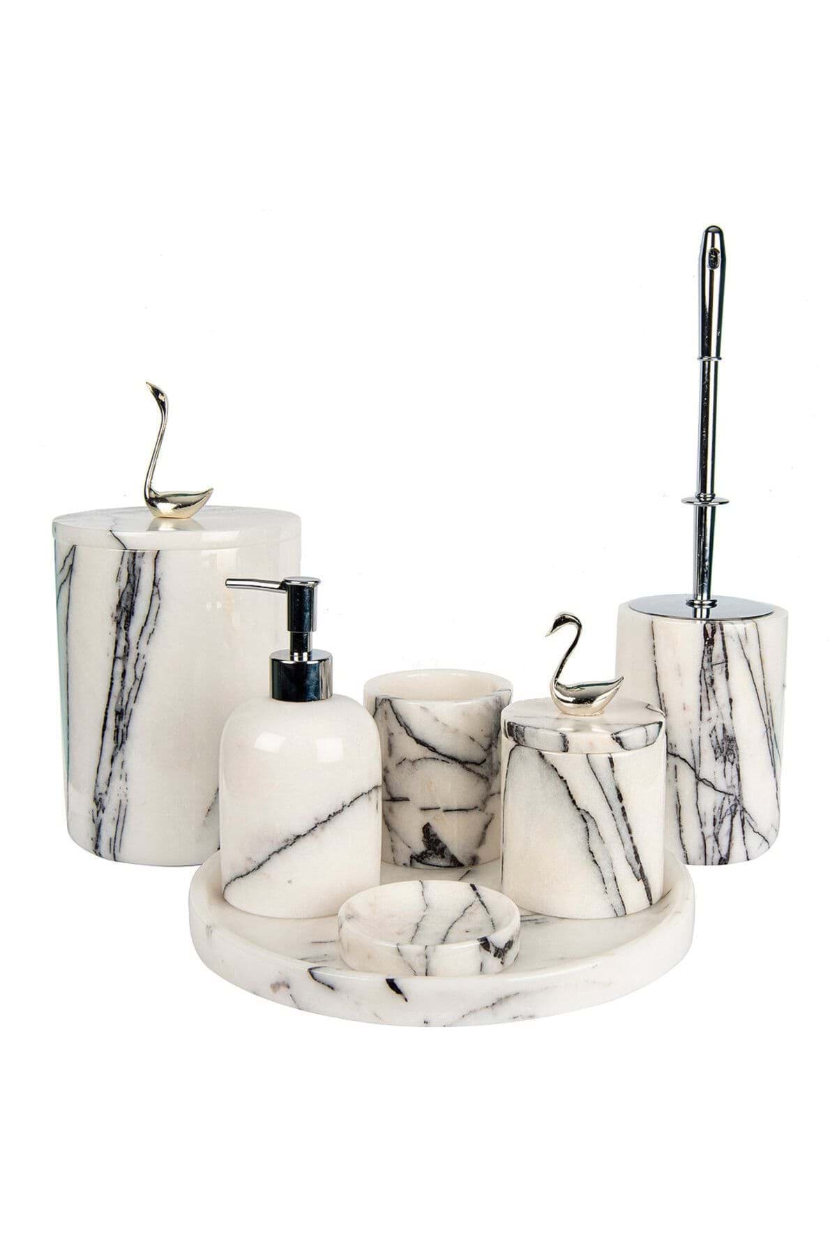 ; ÜRÜN %100 GERÇEK DOĞAL MERMERDEN ÜRETİLMİŞTİR ; ; TEPSİ ÇAP 30 CM ; ; SIVI SABUNLUK ÇAP 8 CM YÜKSEKLİK 11 CM ; ; KATI SABUNLUK ÇAP 11 CM ; ; DİŞ FIRÇALIK ÇAP 8 CM YÜKSEKLİK 10 CM ; ; PAMUKLUK ÇAP 8.5 CM YÜKSEKLİK 11 CM ; ; TUVALET FIR ÇALIK ÇAP 10 CM YÜKSEKLİK 15 CM ; ; ÇÖP KOVASI ÇAP 15 CM Y ÜKSEKLİK 21 CM ; ; ÜRÜN LEYLAK BEYAZ RENK VE PİRİNÇ KUŞ KUĞU AKSESUAR DETAYLIDIR. ; ; ; GÜMÜŞ RENK AKSESUAR DETAYLIDIR ;