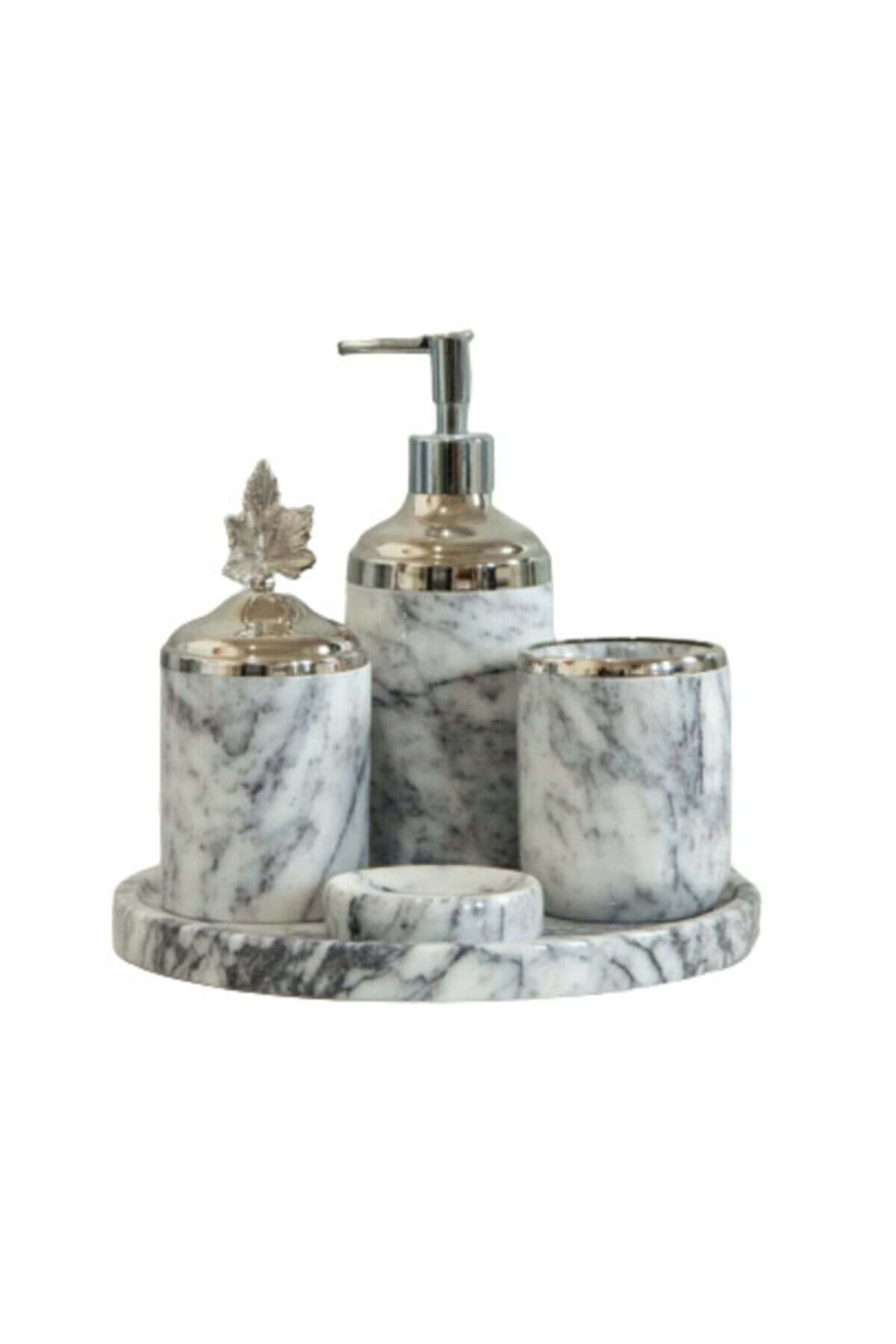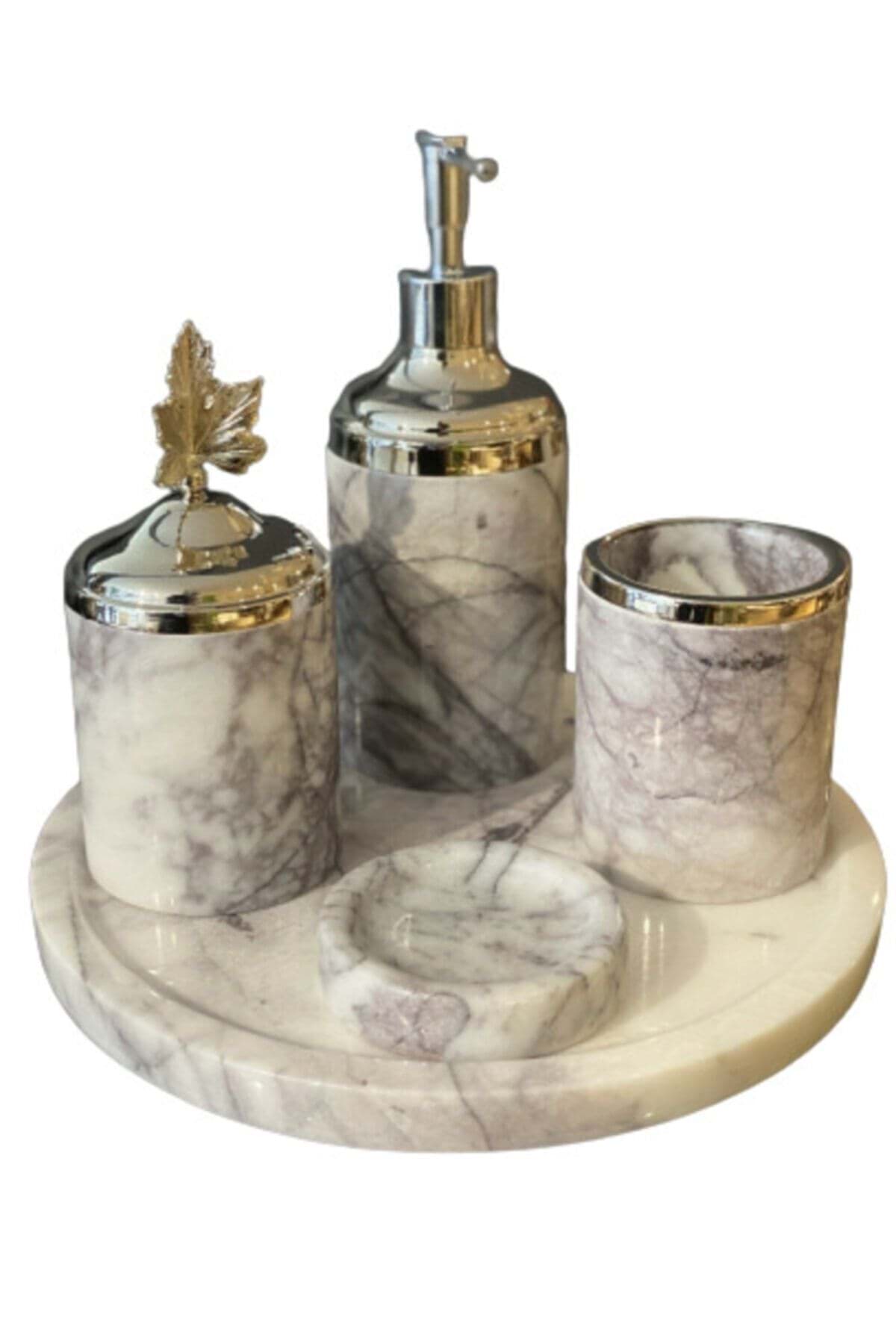 ÜRÜN %100 GER Ç EK DO ĞAL MERMERDEN ÜRETİLMİ Ş TİR. ; TEPSİ ÇAP 30 CM ; SIVI SABUNLUK ÇAP 8 CM Y ÜKSEKLİK 11 CM ; KATI SABUNLUK ÇAP 11 CM ; D İ Ş FIRÇALIK ÇAP 8 CM Y ÜKSEKLİK 10 CM ; PAMUKLUK ÇAP 8.5 CM Y ÜKSEKLİK 11 CM ; ÜRÜN LEYLAK RENK VE PİRİN Ç YAPRAK AKSESUAR DETAYLIDIR. ; GÜMÜŞ RENK AKSESUAR DETAYLIDIR ;