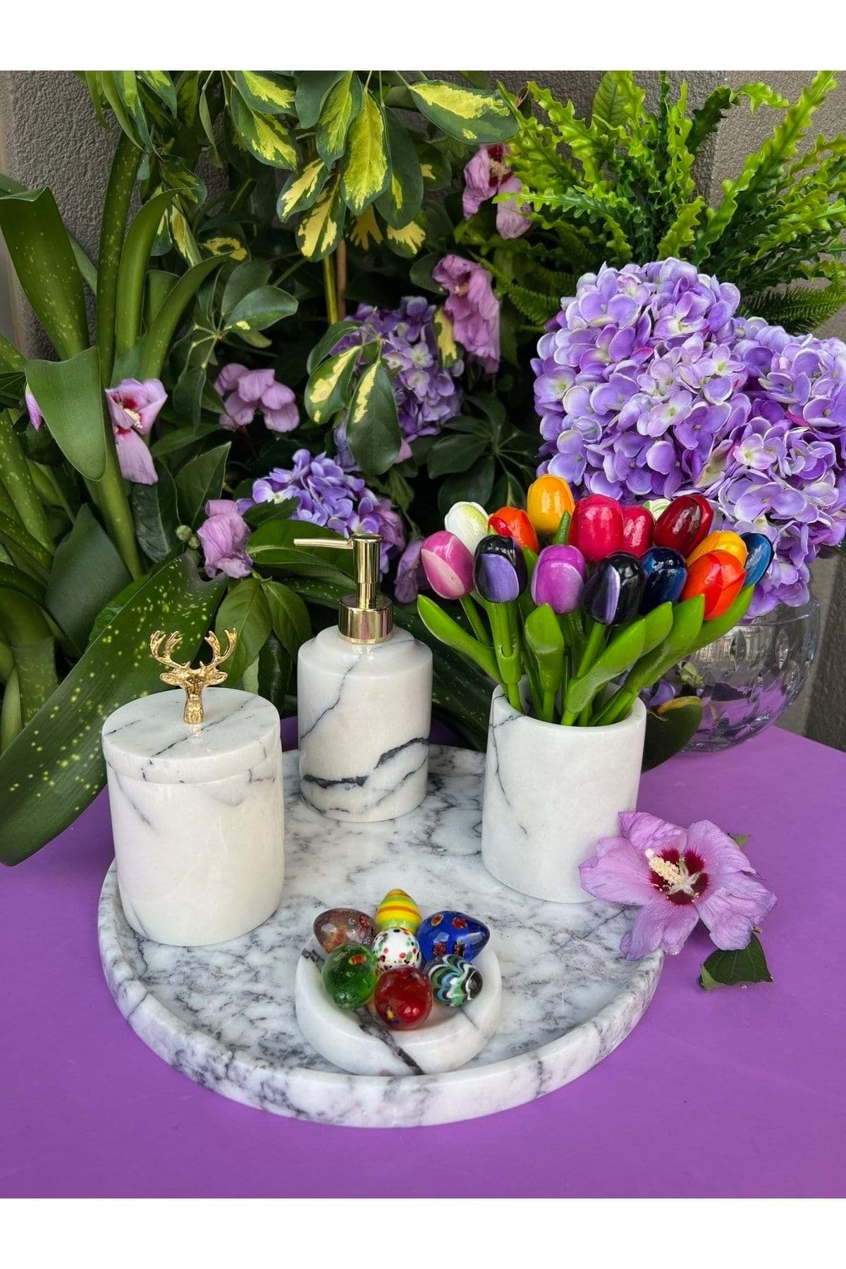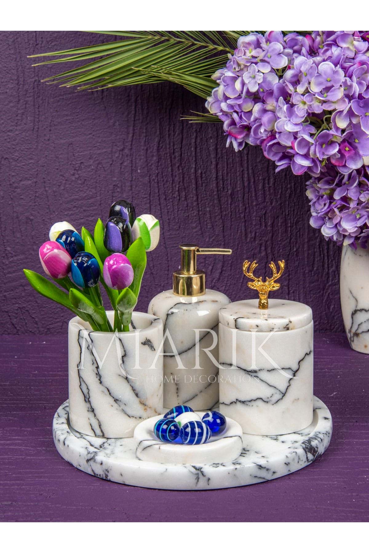 ÜRÜN %100 GERÇEK DOĞAL MERMERDEN ÜRETİLMİŞTİR ; TEPSİ ÇAP 30 CM ; SIVI SABUNLUK ÇAP 8 CM Y ÜKSEKLİK 11 CM ; KATI SABUNLUK ÇAP 11 CM ; DİŞ FIRÇALIK ÇAP 8 CM Y ÜKSEKLİK 10 CM ; PAMUKLUK ÇAP 8.5 CM YÜKSEKLİK 11 CM ; ÜRÜN LEYLAK RENK VE PİRİNÇ GEYIK AKSESUAR DETAYLIDIR. ; GOLD RENK AKSESUAR DETAYLIDIR ;