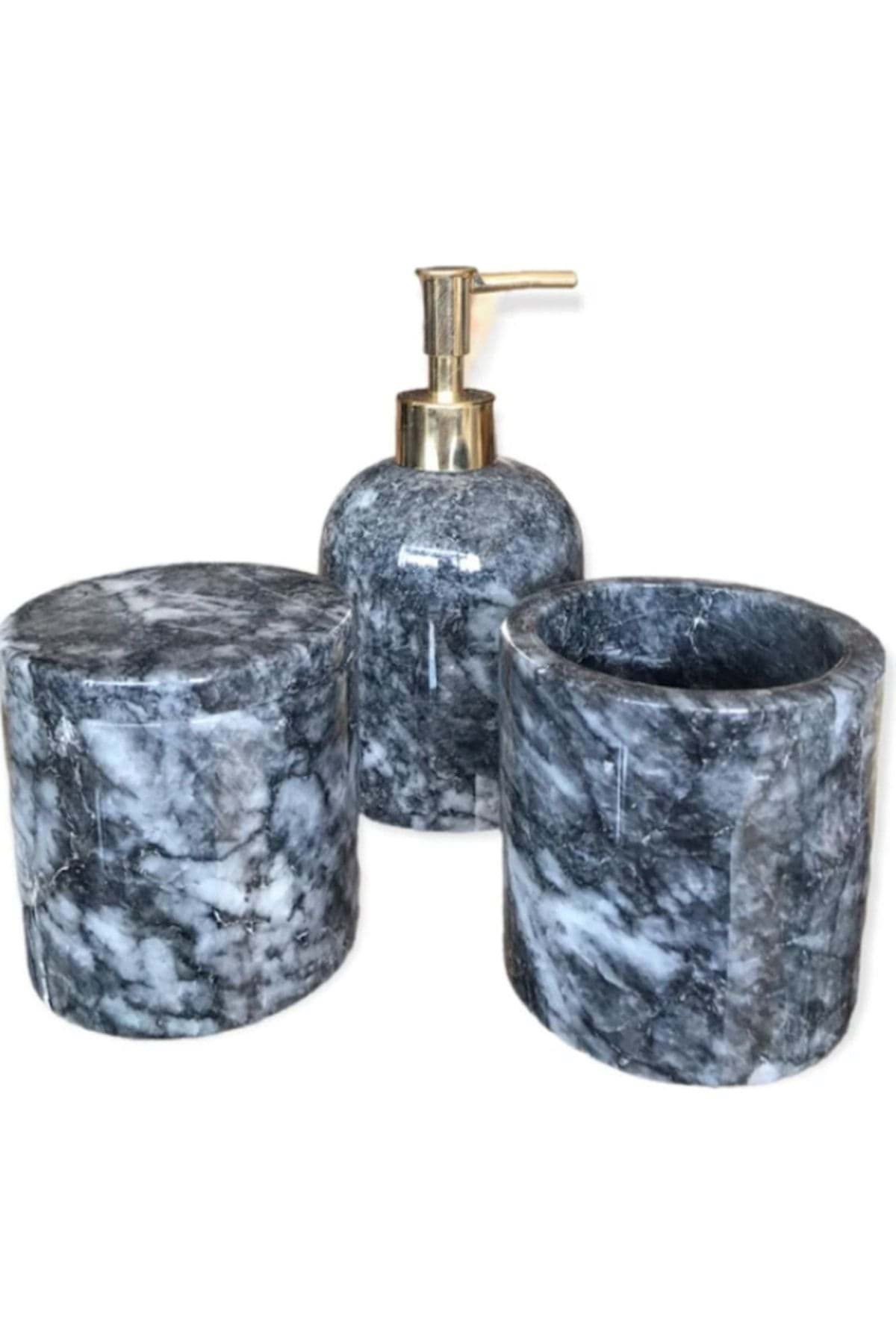 ÜRÜN %100 GERÇEK DOĞAL MERMERDEN ÜRETİLMİŞTİR. ; TEPSİ ÇAP 28 CM ; SIVI SABUNLUK ÇAP 8 CM YÜKSEKLİK 11 CM ; KATI SABUNLUK ÇAP 11 CM ; DİŞ FIRÇALIK ÇAP 8 CM YÜKSEKLİK 10 CM ; PAMUKLUK ÇAP 8.5 CM YÜKSEKLİK 11 CM ; ÜRÜN BEYAZ RENK VE PİRİNÇ AKSESUAR DETAYLIDIR. ;
