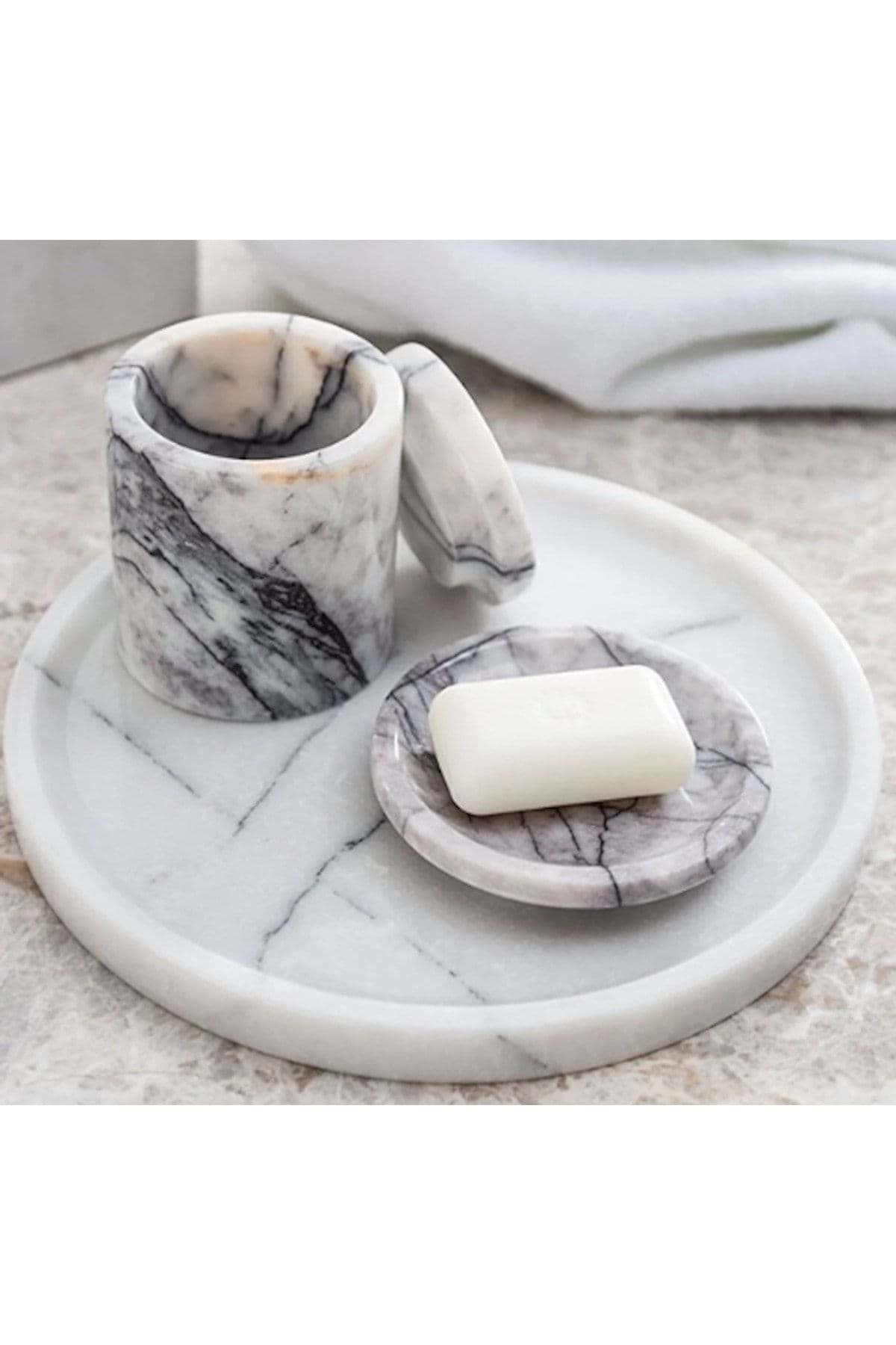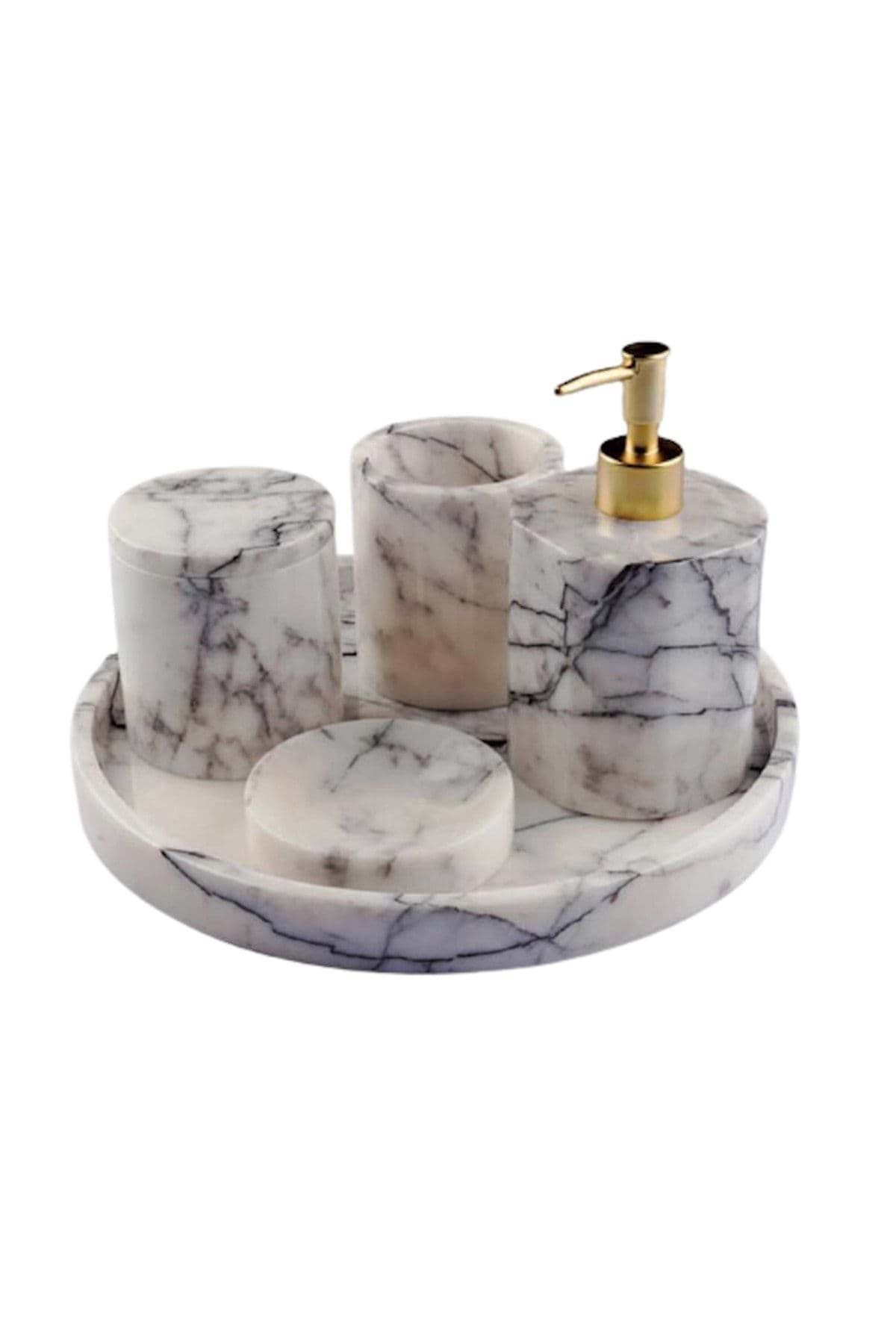ÜRÜN %100 GERÇEK DOĞAL MERMERDEN ÜRETİLMİŞTİR. ; TEPSİ ÇAP 28 CM ; SIVI SABUNLUK ÇAP 8 CM YÜKSEKLİK 11 CM ; KATI SABUNLUK ÇAP 11 CM ; DİŞ FIRÇALIK ÇAP 8 CM YÜKSEKLİK 10 CM ; PAMUKLUK ÇAP 8.5 CM YÜKSEKLİK 11 CM ; ÜRÜN BEYAZ RENK VE PİRİNÇ AKSESUAR DETAYLIDIR. ;